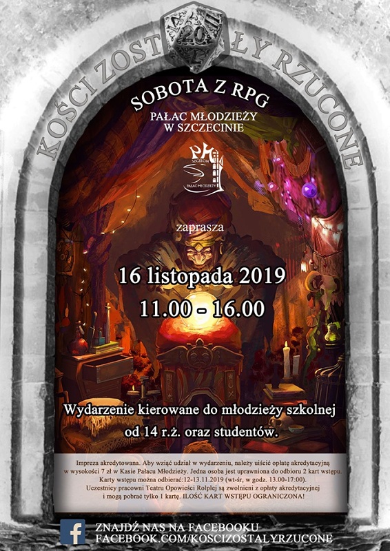 Kolejna dawka sesji przed nami. Listopad nastraja do halloweenowo-andrzejkowych tematów, wobec czego przybądźcie, by zmierzyć się z Przeznaczeniem, Losem, klątwami czy skorzystać z błogosławieństwa Sił Wyższych. Pozwólcie fikcyjnym Bohaterom ożyć przy pałacowych stołach i zająć należne im miejsce w opowiadanych przez Was historiach. Bogowie tylko czekają na Wasze decyzje, by albo wybuchnąć śmiechem, albo w zadumie przyznać Wam rację. Zapraszamy serdecznie na „Kości”, które odbędą się już 16 listopada!