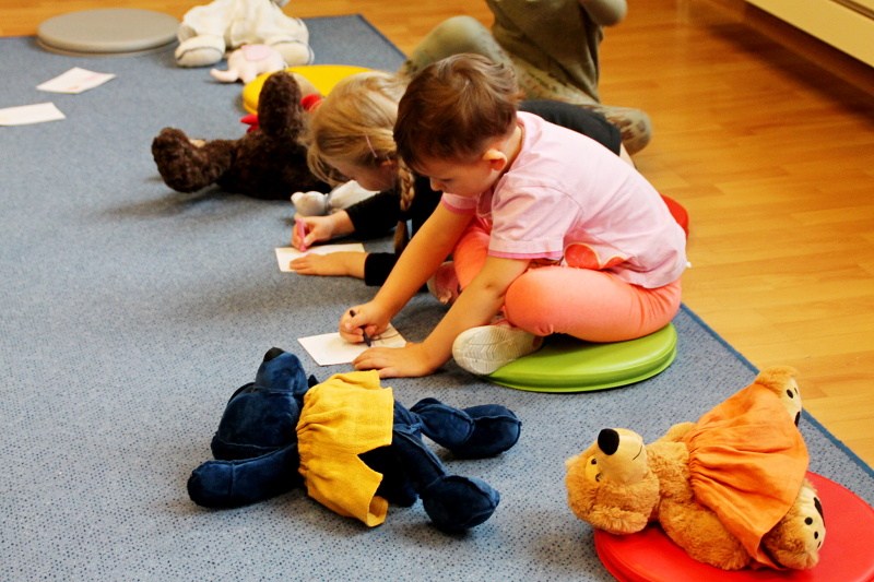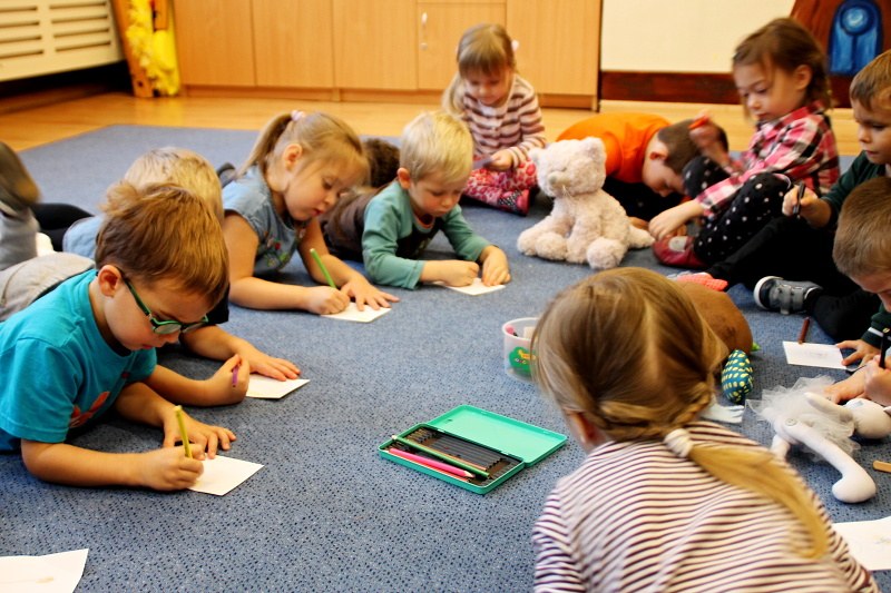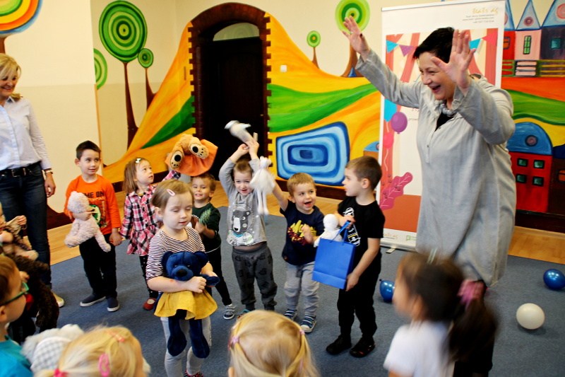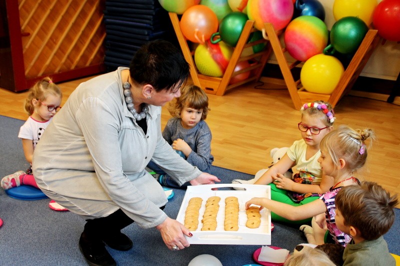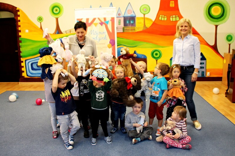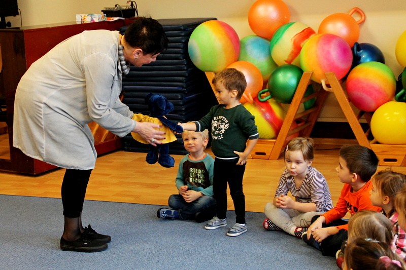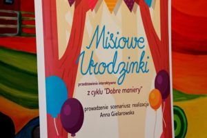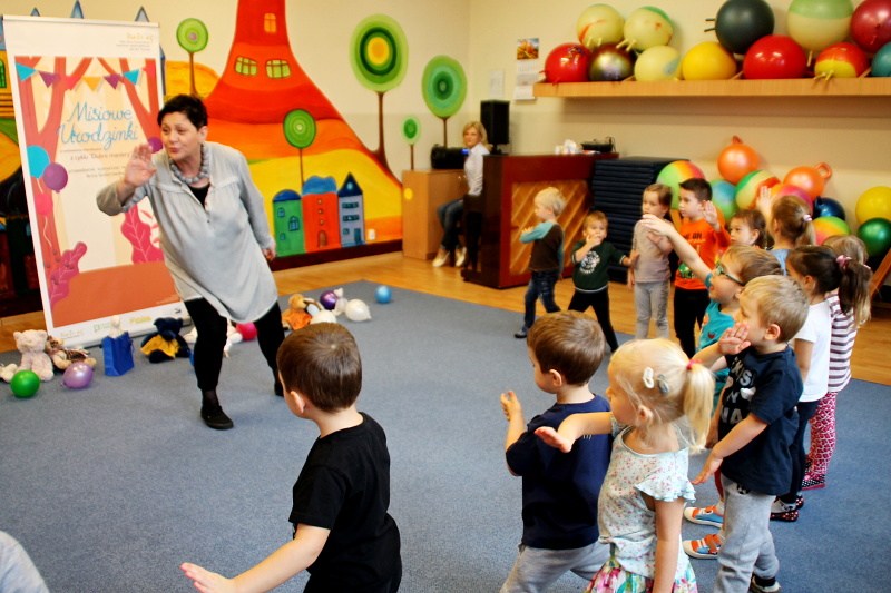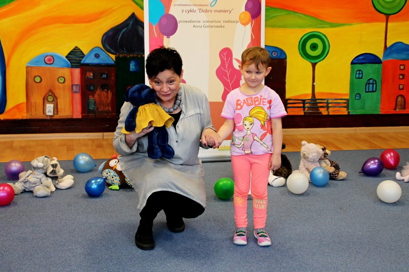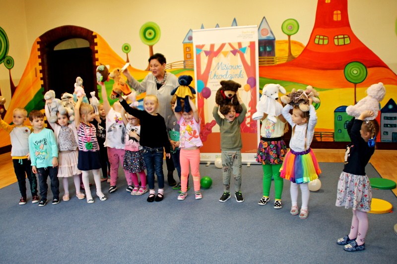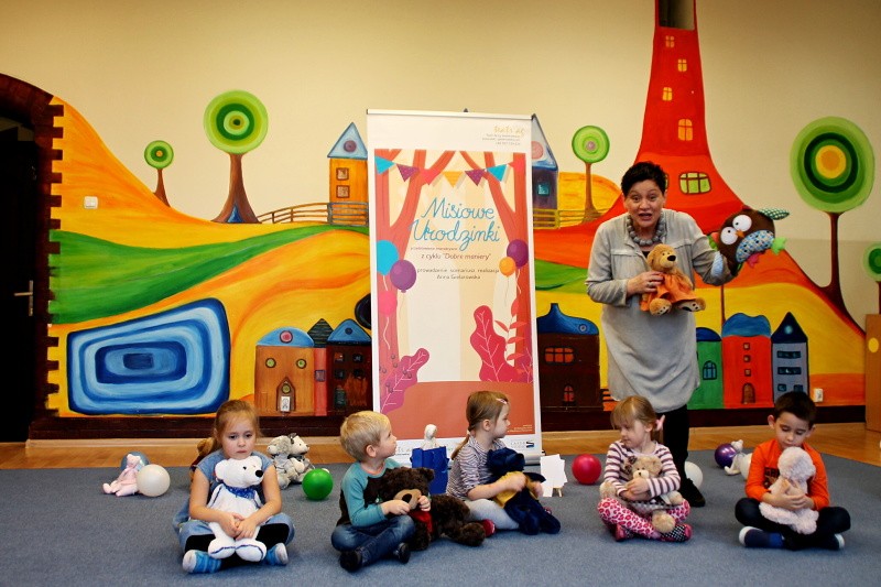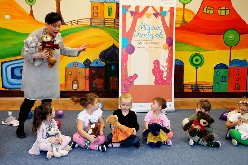 W czwartek pałacowe przedszkolaki wzięły udział w przedstawieniu „Misiowe urodzinki” Teatru Anny Gielarowskiej. Przedstawienie interaktywne z cyklu „Dobre maniery” było okazją do nauczenia przedszkolaków jak należy się zachowywać podczas przyjęć i spotkań. Dzieci z wielką radością świętowały urodziny Misi Ani. Każde z nich miało pod opieką swojego pluszowego „gościa”. Podczas spotkania przedszkolaki przygotowały jubilatce laurki i zjadły pyszne ciastka upieczone przez mamę Misi Ani.