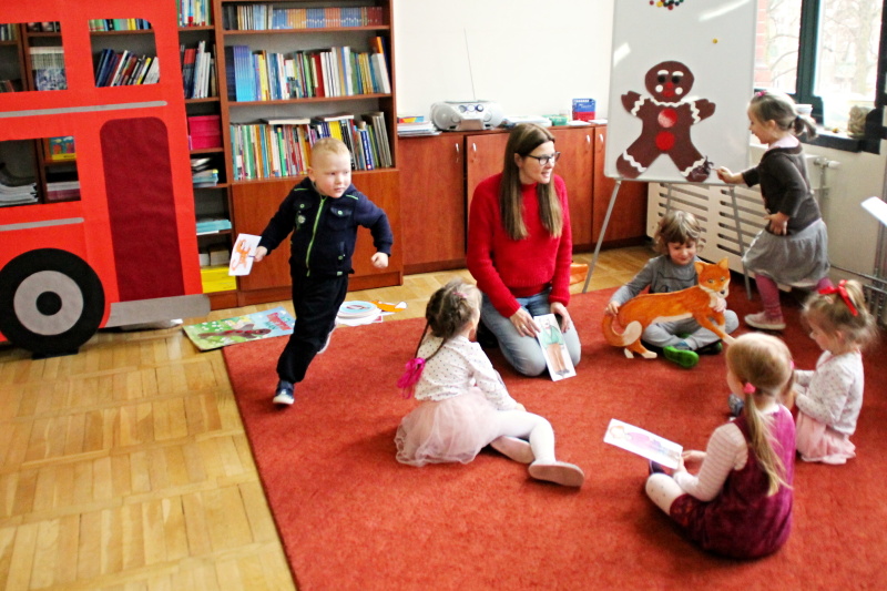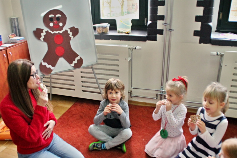 We wtorek, w trakcie zajęć z języka angielskiego przedszkolaki wysłuchały opowiadania przeczytanego przez p. Anię Kozłowską. Była to historia o pewnym piernikowym ciastku, które uciekło z pieca…Ta zabawna książka była okazją do powtórzenia słów związanych z częściami ciała, kolorami, liczeniem i składnikami które potrzebne są do pieczenia pierniczków. Na zakończenie dzieci ze smakiem zjadły piernikowe ciasteczka.