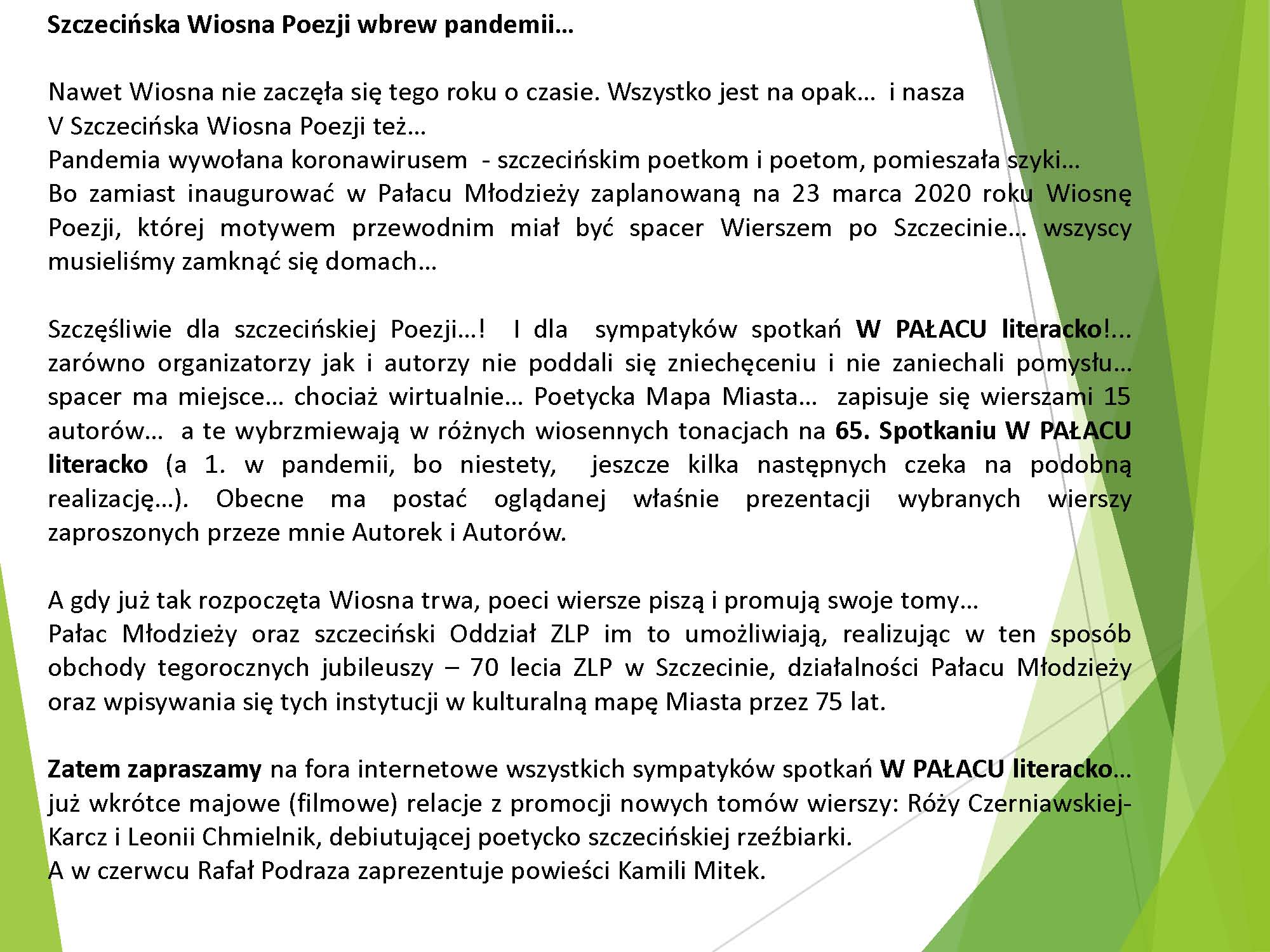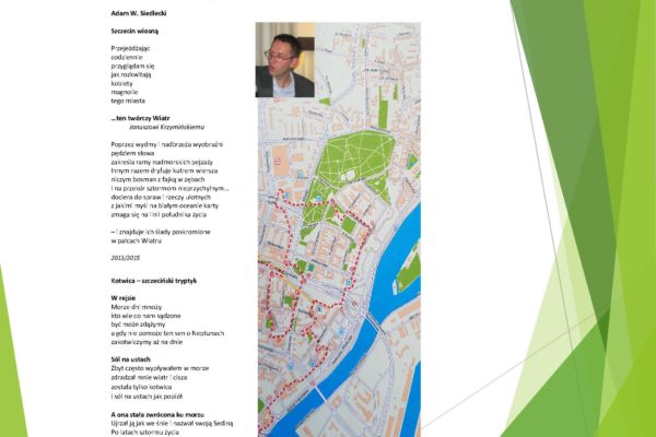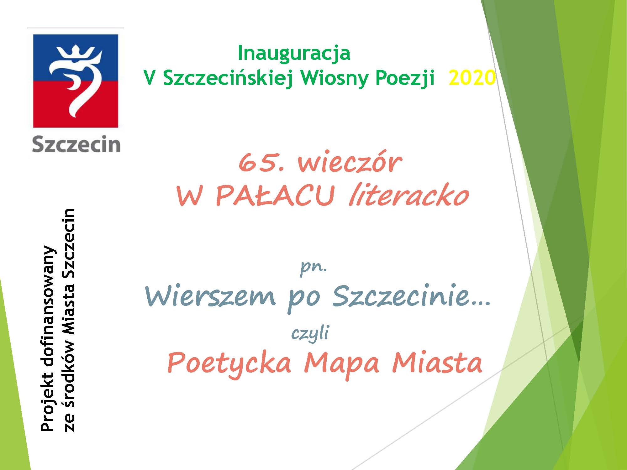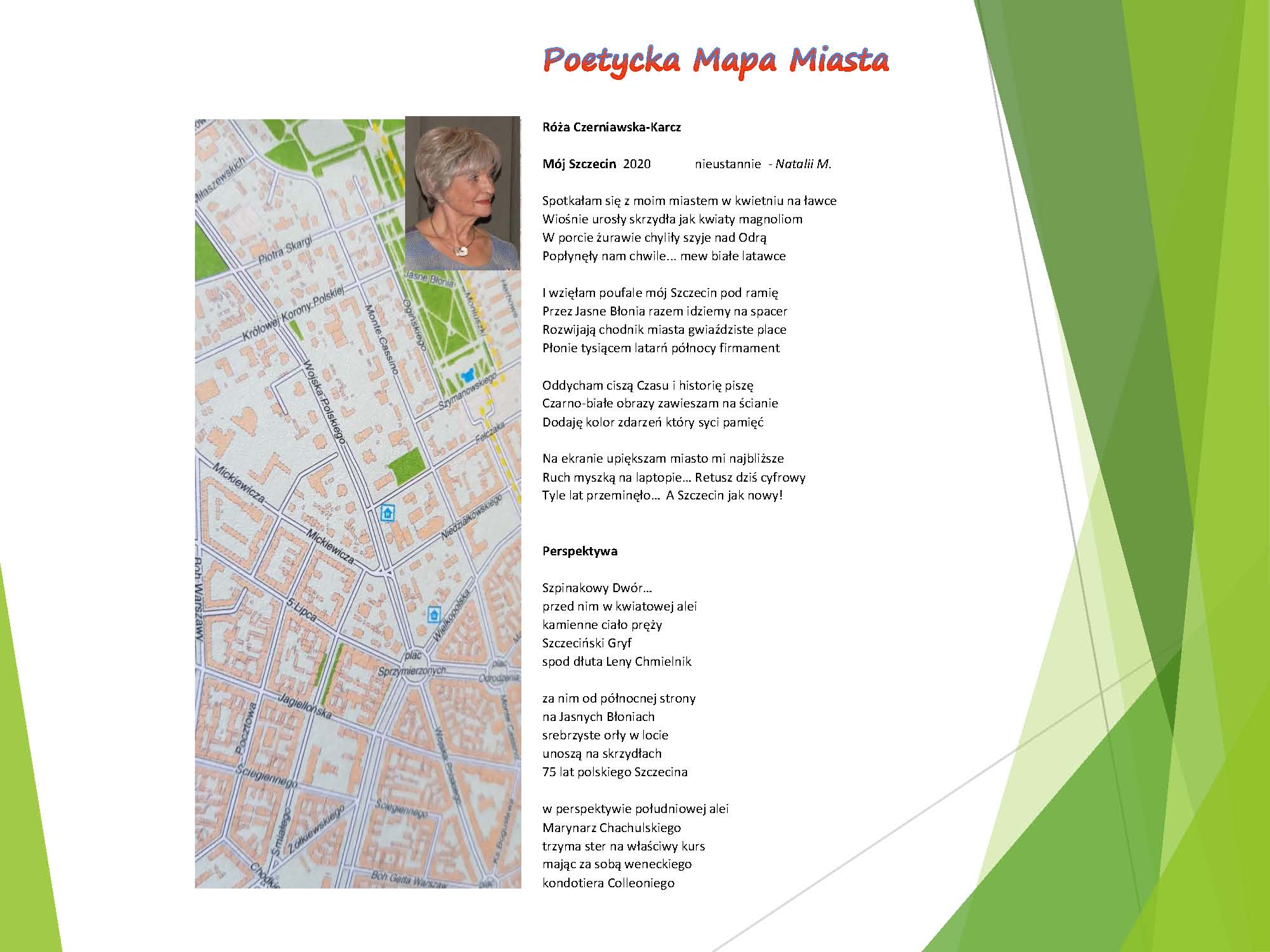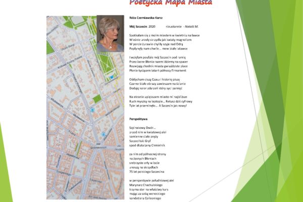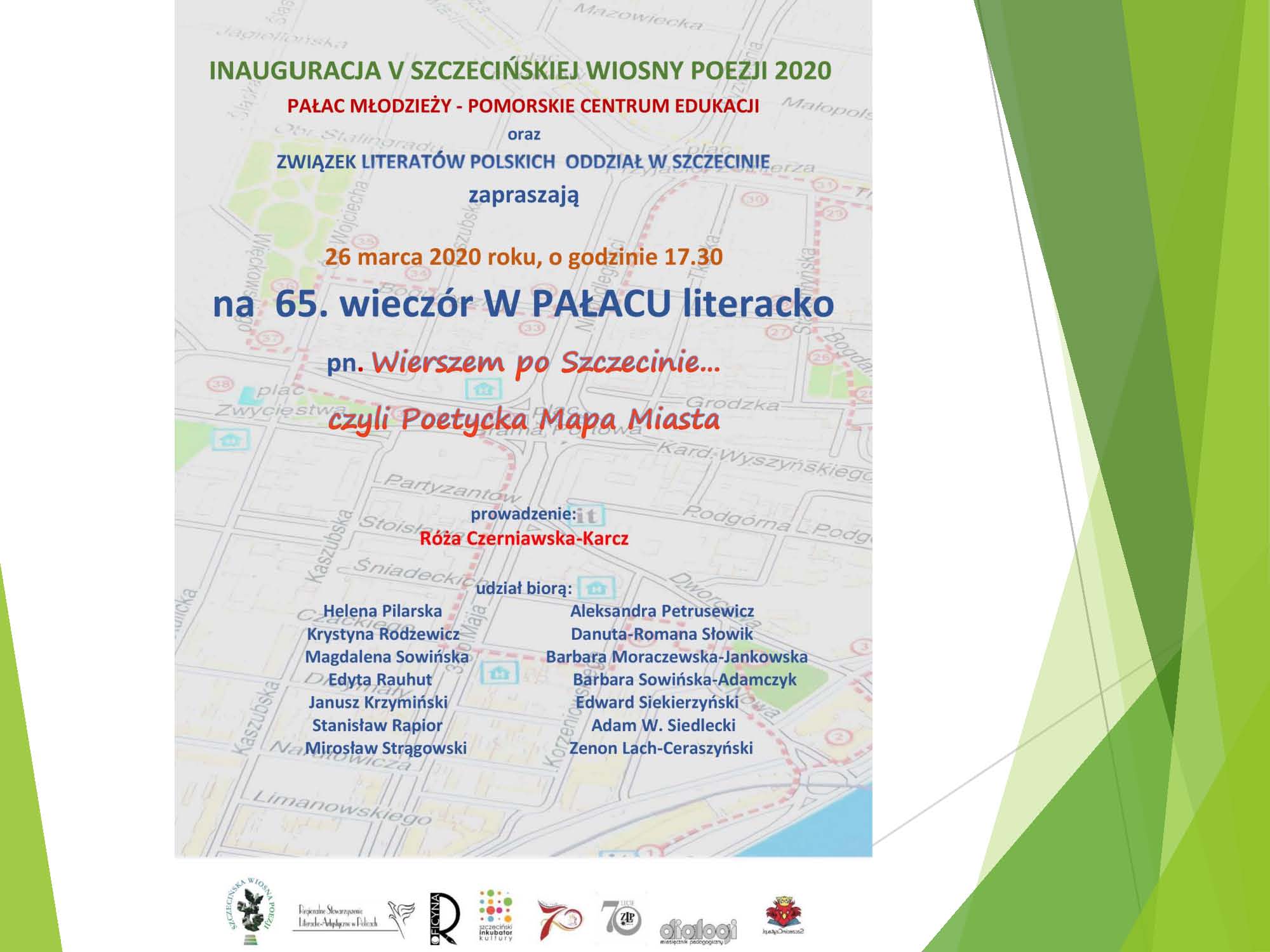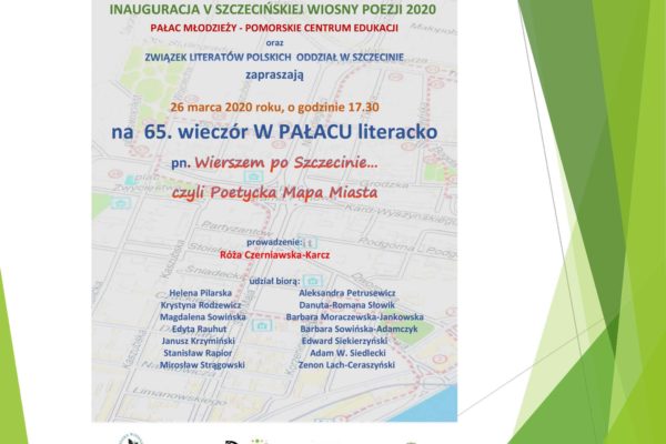 Szczęśliwie dla szczecińskiej Poezji…! I dla sympatyków spotkań W PAŁACU literacko!… zarówno organizatorzy jak i autorzy nie poddali się zniechęceniu i nie zaniechali pomysłu… spacer ma miejsce… chociaż wirtualnie… Poetycka Mapa Miasta… zapisuje się wierszami 15 autorów… a te wybrzmiewają w różnych wiosennych tonacjach na 65. Spotkaniu W PAŁACU literacko (a 1. w pandemii, bo niestety, jeszcze kilka następnych czeka na podobną realizację…). Obecne ma postać prezentacji wybranych wierszy zaproszonych przeze mnie Autorek: Heleny Pilarskiej, Aleksandry Petrusewicz, Krystyny Rodzewicz, Danuty-Romany Słowik, Magdaleny Sowińskiej, Barbary Moraczewskiej- Jankowskiej, Edyty Rauhut, Barbary Sowińskiej-Adamczyk (także piszącej te słowa – Róży Czerniawskiej-Karcz) i Autorów: Janusza Krzymińskiego, Edwarda Siekierzyńskiego, Zenona Lacha-Ceraszyńskiego, Mirosława Strągowskiego, Stanisława Rapiora oraz Adama W. Siedleckiego.