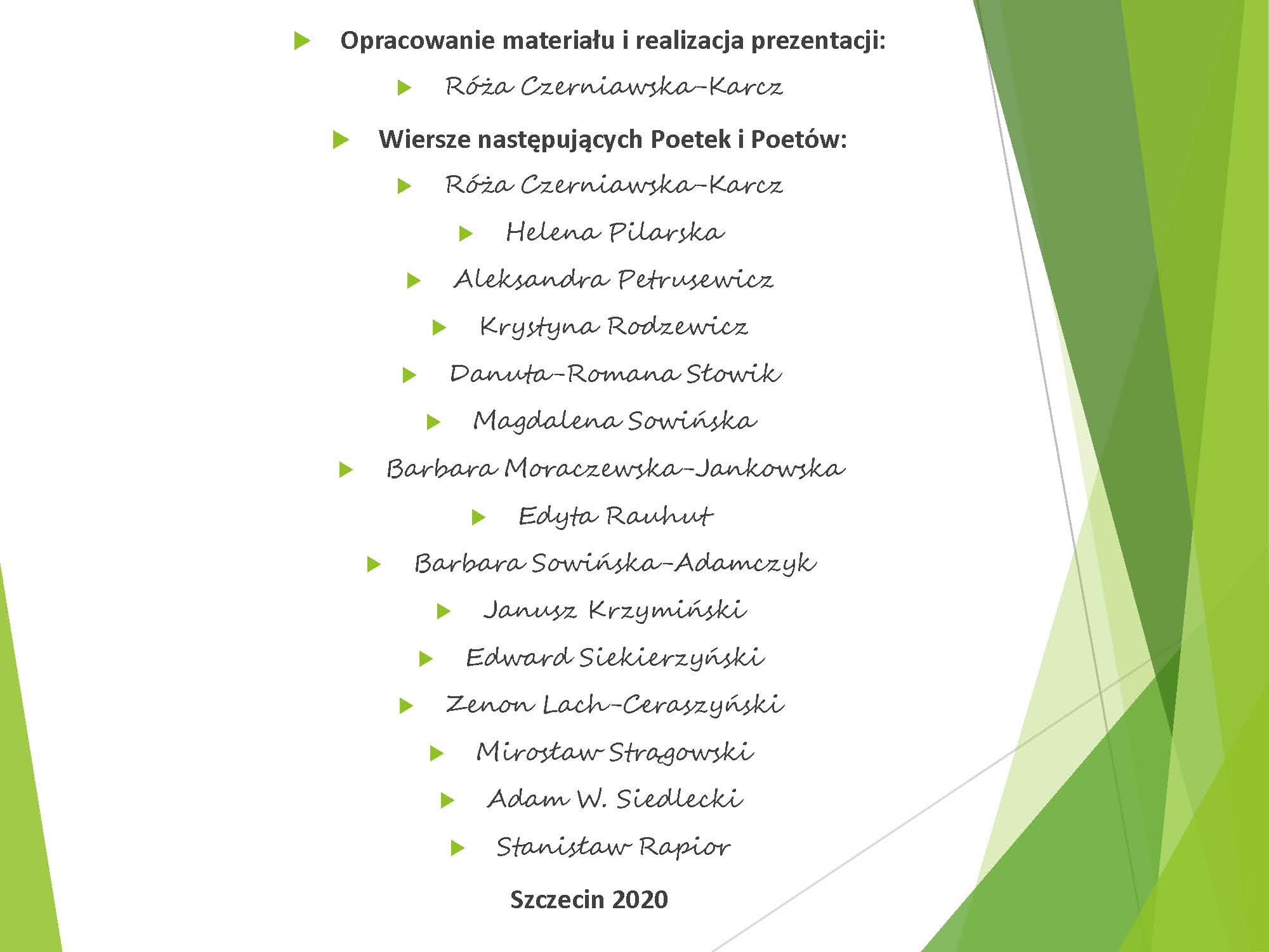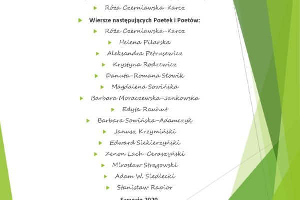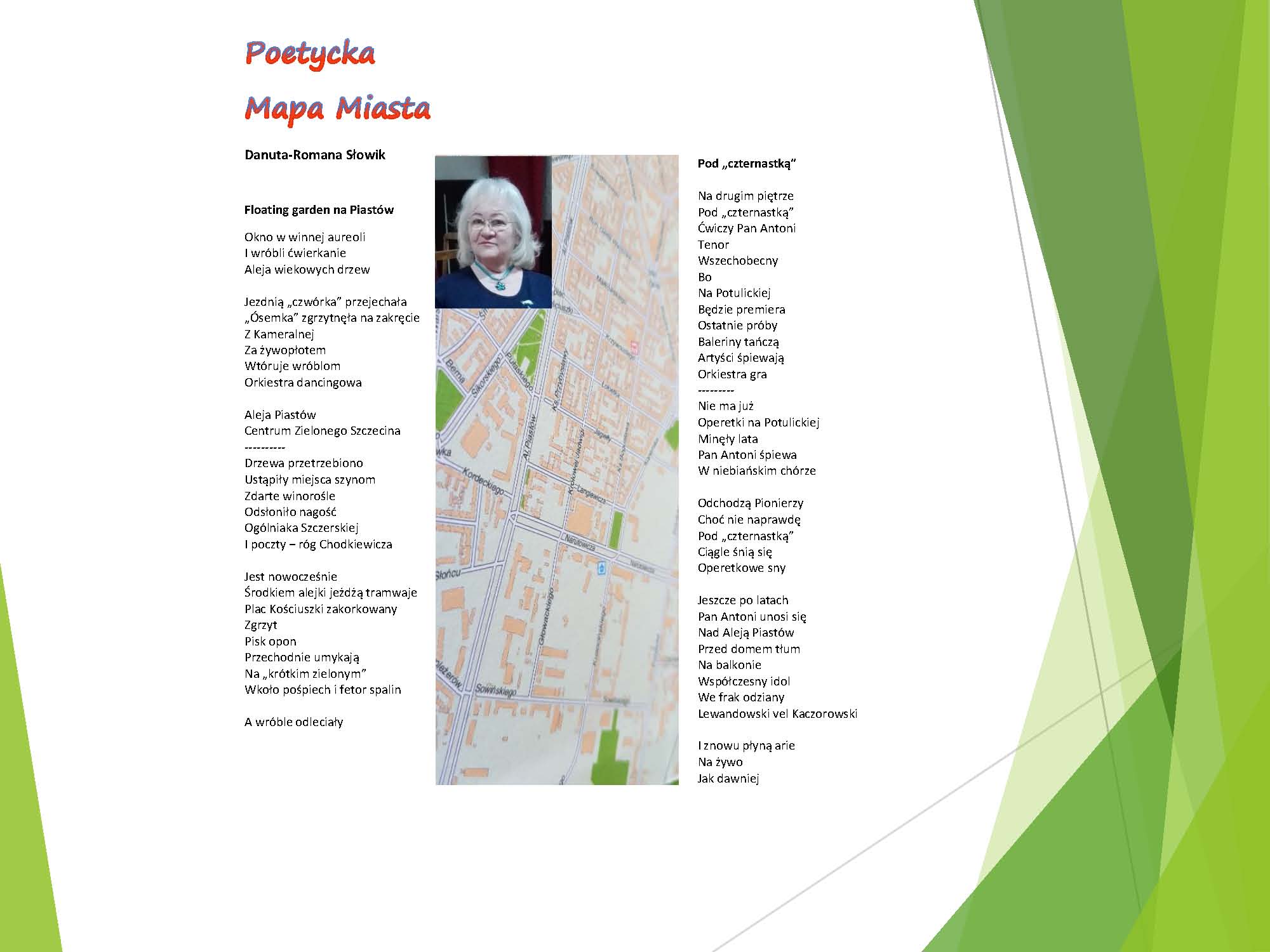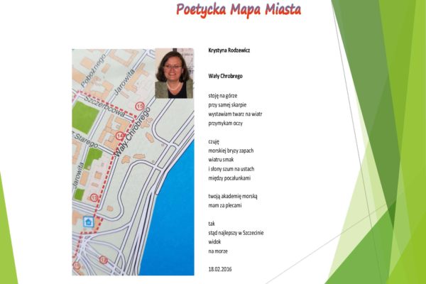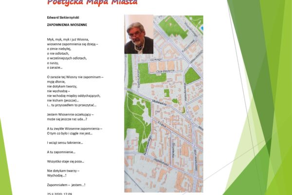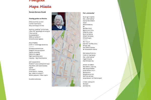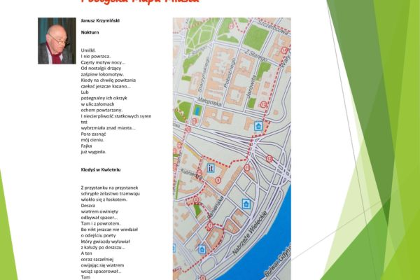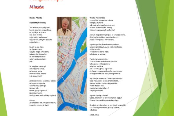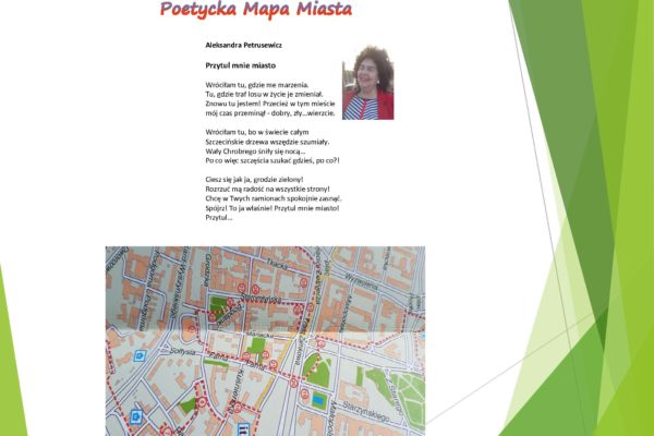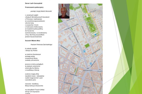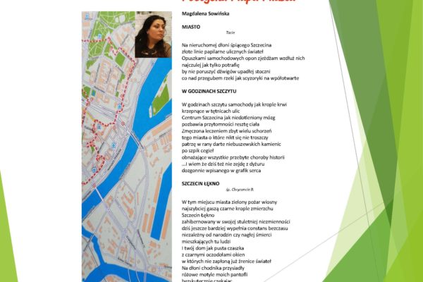 Szczęśliwie dla szczecińskiej Poezji…! I dla sympatyków spotkań W PAŁACU literacko!… zarówno organizatorzy jak i autorzy nie poddali się zniechęceniu i nie zaniechali pomysłu… spacer ma miejsce… chociaż wirtualnie… Poetycka Mapa Miasta… zapisuje się wierszami 15 autorów… a te wybrzmiewają w różnych wiosennych tonacjach na 65. Spotkaniu W PAŁACU literacko (a 1. w pandemii, bo niestety, jeszcze kilka następnych czeka na podobną realizację…). Obecne ma postać prezentacji wybranych wierszy zaproszonych przeze mnie Autorek: Heleny Pilarskiej, Aleksandry Petrusewicz, Krystyny Rodzewicz, Danuty-Romany Słowik, Magdaleny Sowińskiej, Barbary Moraczewskiej- Jankowskiej, Edyty Rauhut, Barbary Sowińskiej-Adamczyk (także piszącej te słowa – Róży Czerniawskiej-Karcz) i Autorów: Janusza Krzymińskiego, Edwarda Siekierzyńskiego, Zenona Lacha-Ceraszyńskiego, Mirosława Strągowskiego, Stanisława Rapiora oraz Adama W. Siedleckiego.