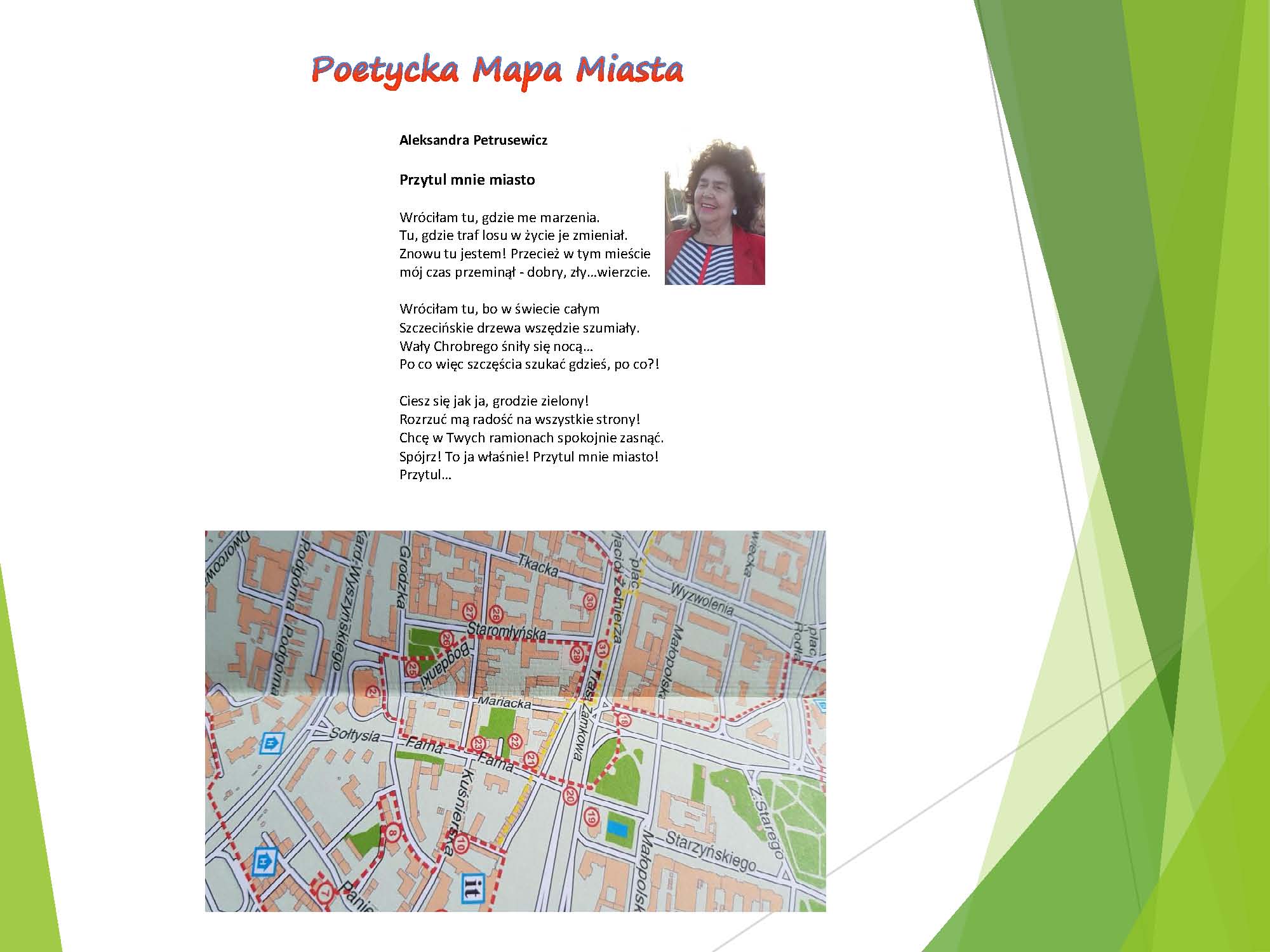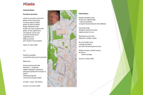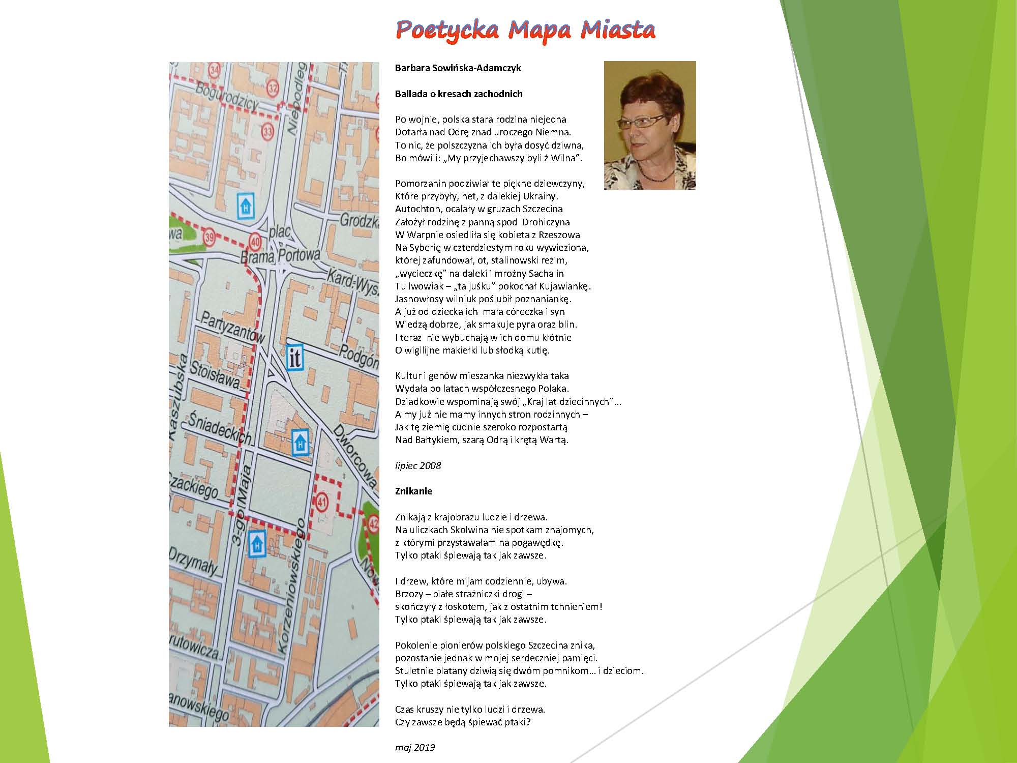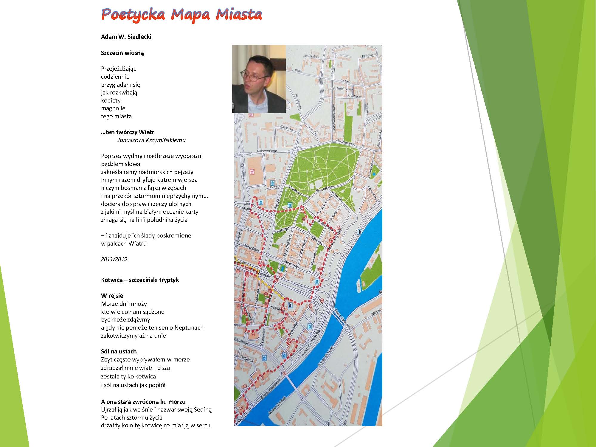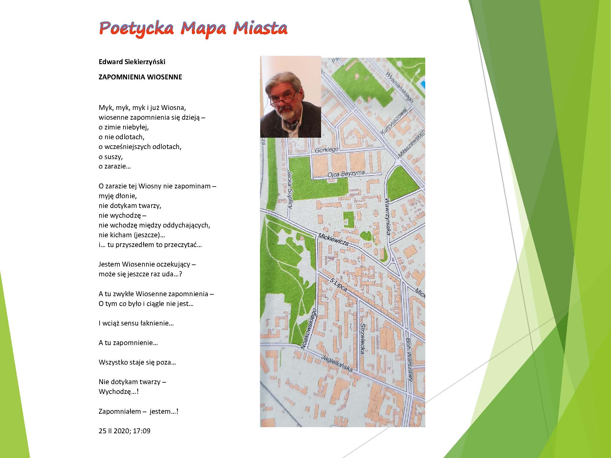 Szczęśliwie dla szczecińskiej Poezji…! I dla sympatyków spotkań W PAŁACU literacko!… zarówno organizatorzy jak i autorzy nie poddali się zniechęceniu i nie zaniechali pomysłu… spacer ma miejsce… chociaż wirtualnie… Poetycka Mapa Miasta… zapisuje się wierszami 15 autorów… a te wybrzmiewają w różnych wiosennych tonacjach na 65. Spotkaniu W PAŁACU literacko (a 1. w pandemii, bo niestety, jeszcze kilka następnych czeka na podobną realizację…). Obecne ma postać prezentacji wybranych wierszy zaproszonych przeze mnie Autorek: Heleny Pilarskiej, Aleksandry Petrusewicz, Krystyny Rodzewicz, Danuty-Romany Słowik, Magdaleny Sowińskiej, Barbary Moraczewskiej- Jankowskiej, Edyty Rauhut, Barbary Sowińskiej-Adamczyk (także piszącej te słowa – Róży Czerniawskiej-Karcz) i Autorów: Janusza Krzymińskiego, Edwarda Siekierzyńskiego, Zenona Lacha-Ceraszyńskiego, Mirosława Strągowskiego, Stanisława Rapiora oraz Adama W. Siedleckiego.
