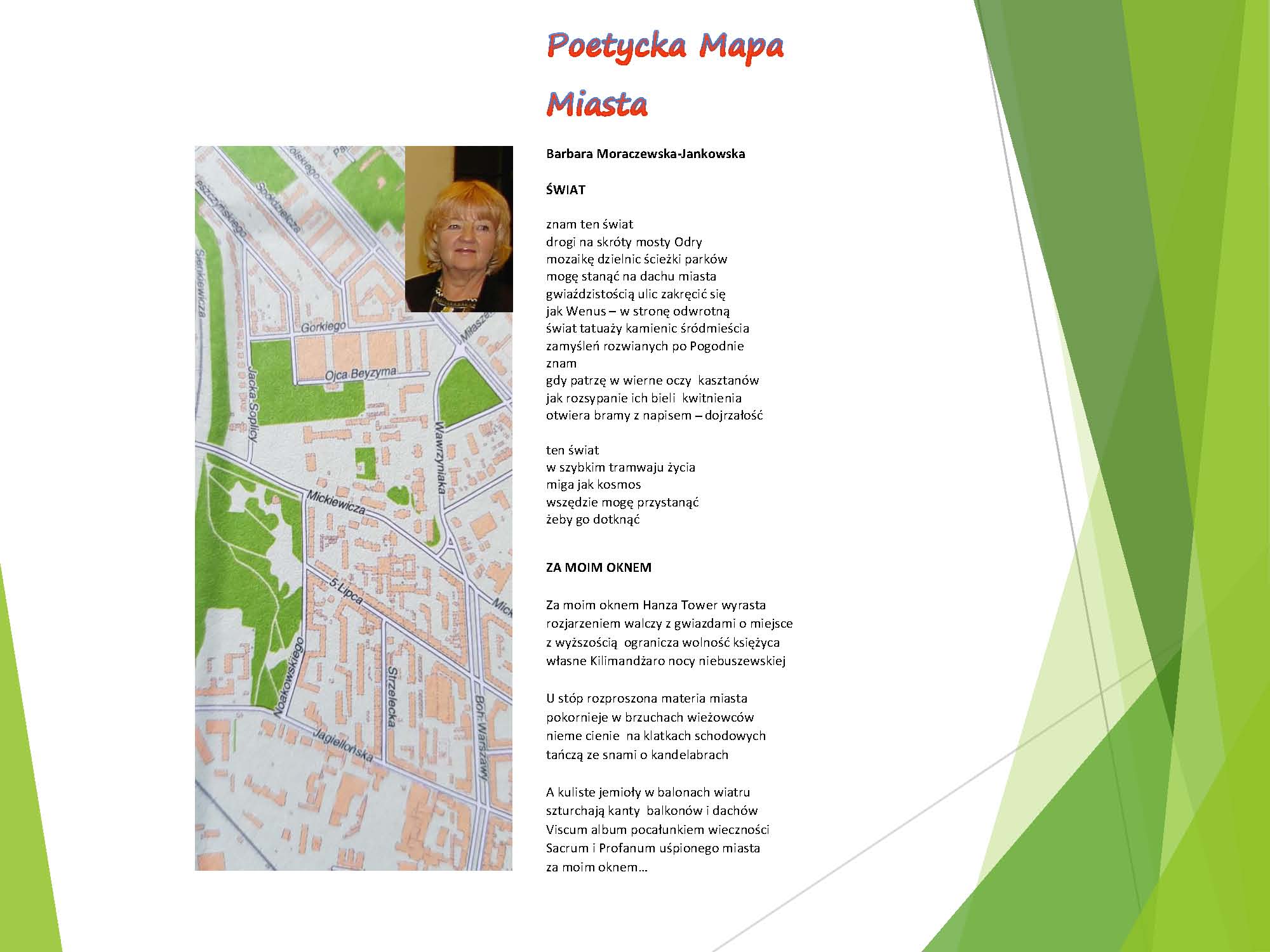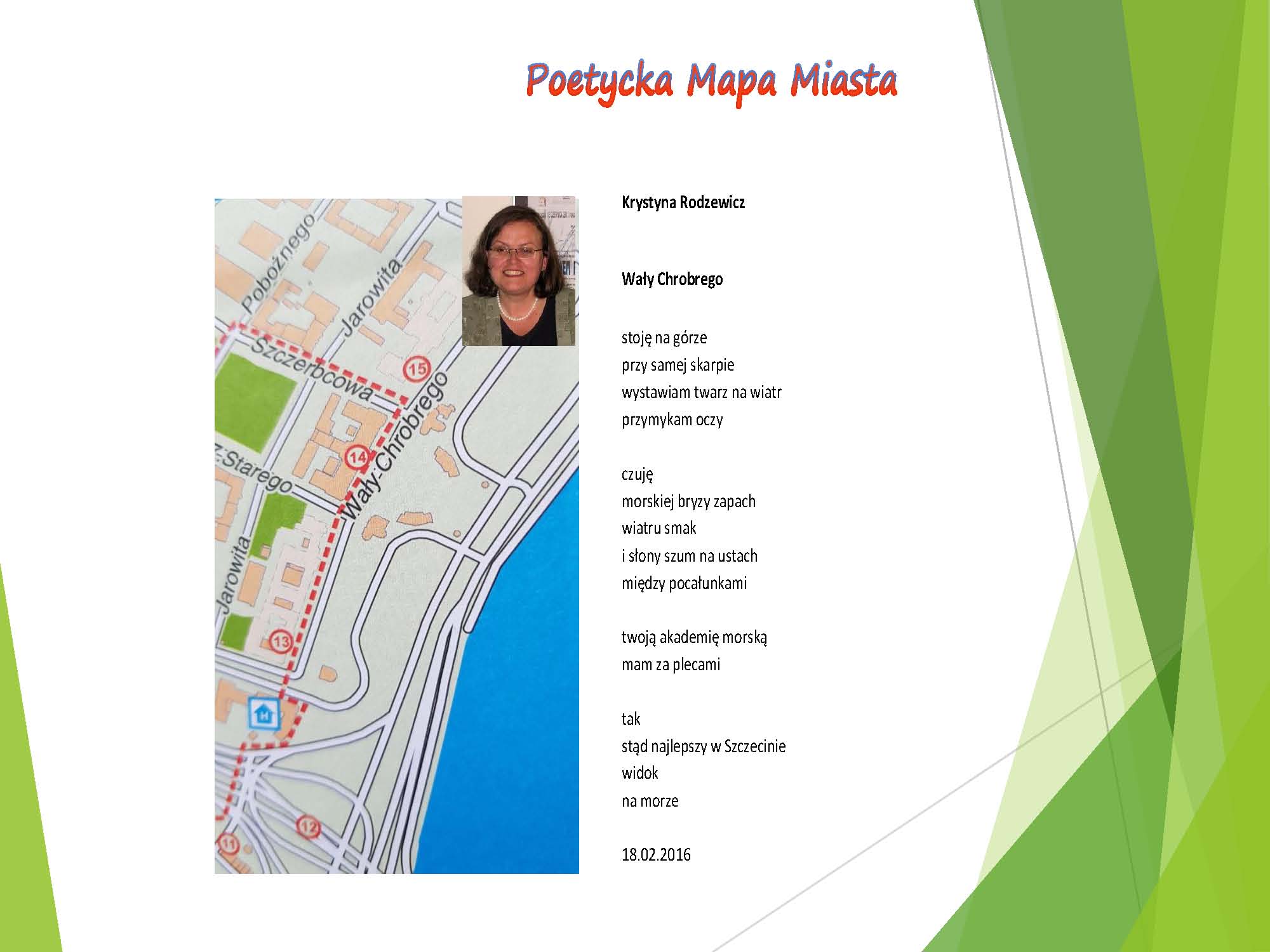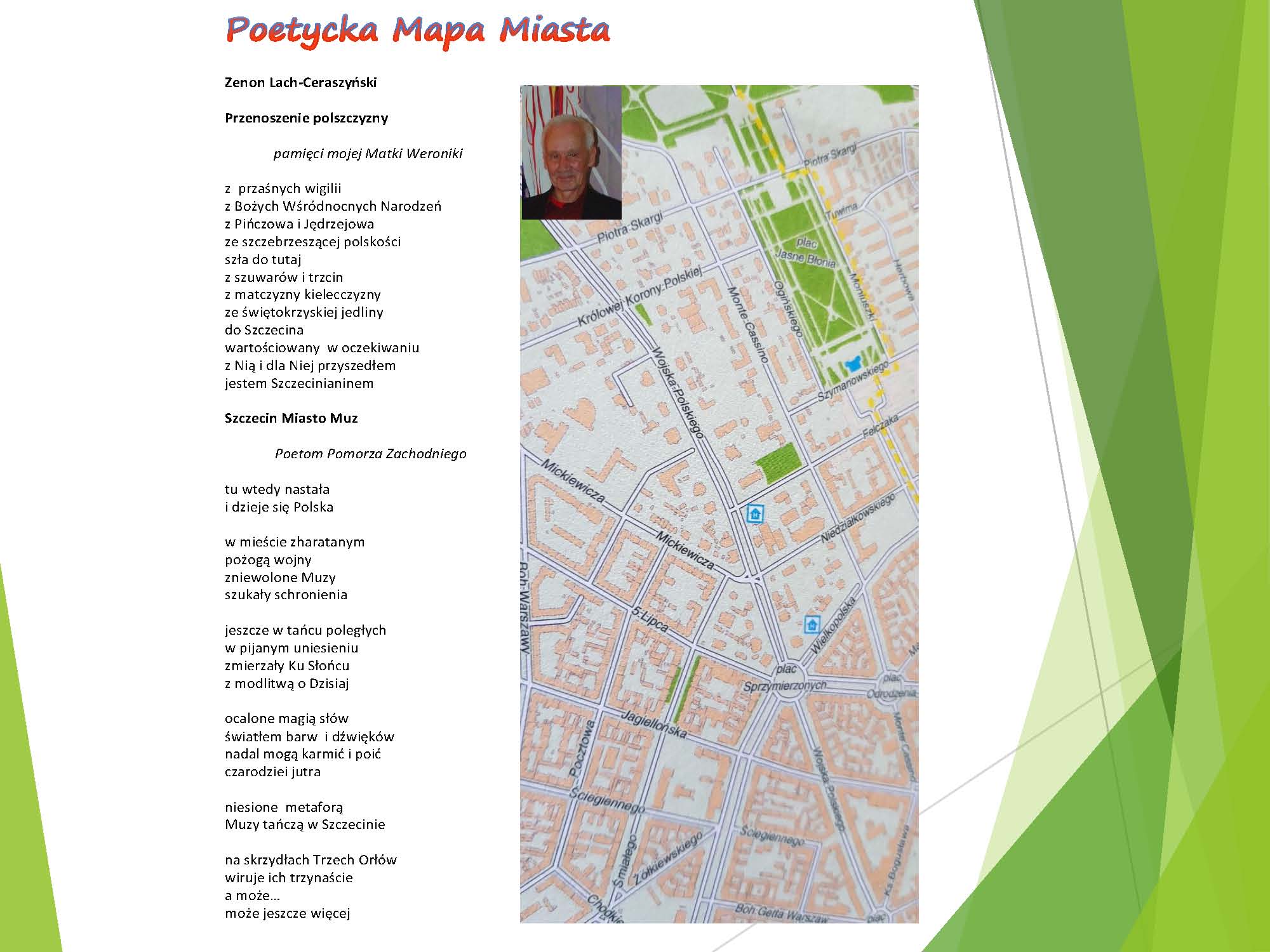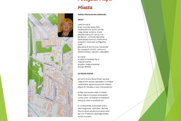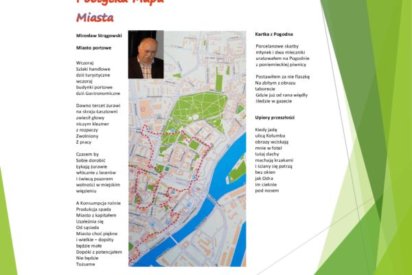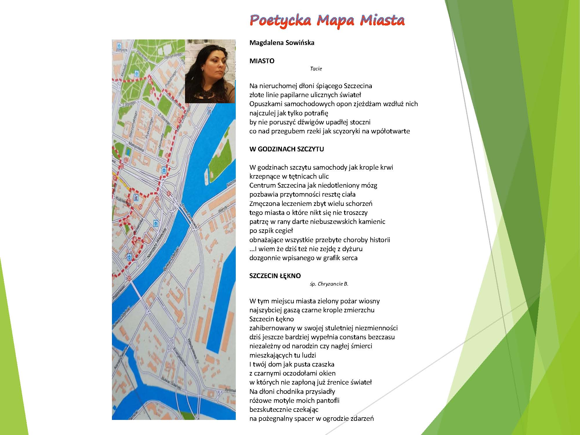Szczęśliwie dla szczecińskiej Poezji…! I dla sympatyków spotkań W PAŁACU literacko!… zarówno organizatorzy jak i autorzy nie poddali się zniechęceniu i nie zaniechali pomysłu… spacer ma miejsce… chociaż wirtualnie… Poetycka Mapa Miasta… zapisuje się wierszami 15 autorów… a te wybrzmiewają w różnych wiosennych tonacjach na 65. Spotkaniu W PAŁACU literacko (a 1. w pandemii, bo niestety, jeszcze kilka następnych czeka na podobną realizację…). Obecne ma postać prezentacji wybranych wierszy zaproszonych przeze mnie Autorek: Heleny Pilarskiej, Aleksandry Petrusewicz, Krystyny Rodzewicz, Danuty-Romany Słowik, Magdaleny Sowińskiej, Barbary Moraczewskiej- Jankowskiej, Edyty Rauhut, Barbary Sowińskiej-Adamczyk (także piszącej te słowa – Róży Czerniawskiej-Karcz) i Autorów: Janusza Krzymińskiego, Edwarda Siekierzyńskiego, Zenona Lacha-Ceraszyńskiego, Mirosława Strągowskiego, Stanisława Rapiora oraz Adama W. Siedleckiego.