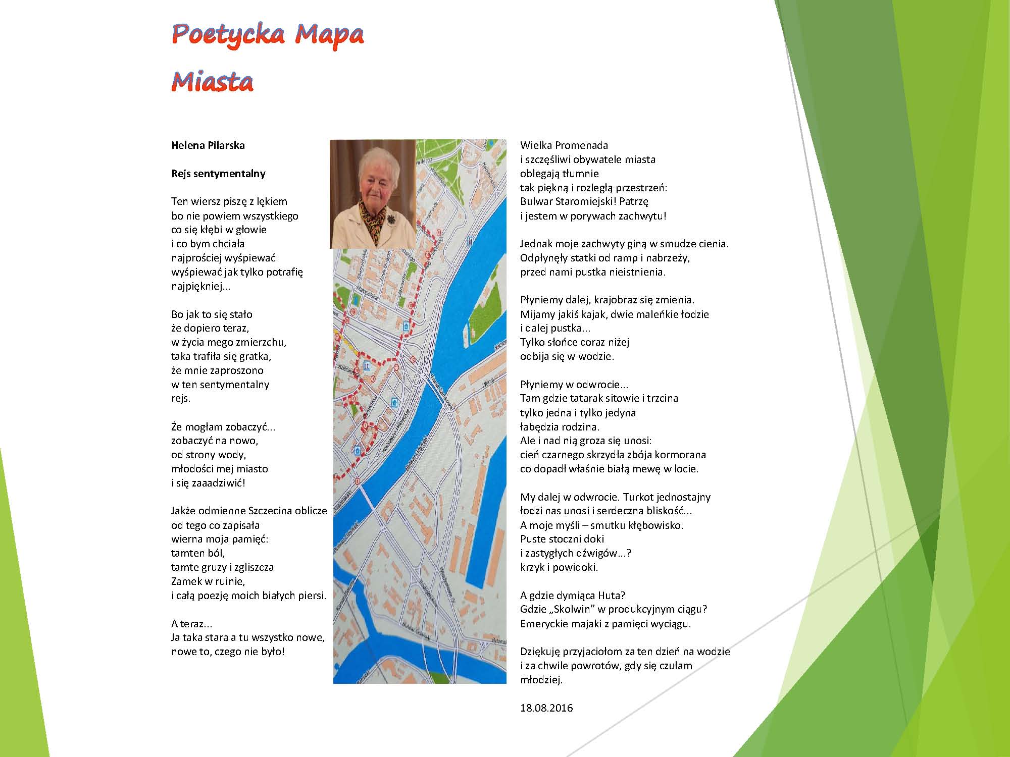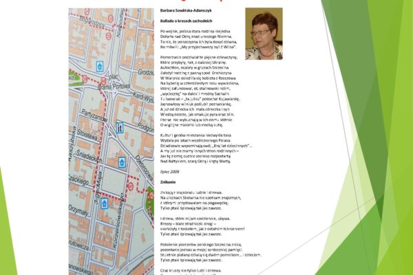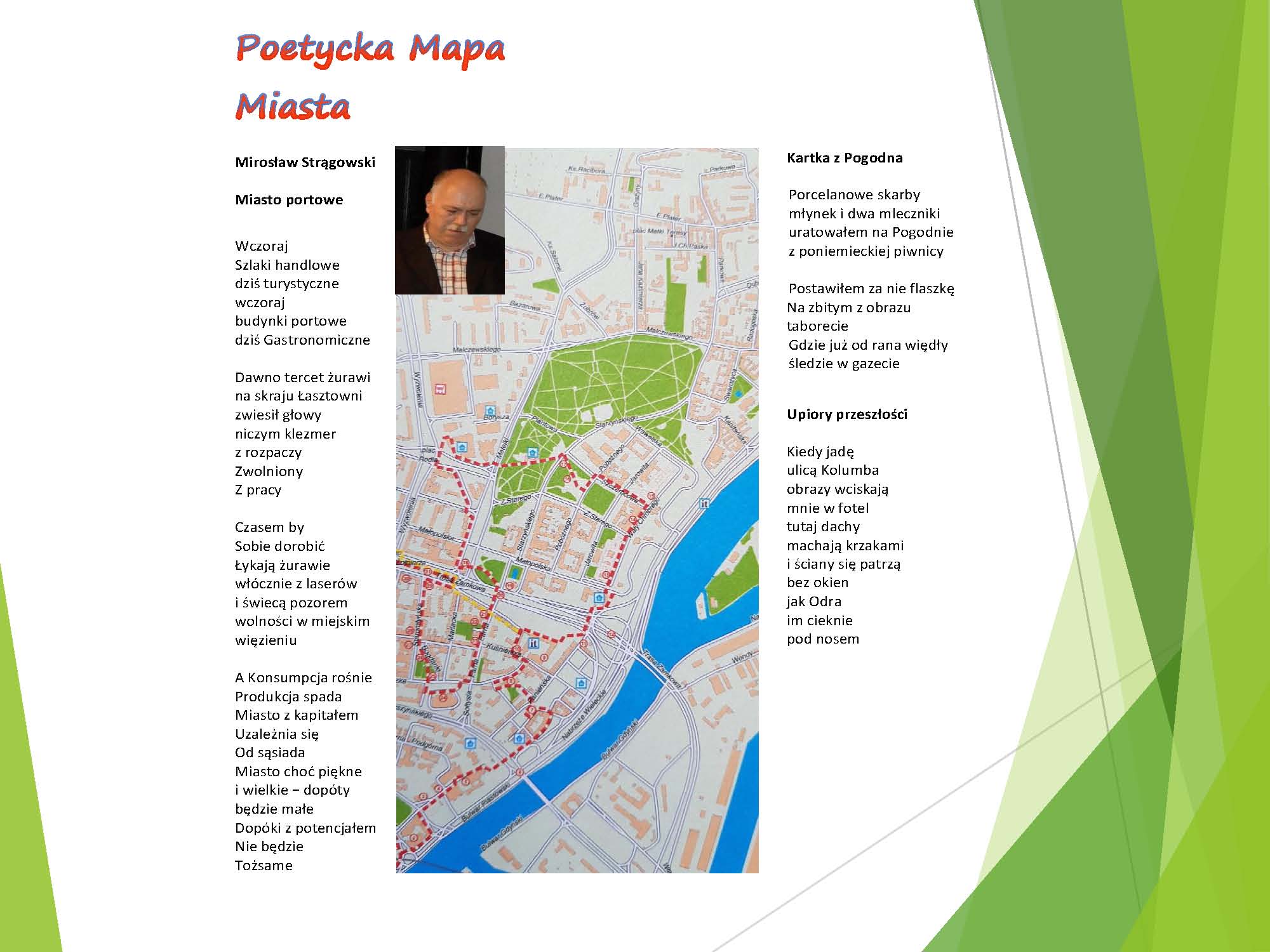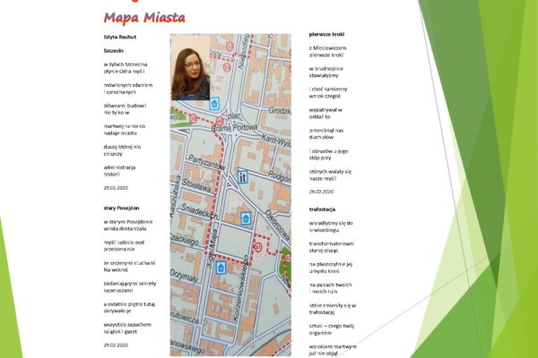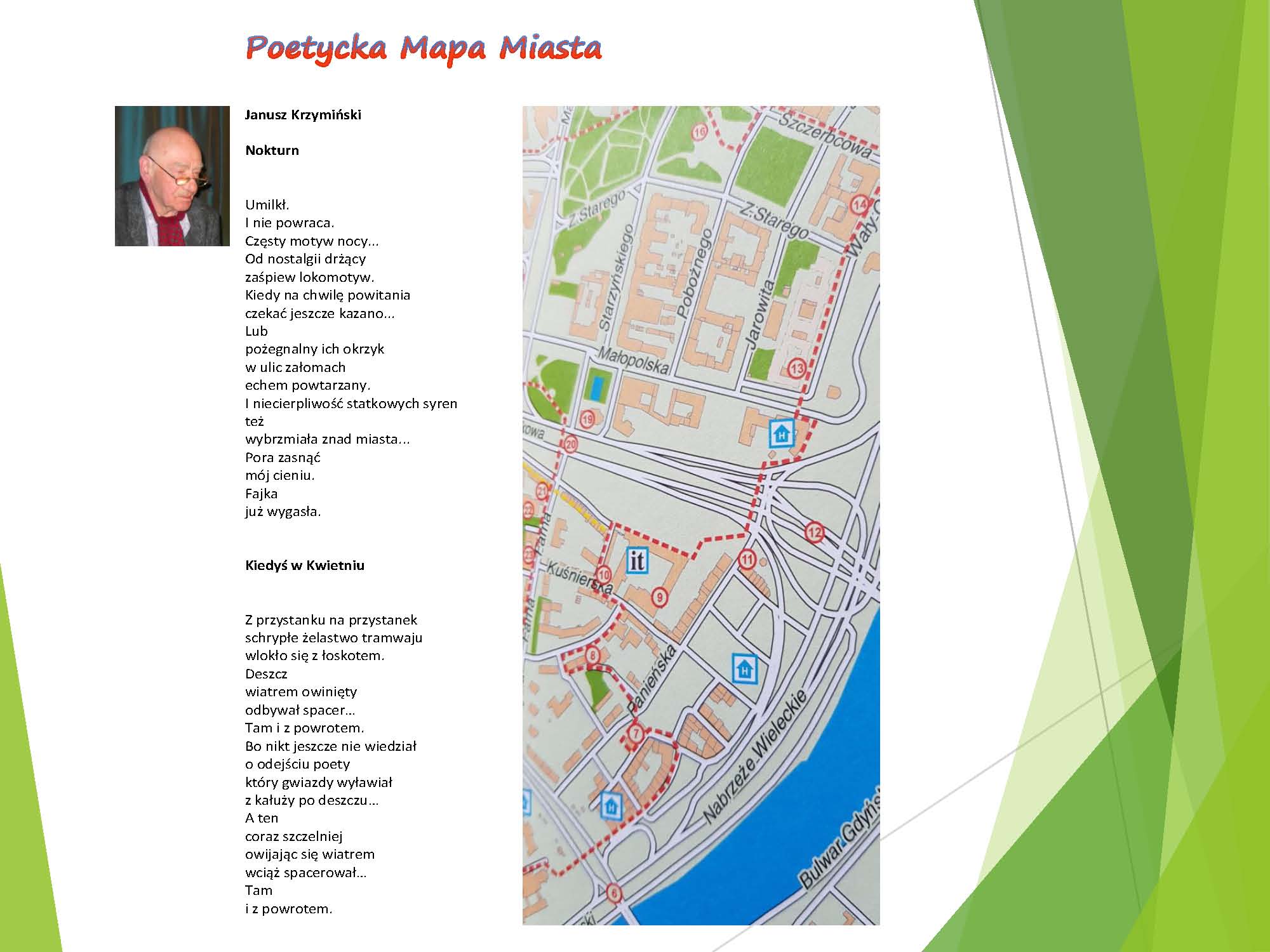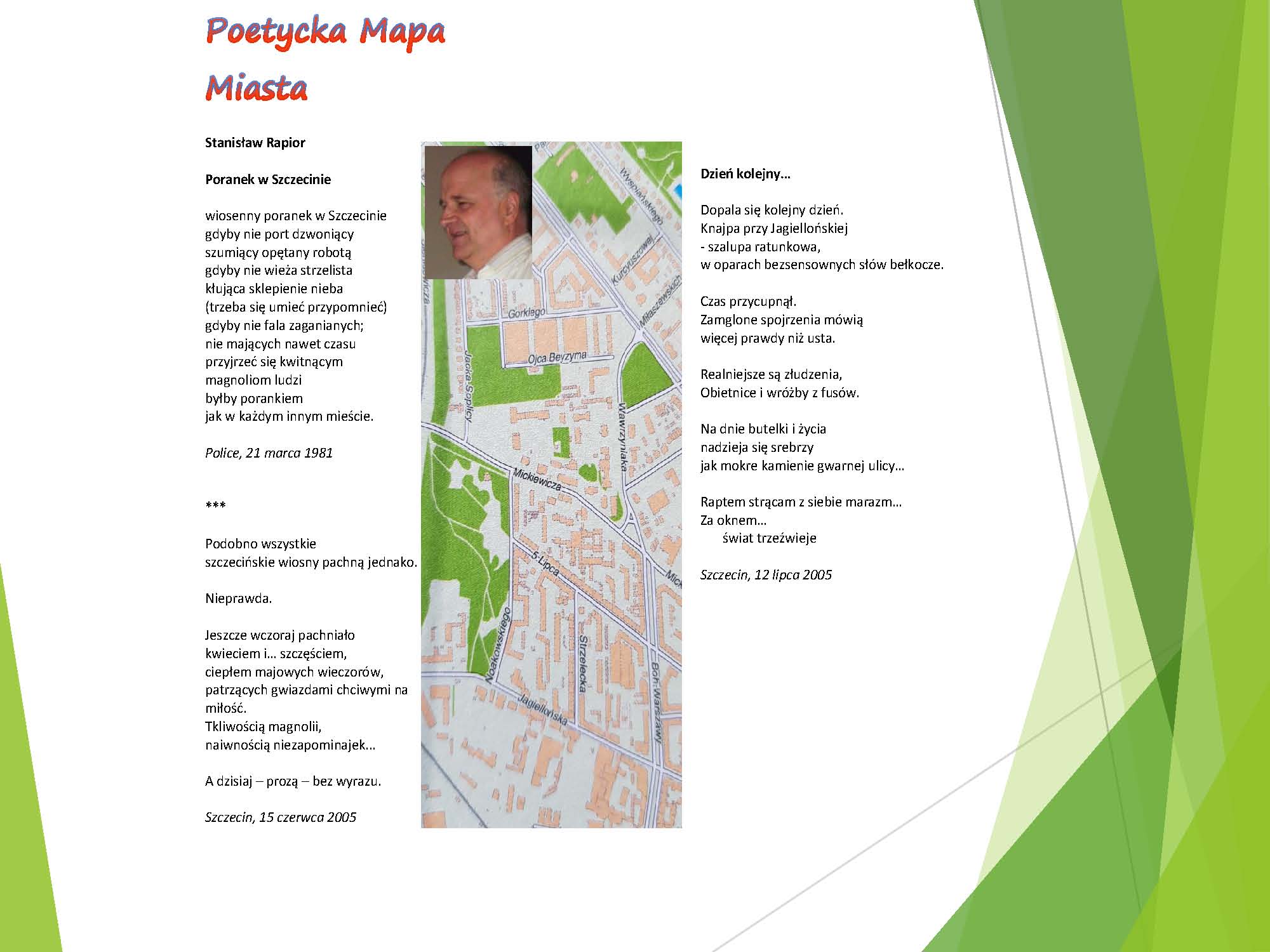 Szczęśliwie dla szczecińskiej Poezji…! I dla sympatyków spotkań W PAŁACU literacko!… zarówno organizatorzy jak i autorzy nie poddali się zniechęceniu i nie zaniechali pomysłu… spacer ma miejsce… chociaż wirtualnie… Poetycka Mapa Miasta… zapisuje się wierszami 15 autorów… a te wybrzmiewają w różnych wiosennych tonacjach na 65. Spotkaniu W PAŁACU literacko (a 1. w pandemii, bo niestety, jeszcze kilka następnych czeka na podobną realizację…). Obecne ma postać prezentacji wybranych wierszy zaproszonych przeze mnie Autorek: Heleny Pilarskiej, Aleksandry Petrusewicz, Krystyny Rodzewicz, Danuty-Romany Słowik, Magdaleny Sowińskiej, Barbary Moraczewskiej- Jankowskiej, Edyty Rauhut, Barbary Sowińskiej-Adamczyk (także piszącej te słowa – Róży Czerniawskiej-Karcz) i Autorów: Janusza Krzymińskiego, Edwarda Siekierzyńskiego, Zenona Lacha-Ceraszyńskiego, Mirosława Strągowskiego, Stanisława Rapiora oraz Adama W. Siedleckiego.