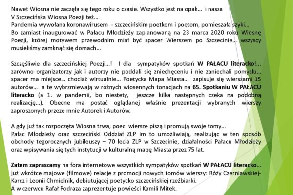 Nawet Wiosna nie zaczęła się tego roku o czasie. Wszystko jest na opak… i nasza V Szczecińska Wiosna Poezji też… Pandemia wywołana koronawirusem – szczecińskim poetkom i poetom, pomieszała szyki… Bo zamiast inaugurować w Pałacu Młodzieży zaplanowaną na 23 marca 2020 roku Wiosnę Poezji, której motywem przewodnim miał być spacer Wierszem po Szczecinie… wszyscy musieliśmy zamknąć się domach…