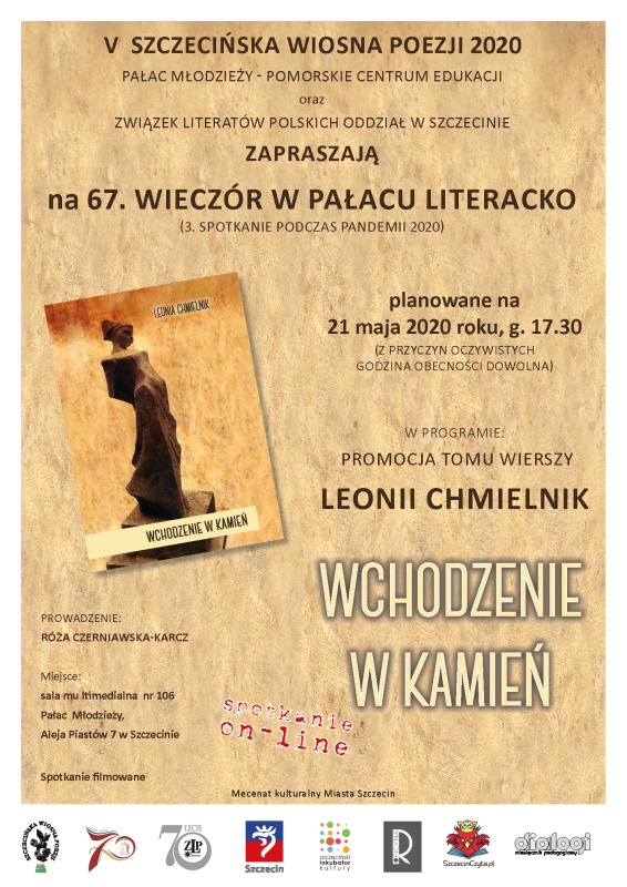 Z tym większą śmiałością realizujemy kolejne… 3. w pandemii a 67. w cyklu: W PAŁACU literacko spotkanie z LEONIĄ CHMIELNIK, uznaną szczecińską rzeźbiarką, którą zaprezentujemy jako debiutującą w roli poetki… Tom wierszy WCHODZENIE W KAMIEŃ Leonii Chmielnik to poetycki debiut Artystki, ale też dookreślenie Jej drogi twórczej i życiowej, bo temu przecież najtrafniej i precyzyjnie służą słowa. Artystka stworzyła hierarchię w swoim byciu… oddając pierwszeństwo kamieniowi, materii, która „wysiłkiem mięśni w kształt spodziewany” przybiera formę z wyobraźni.