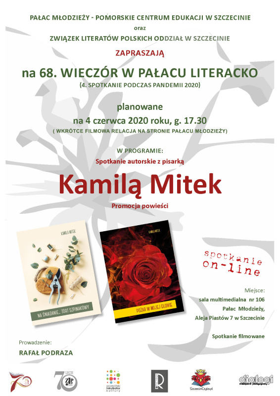 Zgodnie z formułą przyjętą u zarania organizacji spotkań, a było to 10 lat temu, podczas pałacowych wieczorów gośćmi są pisarze nie tylko szczecińscy. Stąd i w ten zaplanowany na 4 czerwca 2020 czwartek W PAŁACU literacko, w Pałacu Młodzieży-Pomorskim Centrum Edukacji zagości, na zaproszenie Rafała Podrazy, pisarka z Legnicy – Kamila Mitek.