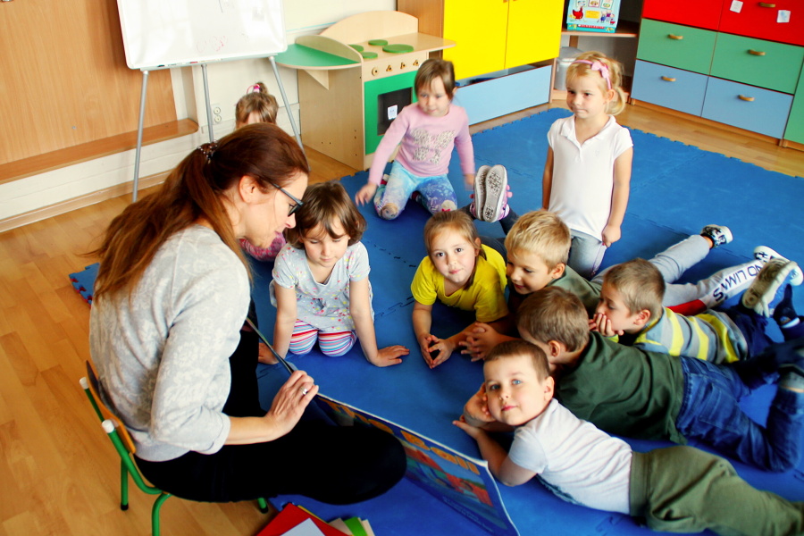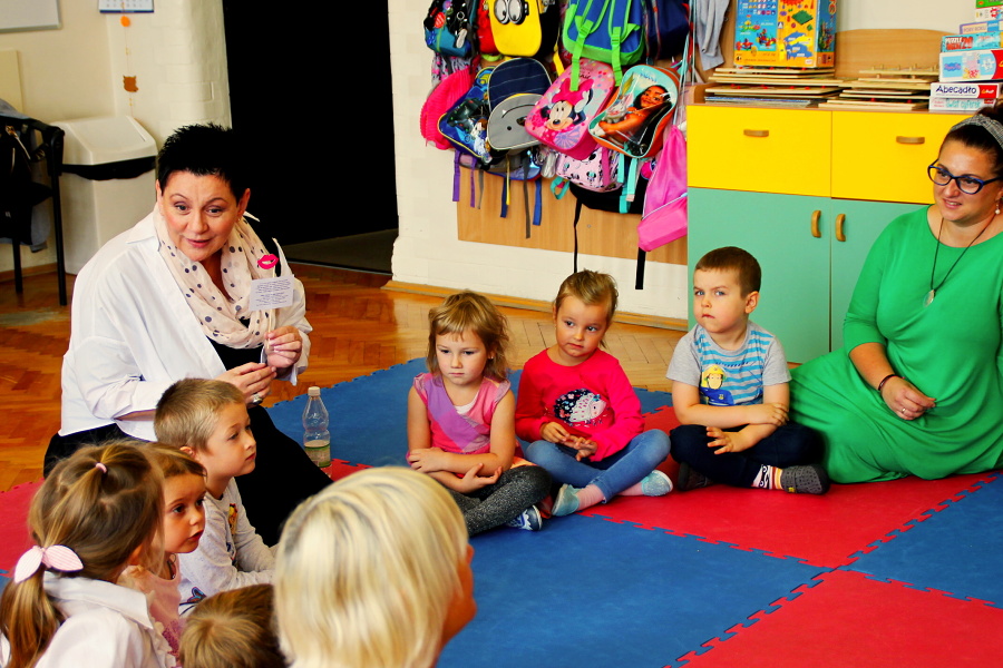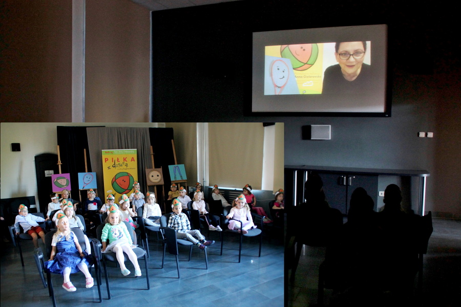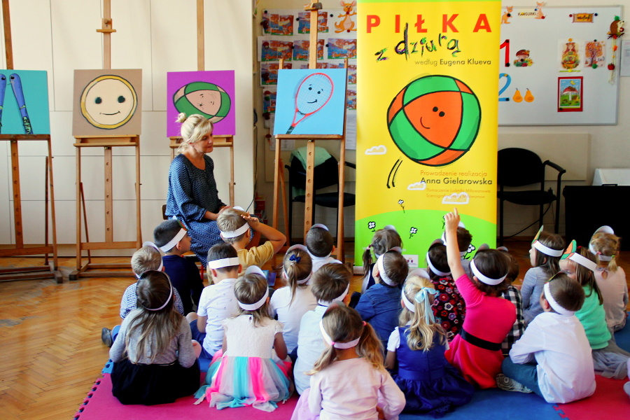 Bajka Eugena Klueva pt. „Piłka z dziurą” była punktem wyjścia do wielu spotkań i twórczych działań. Podczas zajęć rytmiczno-ruchowych dzieci doświadczały radości płynącej z zabaw piłkami, różnej wielkości. Po wysłuchaniu bajki w wykonaniu Anny Gielarowskiej i w tłumaczeniu Ludmiły Miłowanowej, maluchy rozmawiały z nauczycielkami o bezinteresownej przyjaźni i jej znaczeniu w życiu każdego z nas. Na zajęciach z języka angielskiego poznawały słowa i zwroty związane z postaciami występującymi w opowieści. Piękne prace z piłką i guzikiem w rolach głównych, powstały na zajęciach plastycznych. Malowanie, wycinanie, klejenie, stemplowanie sprawiło dzieciom wiele radości, a efekty ich radosnej twórczości, można podziwiać na wystawie znajdującej się na trzecim piętrze Pałacu Młodzieży.