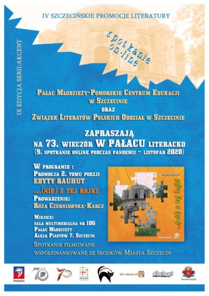 Nie inaczej będzie na 73. Wieczorze w cyklu W PAŁACU literacko, 9. w pandemii. Gościem spotkania będzie młoda szczecińska poetka, Edyta Rauhut, ze swoją drugą książką, tomem wierszy …(nie) z tej bajki. To jednocześnie pozycja wydana jako 68. w serii:akcent w jej IX edycji, którą realizuje ZLP O. w ramach zadania publicznego IV SZCZECIŃSKIE PROMOCJE LITERATURY. Projekt jest dofinansowany ze środków Miasta Szczecin.