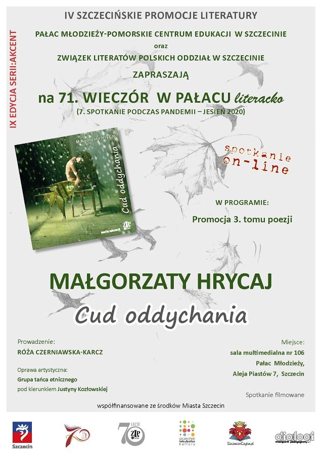 Jesień w pandemii trwa …i W PAŁACU literacko też! A jednak Autorki i Autorzy piszą, szczeciński oddział Związku Literatów Polskich realizuje zadanie publiczne IV SZCZECIŃSKIE PROMOCJE LITERATURY 2020, wydając kolejną 66. już książkę w serii: akcent, a drugą w IX edycji. Niezawodny Pałac Młodzieży wbrew wszelkim przeciwnościom zewnętrznym, umożliwia spotkania. Wprawdzie online, ale aż TYLE!