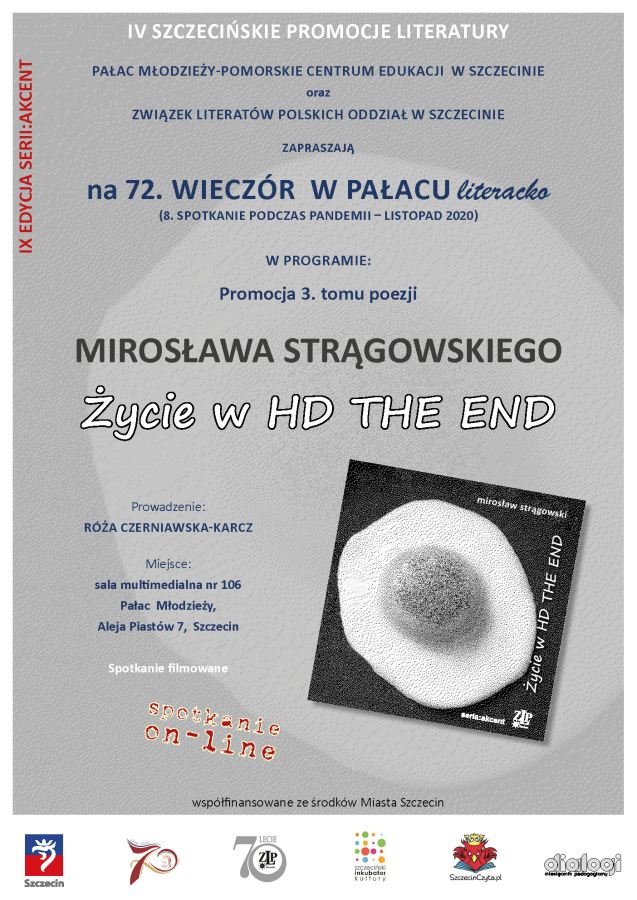 Oto 72. wieczór w cyklu W PAŁACU literacko, 8. w pandemii. Tym razem gościem spotkania jest Mirosław Strągowski i Jego najnowszy tom wierszy Życie w HD THE END (67. pozycja w serii: akcent!).