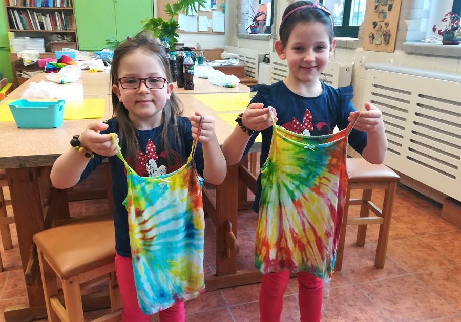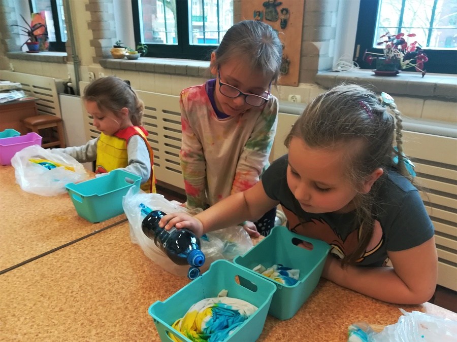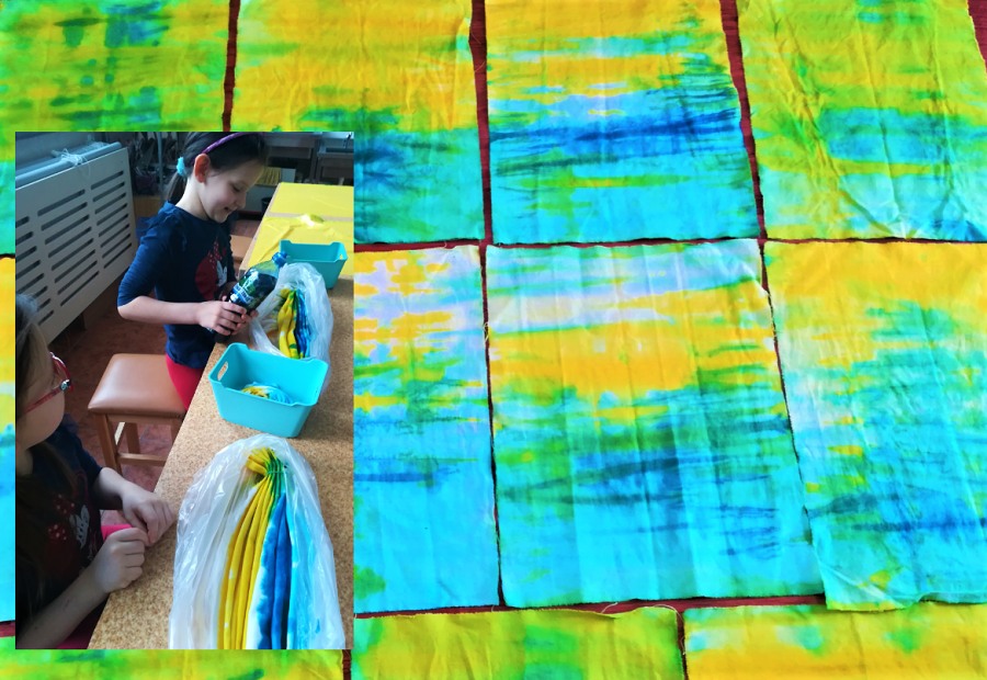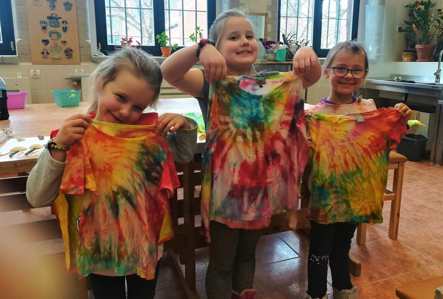 Lutowe, Etniczne Warsztaty Twórcze Pracowni Tańca Etnicznego pod kierunkiem Justyny Kozłowskiej to między innymi czas przygotowań kolejnej wystawy. Grupa Mała Etnika barwiła tkaniny, które będą tłem do wykonania wyjątkowych prac. Co się zadzieje w kolejnym etapie? To już pewna tajemnica. Przygotowanymi farbami dziewczęta zabarwiły metodą TIE DYE( z ang. wiązać – barwić) swoje, białe, bawełniane koszulki i bluzki. Z radością obserwowały efekty.