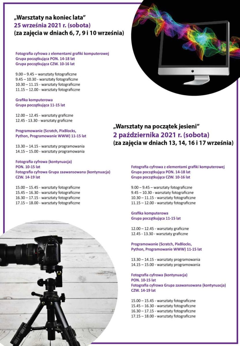 Kończy się lato, nadchodzi jesień, wakacje za nami – czas rozpocząć nowy sezon w pracowni fotografii cyfrowej i grafiki komputerowej. Zapraszamy wszystkich uczestników tej pracowni do udziału w wyjątkowym wydarzeniu rozłożonym na dwa weekendy na przełomie września i października. Sobotnie warsztaty będą okazją do wspólnego spotkania uczestników zajęć z różnych grup, stałych bywalców z często wieloletnim doświadczeniem i nowych adeptów fotografii, grafiki czy programowania, którzy w tym roku zdecydowali się do nas dołączyć. Wspólne zajęcia fotograficzne, graficznie i kodowania pozwolą na integrację grupy i będą okazją do realizacji wielu nowych ciekawych pomysłów. Zapraszamy!!!