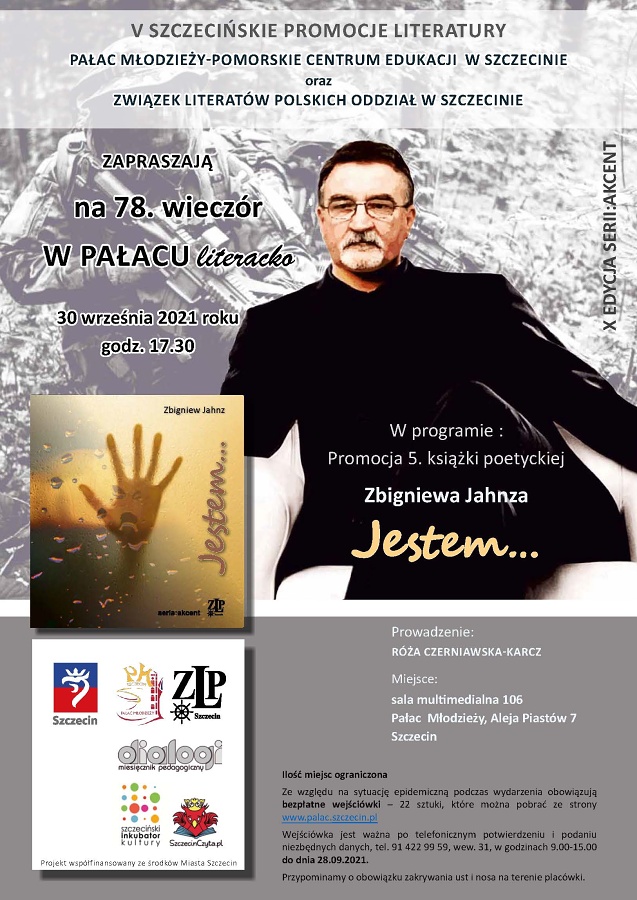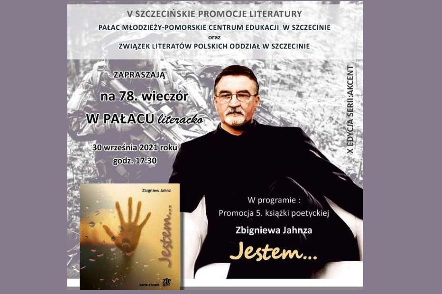 Z wielką radością rozpoczynamy 11. sezon spotkań w cyklu W PAŁACU literacko i zapraszamy na 78. wieczór, oczywiście promocyjny, z najnowszą książką poetycką ZBIGNIEWA JAHNZA, pt. „Jestem…”, która została wydana w X edycji serii: akcent realizowanej w projekcie – V SZCZECIŃSKIE PROMOCJE LITERATURY 2021.