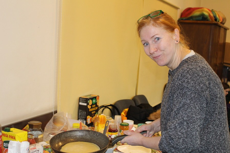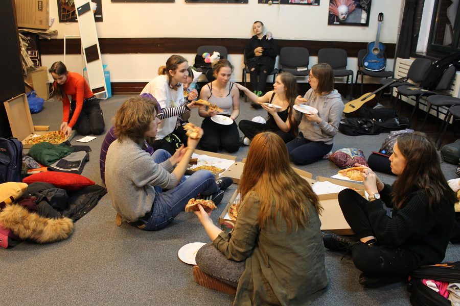 Hitem spotkania, jak na Pracownię Teatralno-Muzyczną przystało były piosenki, ( z choreografią włącznie), pochodzące z filmów Disneya, gra na instrumentach, (dwie gitary, ukulele i pianino), oraz projekcje filmowe. Rozmawialiśmy, konsumowaliśmy, a na śniadanie zrobiliśmy naleśniki, które uczyniły ten niewyspany poranek znacznie znośniejszym. Słowem, Noc Teatralna była dłuuuuuga i owocna na tyle, że powstał plan, by stała się coroczną tradycją.