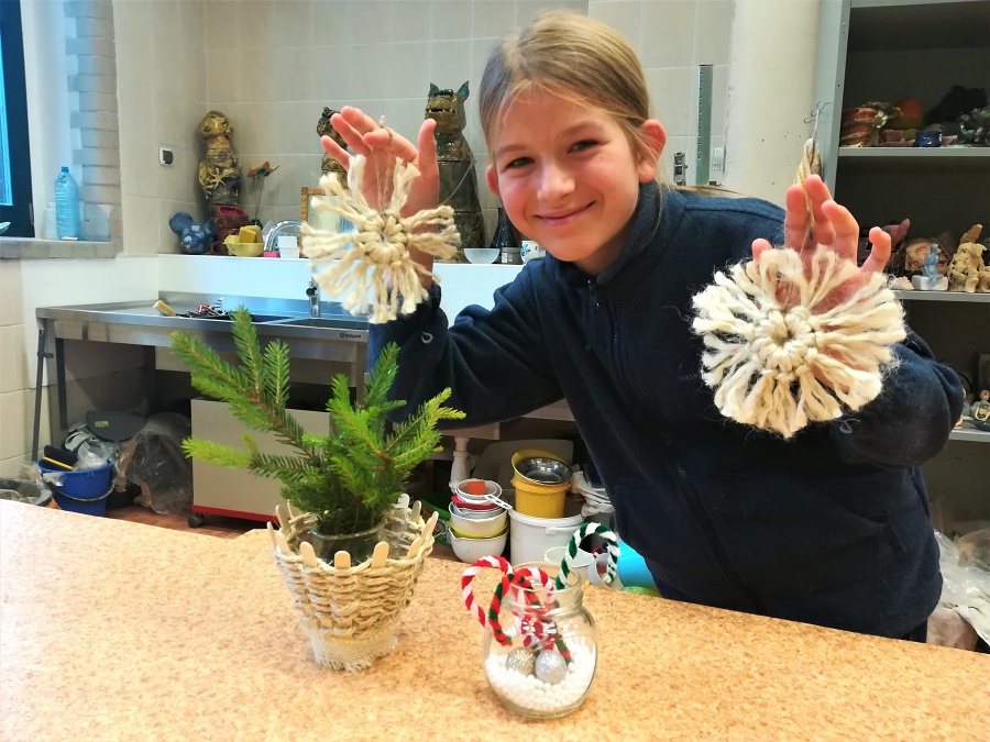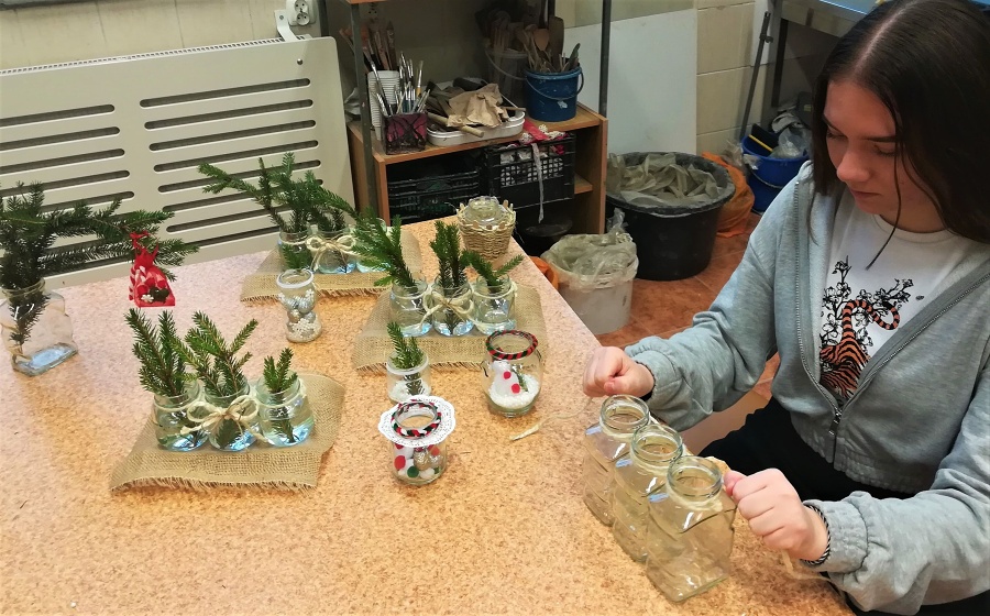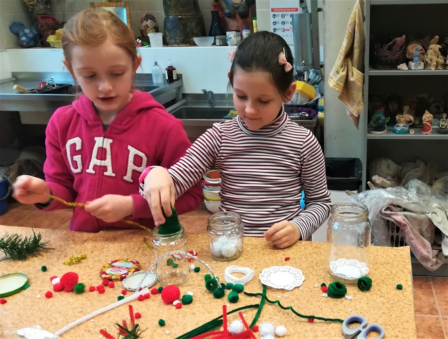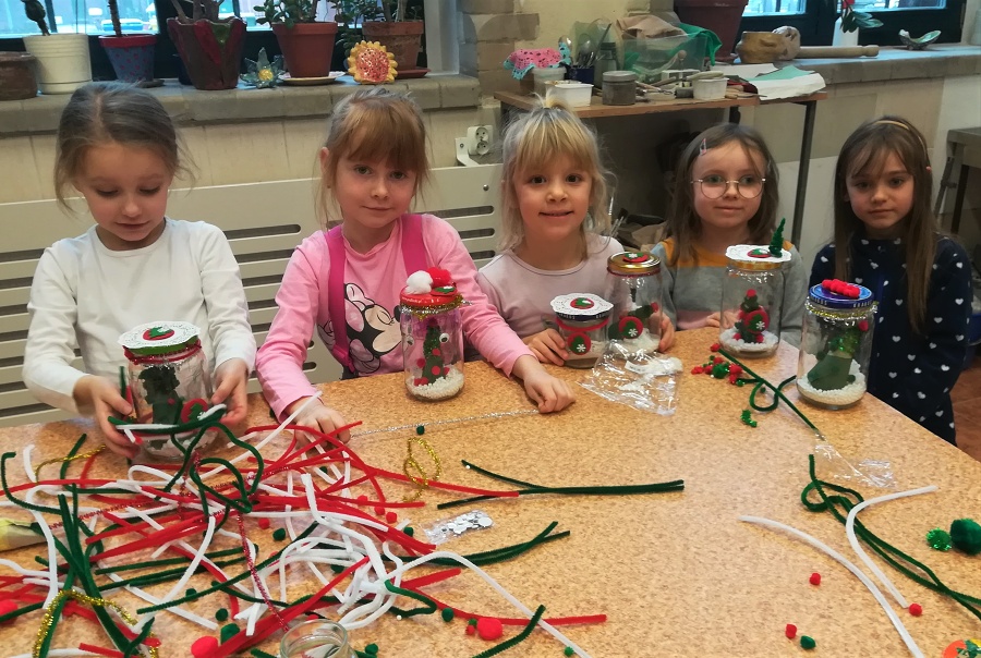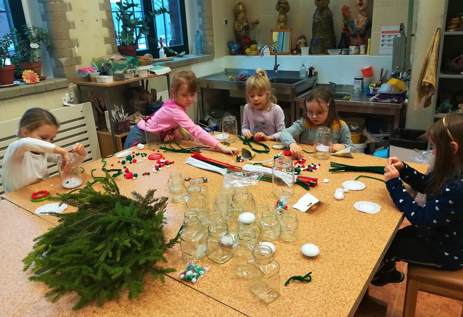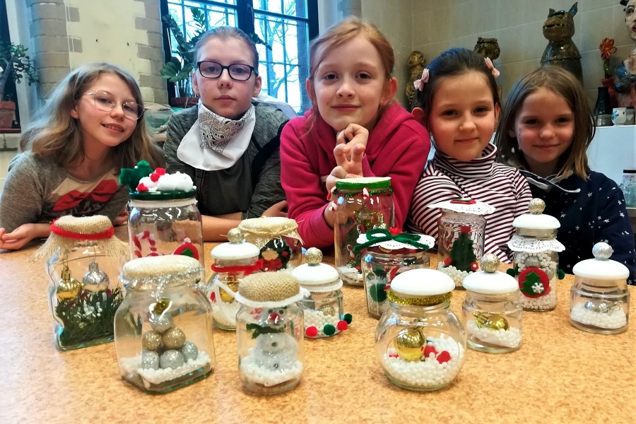 Podczas grudniowych, Etnicznych Warsztatów Twórczych Pracowni Tańca Etnicznego pod kierunkiem Justyny Kozłowskiej powstały ozdoby i dekoracje świąteczne. Bazą do wykonania stroików stały się szklane słoiki. Mamy ich w domu pod dostatkiem. Wystarczy trochę ciekawych drobiazgów takich jak: kolorowe kulki, sznurki, bombki, choinkowe łańcuchy i zwykły słoik zamieni się w piękną, świąteczną dekorację. Pomysłów dziewczętom nie brakowało. Czas leciał bardzo szybko i oryginalne ozdoby ozdobiły cały stół. Było jak zawsze twórczo, pracowicie i wesoło.