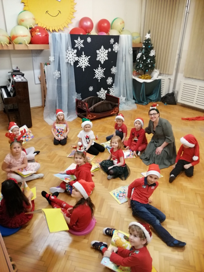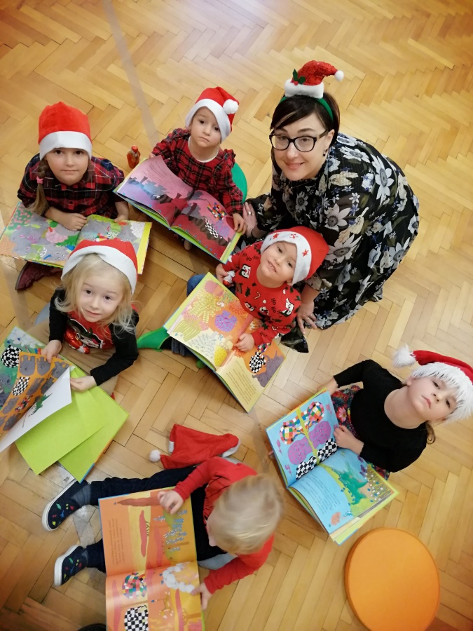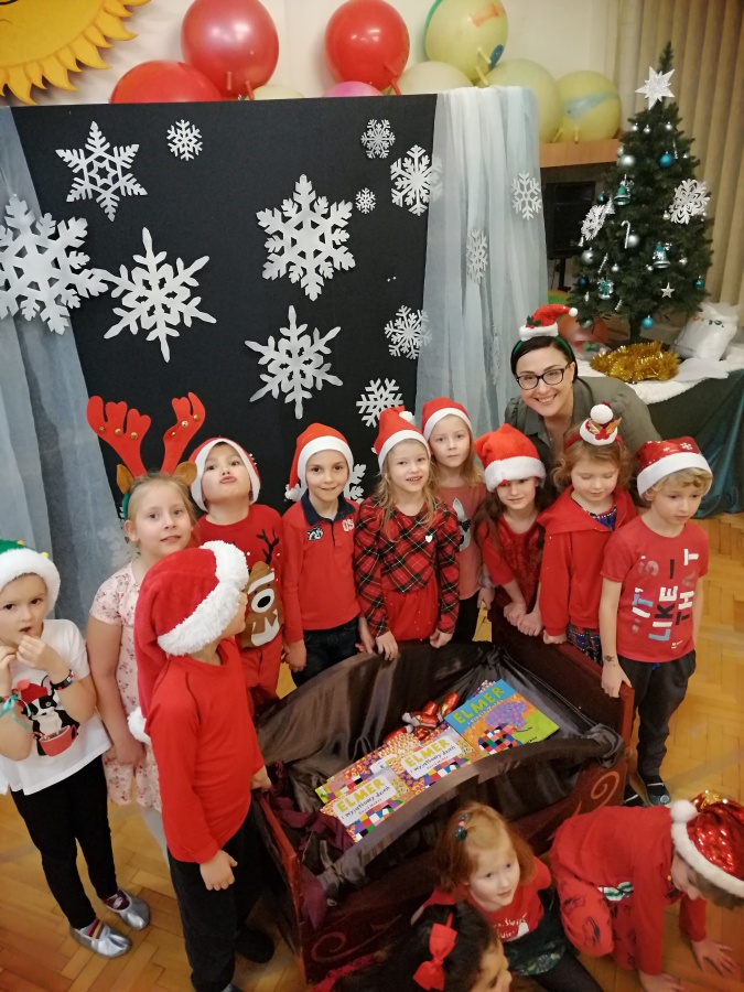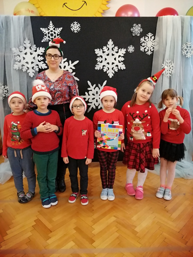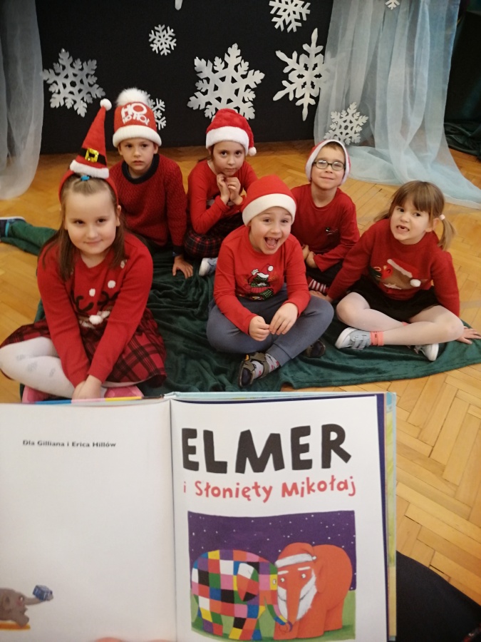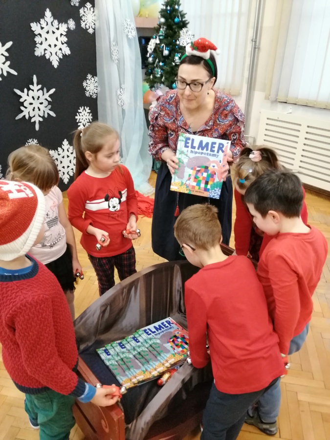 Tym razem spotkanie z Elmerem było wyjątkowe. Czekała na nas bowiem wspaniała zimowa zabawa oraz upominki od Świętego Mikołaja. Wprawdzie nieco później, niż zazwyczaj, ale nie mniej radośnie i świątecznie. W ramach projektu WYCHOWANIE PRZEZ CZYTANIE wysłuchaliśmy opowiadania „Słonięty Mikołaj”, w którym bohaterowie również obchodzili święta, ubierali tropikalną choinkę i wyczekiwali na prezenty. Po wysłuchaniu historii, podtrzymaliśmy świąteczny klimat, śpiewając kolędy i piosenki przygotowane specjalnie dla Świętego Mikołaja. Braliśmy udział w zabawach muzycznych związanych z zimą i bożonarodzeniowymi tradycjami. Nie zabrakło migoczącego blasku kolorofonu oraz świątecznych „hitów”, które porwały nas do tańca. Na koniec spotkania dzieci zostały obdarowane prezentami. Książkami i czekoladowym Mikołajem.