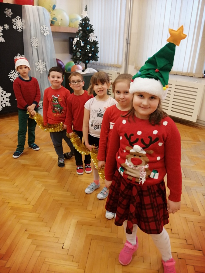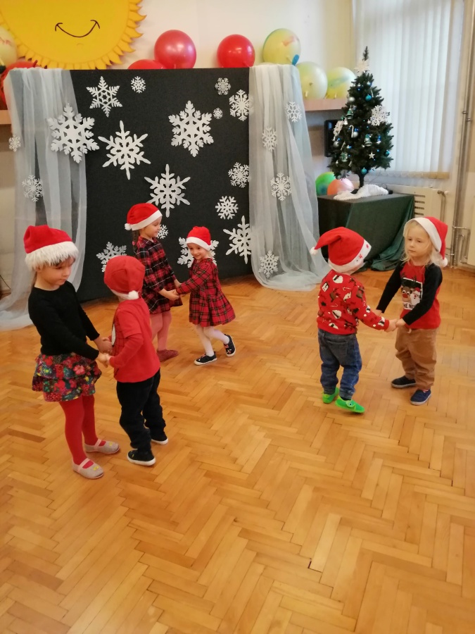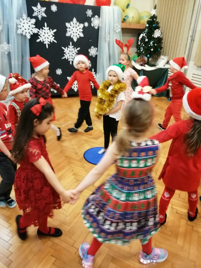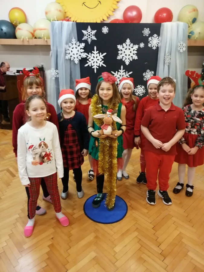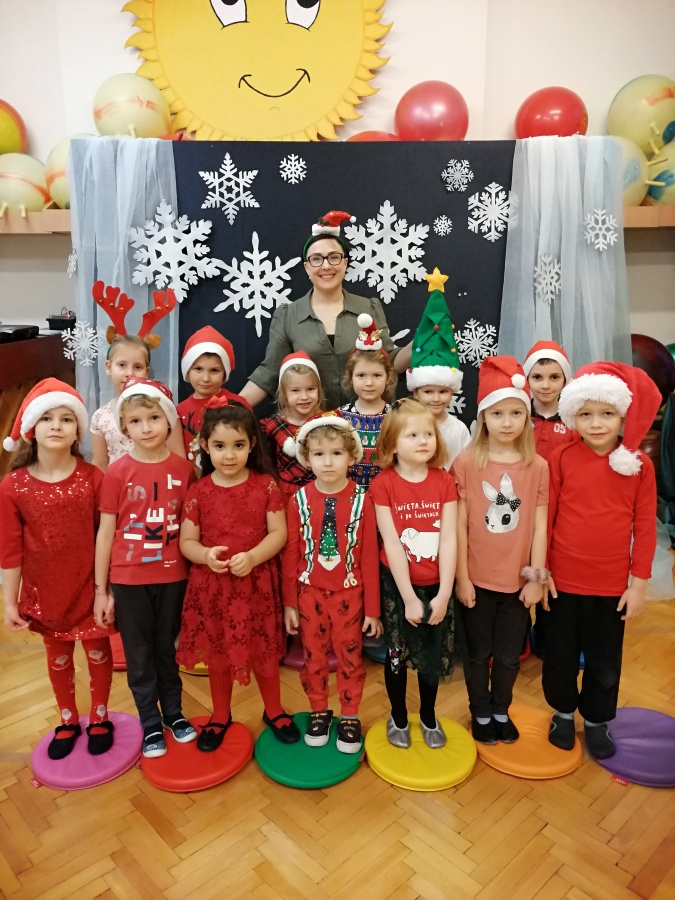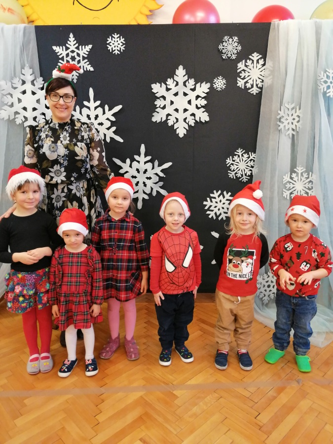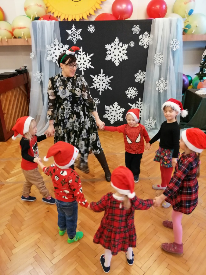 Tym razem spotkanie z Elmerem było wyjątkowe. Czekała na nas bowiem wspaniała zimowa zabawa oraz upominki od Świętego Mikołaja. Wprawdzie nieco później, niż zazwyczaj, ale nie mniej radośnie i świątecznie. W ramach projektu WYCHOWANIE PRZEZ CZYTANIE wysłuchaliśmy opowiadania „Słonięty Mikołaj”, w którym bohaterowie również obchodzili święta, ubierali tropikalną choinkę i wyczekiwali na prezenty. Po wysłuchaniu historii, podtrzymaliśmy świąteczny klimat, śpiewając kolędy i piosenki przygotowane specjalnie dla Świętego Mikołaja. Braliśmy udział w zabawach muzycznych związanych z zimą i bożonarodzeniowymi tradycjami. Nie zabrakło migoczącego blasku kolorofonu oraz świątecznych „hitów”, które porwały nas do tańca. Na koniec spotkania dzieci zostały obdarowane prezentami. Książkami i czekoladowym Mikołajem.