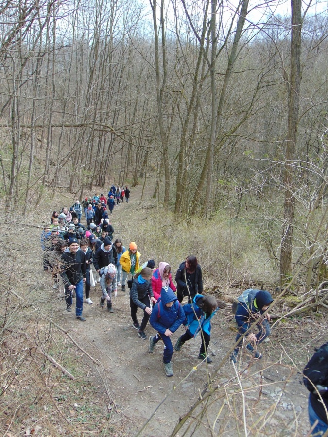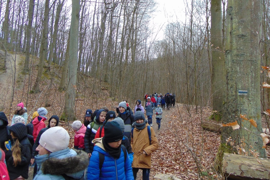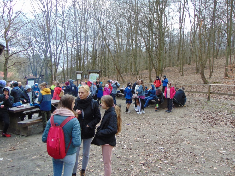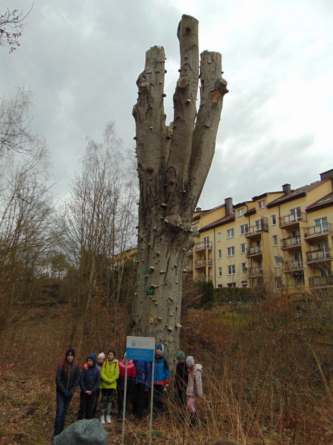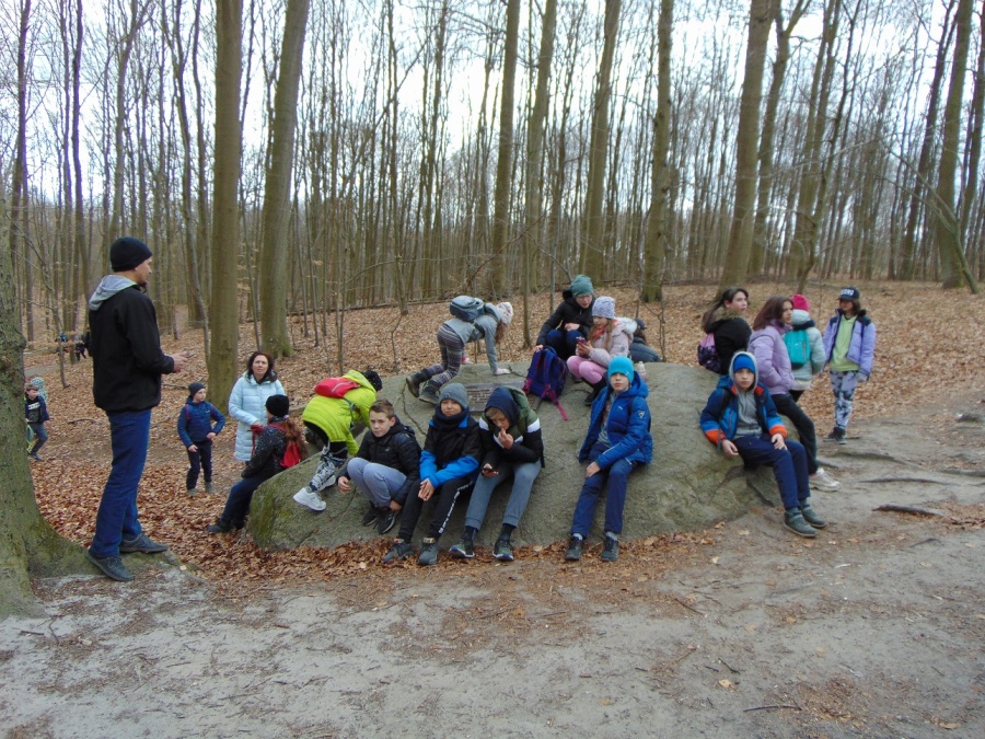 Pogoda była poprawna. Słońce wprawdzie kryło się za chmurami, ale nie było zimno. Pierwszy odpoczynek na zebranie sił przed dalszą drogą był na polanie Harcerskiej. Po krótkiej przerwie ruszyliśmy zielonym szlakiem w stronę leśniczówki Klęskowo. Następnie niebieskim szlakiem doszliśmy do głazu Grońskiego. Mimo, że był to już kwiecień, w puszczy było jeszcze szaro. Ostatnie chłodne dni nie pozwoliły rozwinąć się zieleni. Dochodząc do miejsca złazu czekała nas niemiła niespodzianka! Niegdyś piękny Buk Lipniackiego, po 25 latach od nadania imienia, obumarł! Przykro było patrzeć! Zrobiliśmy jemu pożegnalną fotografię.