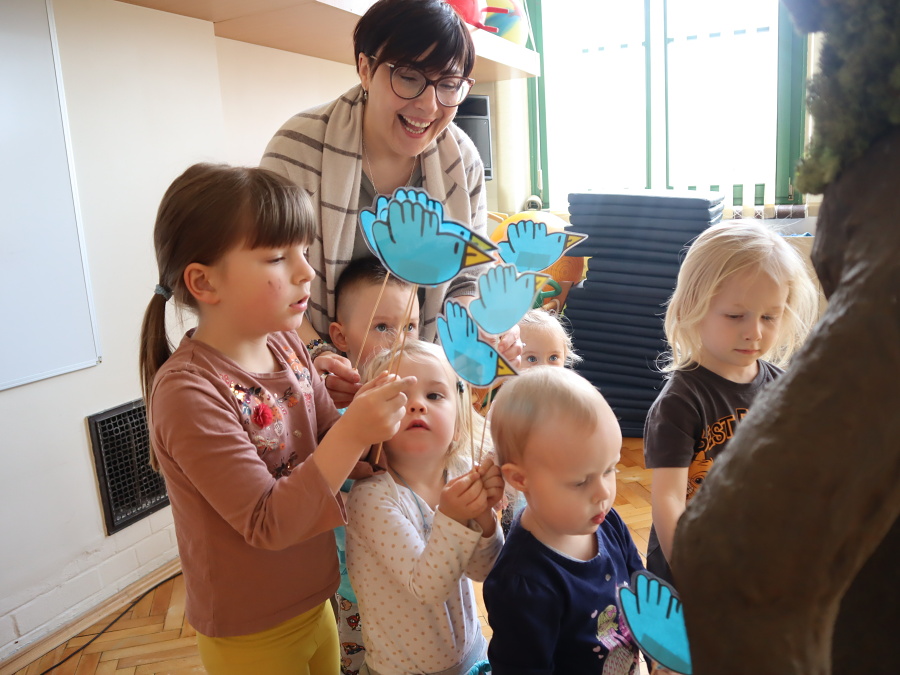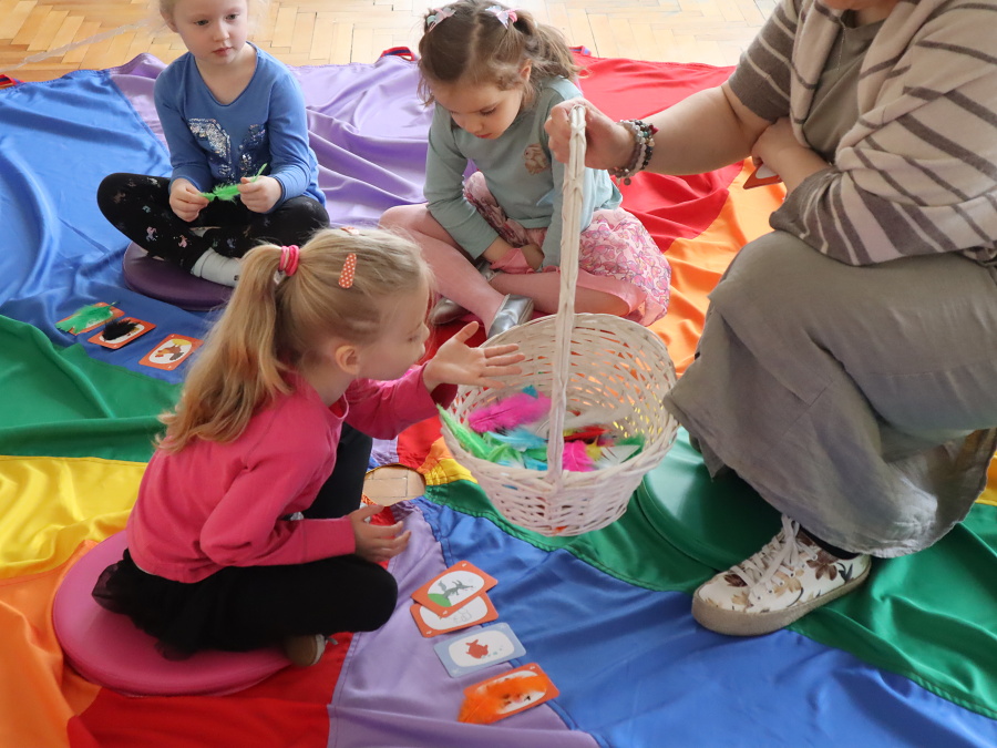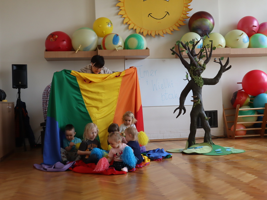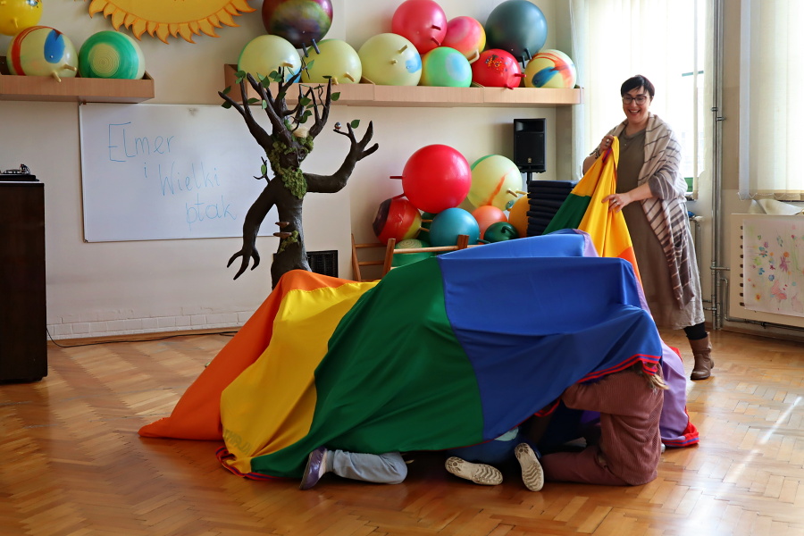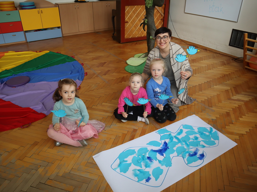 Podczas zajęć aktywizujących odlecieliśmy wraz z PTAKAMI i ilustrowaliśmy ruchem ich przygody zaczerpnięte z książki. Wyzwalaliśmy twórczą energię za pomocą chusty Klanzy. Chroniliśmy małych przyjaciół przed strasznym ptakiem, tworząc wielki cień „ogromnego ptaka” . Trenowaliśmy zmianę głosu, niczym Wilbur – kuzyn Elmera, tak, by nikt nie odgadł kim jesteśmy. Rozpoznawaliśmy trudne emocje – smutek, przerażenie, płacz, złość za pomocą „pacynek emocji” i opowiadaliśmy o tym, kiedy je czujemy.