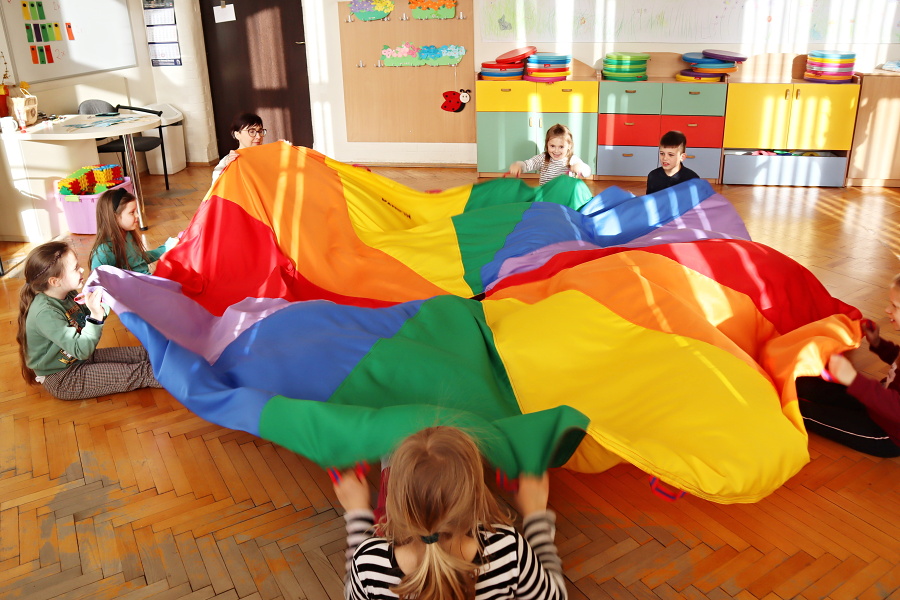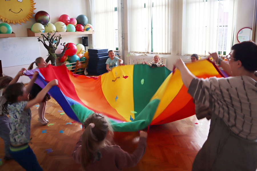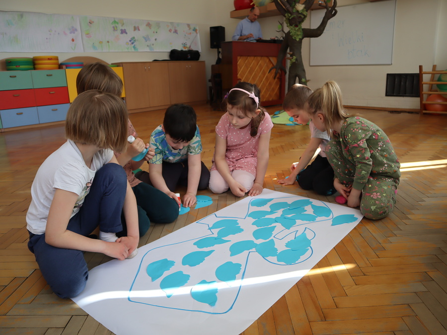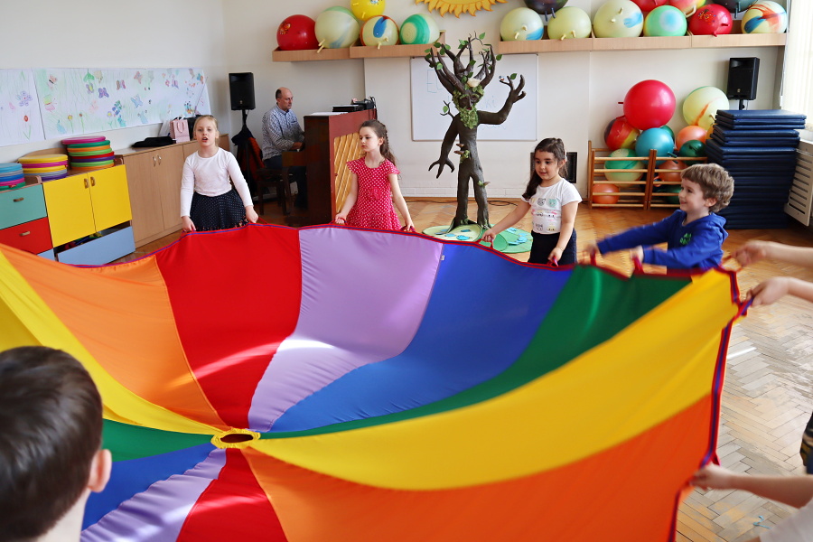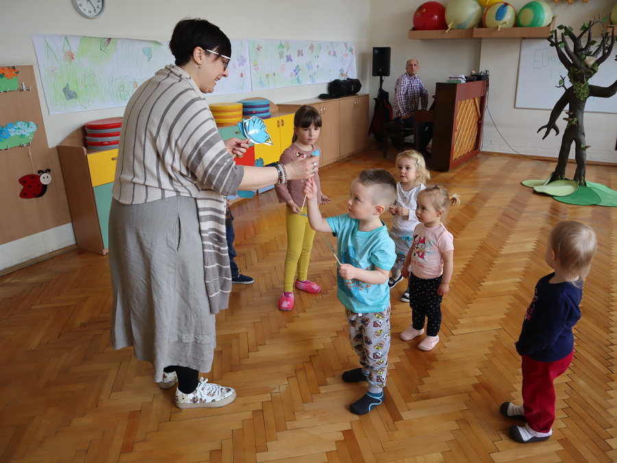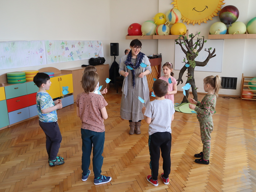 Podczas zajęć aktywizujących odlecieliśmy wraz z PTAKAMI i ilustrowaliśmy ruchem ich przygody zaczerpnięte z książki. Wyzwalaliśmy twórczą energię za pomocą chusty Klanzy. Chroniliśmy małych przyjaciół przed strasznym ptakiem, tworząc wielki cień „ogromnego ptaka” . Trenowaliśmy zmianę głosu, niczym Wilbur – kuzyn Elmera, tak, by nikt nie odgadł kim jesteśmy. Rozpoznawaliśmy trudne emocje – smutek, przerażenie, płacz, złość za pomocą „pacynek emocji” i opowiadaliśmy o tym, kiedy je czujemy.