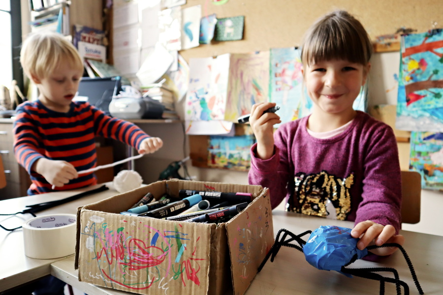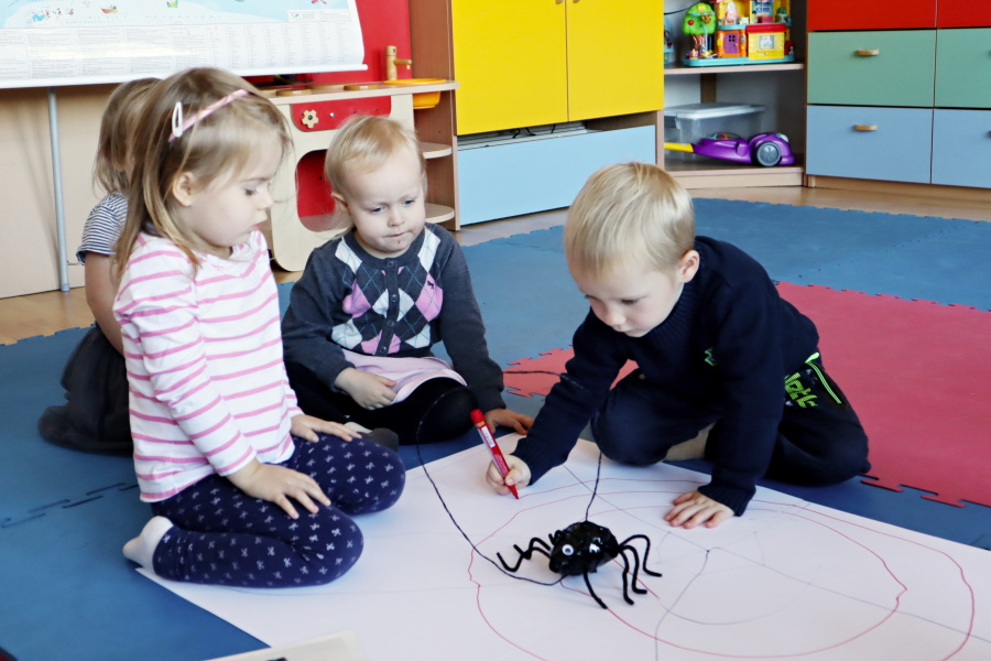 W październiku na zajęciach w Pracowni Plastycznej p. Magdaleny Kucharskiej i w Pracowni z Angielskim przez Świat prowadzonej przez p. Annę Kozłowską, uczestnicy poznali historię małego pajączka z książki Erica Carle’a – „Pajączek” i wersji oryginalnej „The Very Busy Spider”.