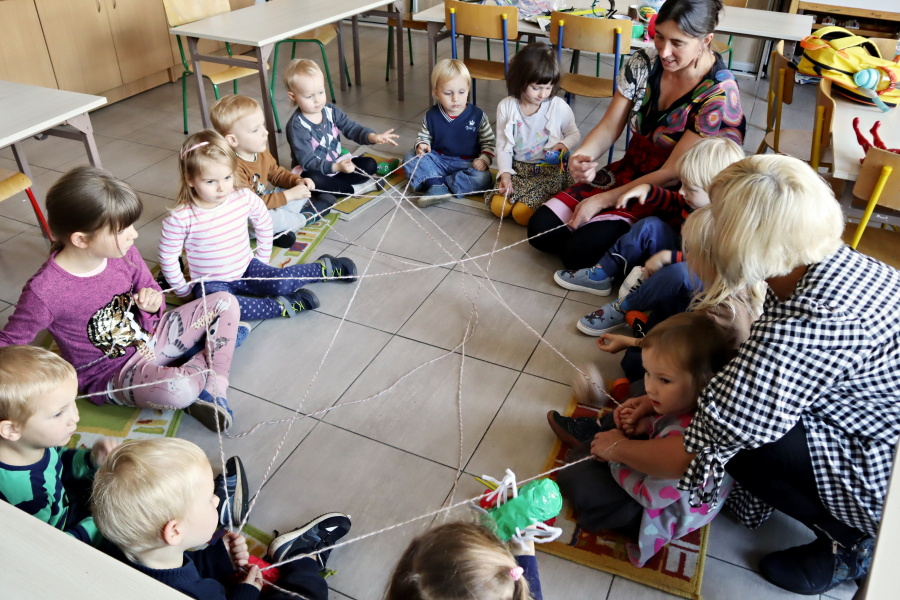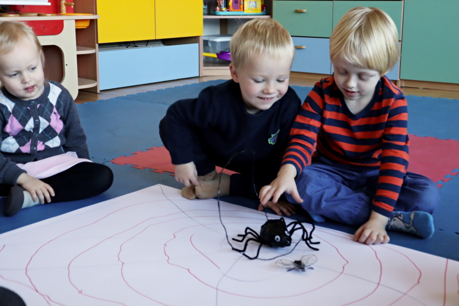 Na zajęciach plastycznych książka Erica Carle’a była naszą inspiracją do namalowania pajęczyny w kolorach jesieni oraz stworzenia własnego pająka z gazet i kolorowych taśm oraz włóczkowej pajęczyny. Była również okazją do bliższego poznania życia tego stawonoga. Spotkanie pajączka z różnymi zwierzętami dało nam możliwość do wielu zabaw dźwiękonaśladowczych i językowych, bo nazwy zwierząt dzieci poznawały również w języku angielskim w Pracowni z Językiem Angielskim przez Świat.