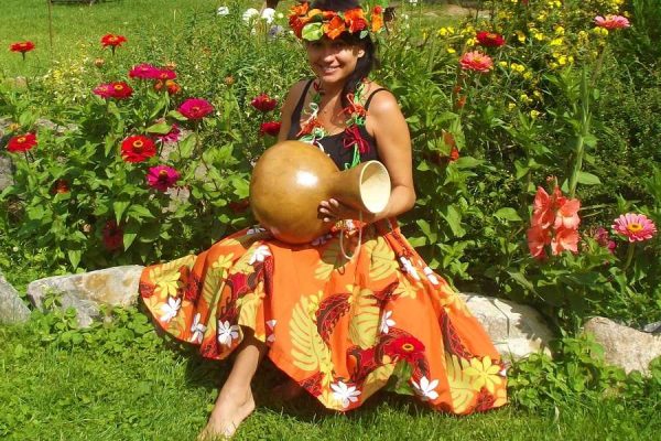 Na zdjęciu p. Justyna tworzy hawajskie IPU, którym wystukuje rytm podczas zajęć tańca hawajskiego hula. Instrument ten wykonała zgodnie z hawajską tradycją podczas warszawskich warsztatów z p. Małgorzatą Szokalską (Szkoła Tańca Hawajskiego Hula MOC ALOHA).