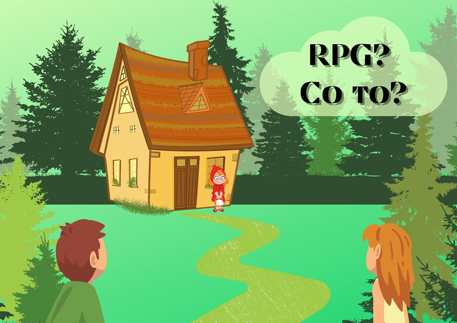 Narratorka opisuje pokrótce drogę, a bohaterowie starają się ją zapamiętać. Tuż przed wyjściem na polanę, otaczającą smakowity domek, Narratorka opisuje, że u jego drzwi stoi osoba ubrana w czerwony kubraczek. Nasi gracze ponownie słyszą pytanie „Co robicie?”. Czy Jaś i Małgosia podejdą do Czerwonego Kapturka? Czy może poczekają na rozwój zdarzeń? Czy rzuty kością pozwolą im przekonać dziewczynkę, że domek do którego dotarła na pewno nie należy do jej chorowitej babci? To już zależy od wyników rzutów i ich decyzji.