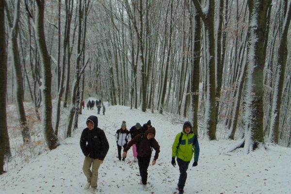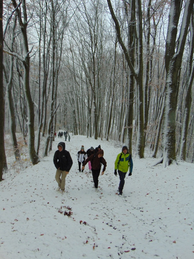 Ranek 19 listopada przyniósł nam wielką niespodziankę! Padał śnieg – taki prawdziwy, gęsty i biały! Mówią, że nic nas nie zaskoczy, ale zaskoczył nas widok białego puchu o tej porze. I nie tylko nas zaskoczył. Na miejsce zbiórki 1038 Leśnej Soboty – na pętlę Podbórz – nie dotarły autobusy komunikacji miejskiej i dwie grupy zmuszone były zmienić swoje plany rajdowe. Uczniowie ze szkoły podstawowej nr 74 z Bukowego dotarli do wieży Bismarcka z Bramy Portowej, a grupa ze szkoły podstawowej nr 11 powędrowała trasą po parku Kasprowicza. Z ponad półgodzinnym opóźnieniem na Podbórz dotarło 5 osób – 4 ze szkoły podstawowej nr 37 i jeden indywidualny entuzjasta aktywnego wypoczynku.