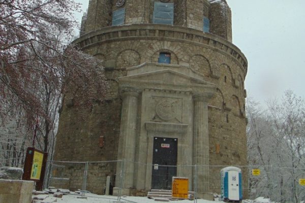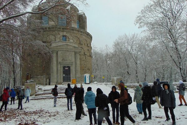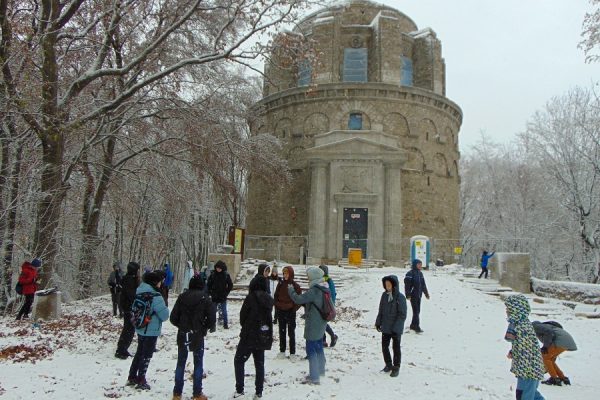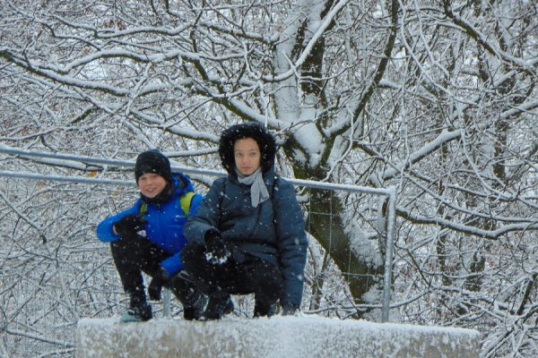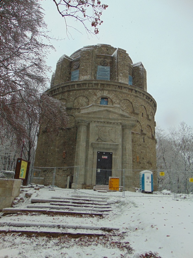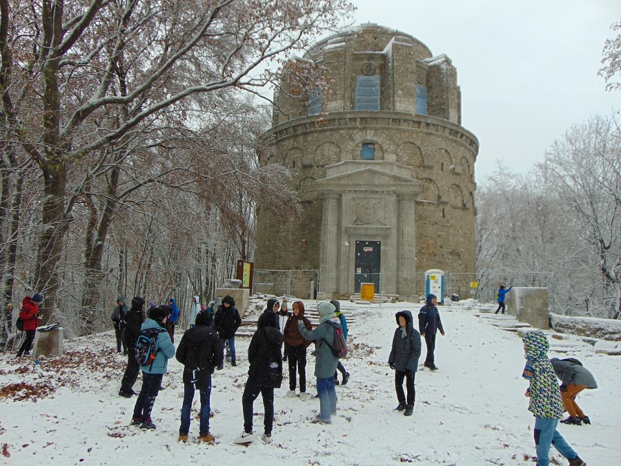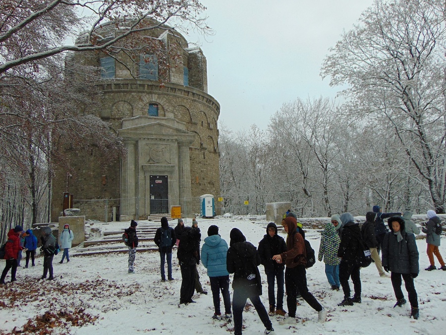 Ruszyliśmy żółtym szlakiem w kierunku Wysokiego Stawu. Las wyglądał pięknie! Padał śnieg i mróz szczypał w nosy. Ponieważ mieliśmy duże opóźnienie, postanowiliśmy dojść tylko do platformy widokowej nad Wysokim Stawem i wrócić na pętlę. Potem pojechaliśmy na Gocław i wdrapaliśmy się na Zielone Wzgórze, na którym stoi dumna Wieża Bismarcka.