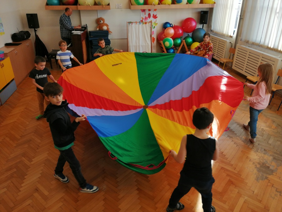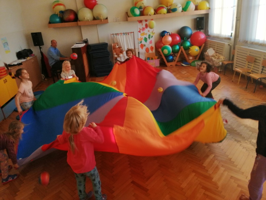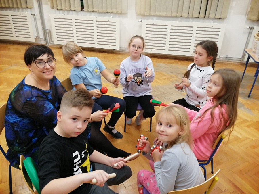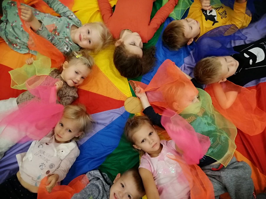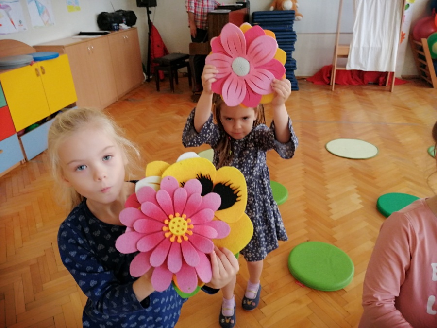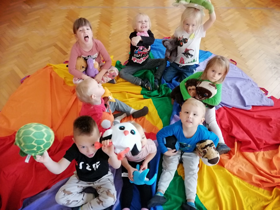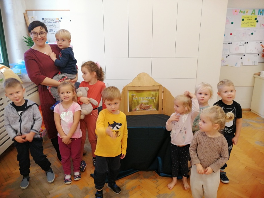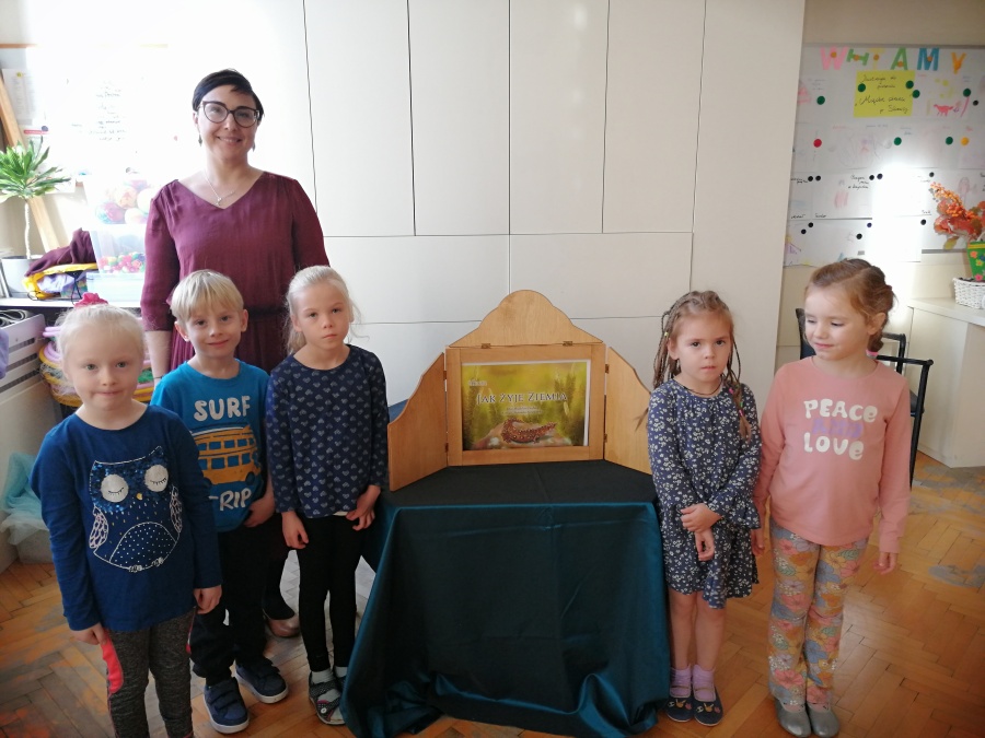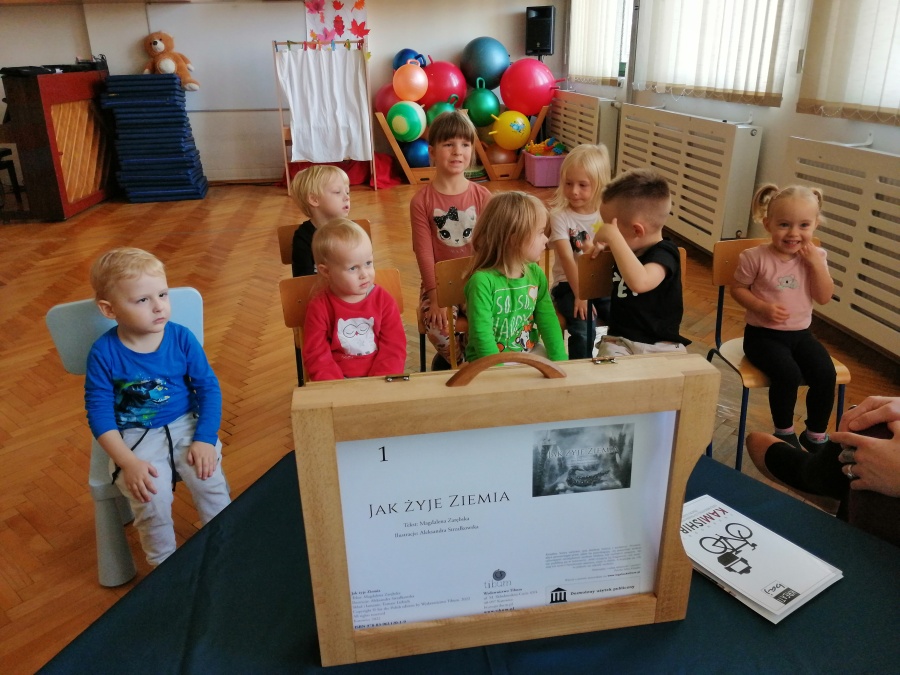 Dzieci były pod wrażeniem tajemniczej skrzynki i z uwagą wysłuchały opowieści pt. „JAK ŻYJE ZIEMIA”. Duże plansze z przepięknymi ilustracjami, oryginalny tekst oraz wyciszające dźwięki przyrody w tle, przyczyniły się do większego skupienia oraz autentycznego przeżywania. Po zamknięciu skrzynki rozpoczęliśmy zabawy aktywizujące, twórcze, integracyjne i instrumentalne, które odnosiły się do tematyki wysłuchanej opowieści.