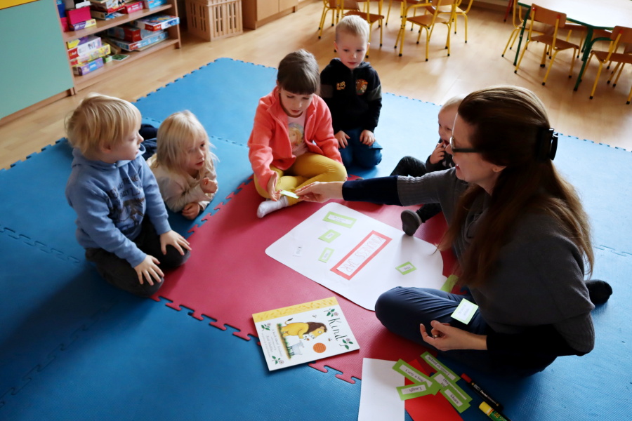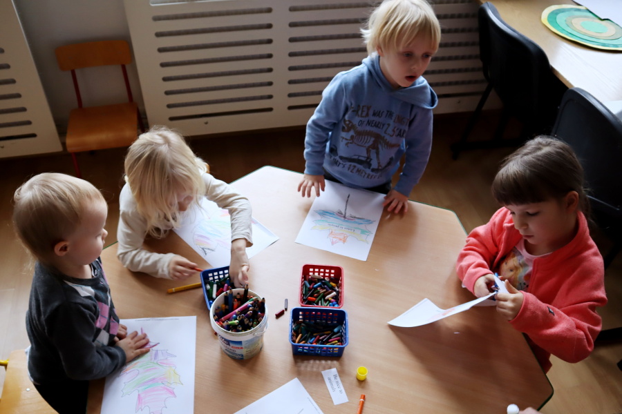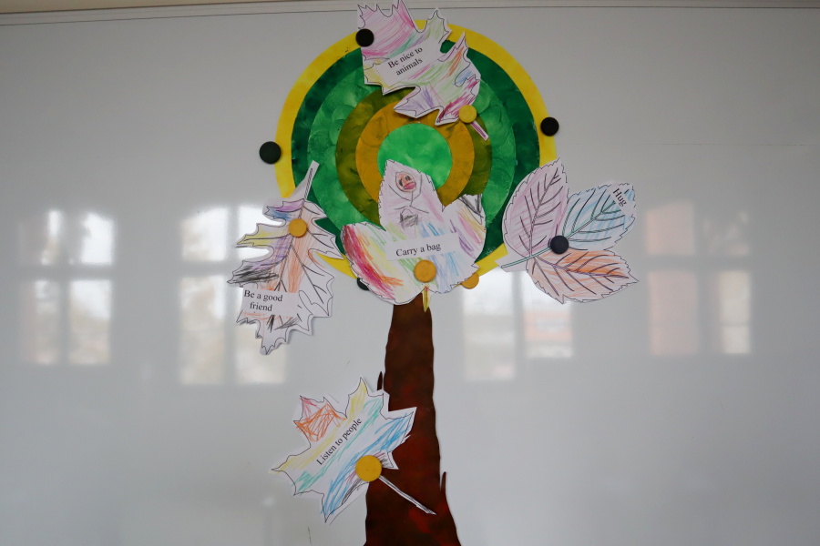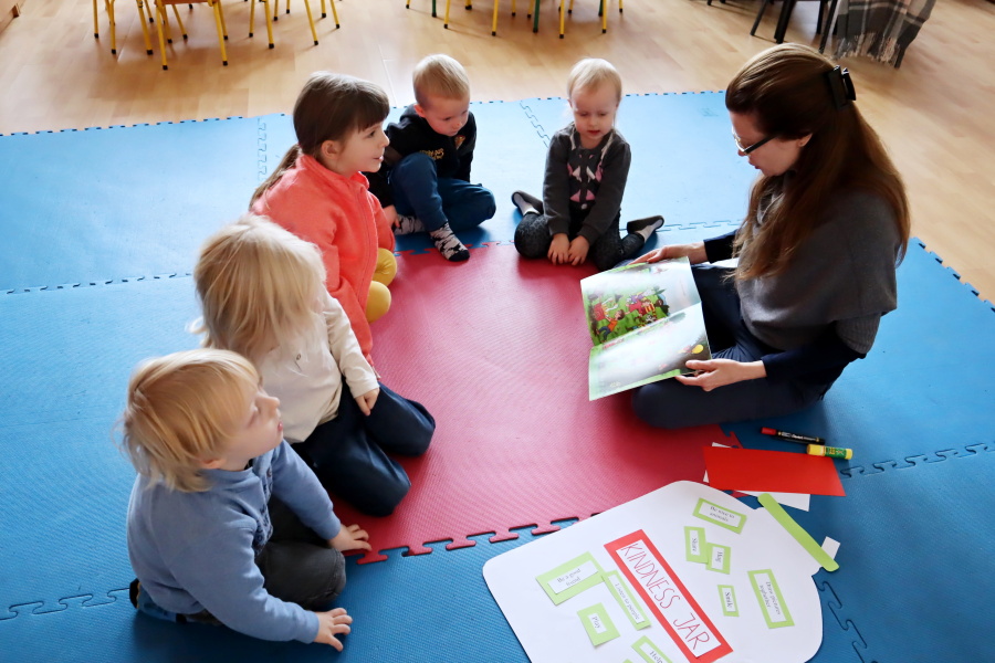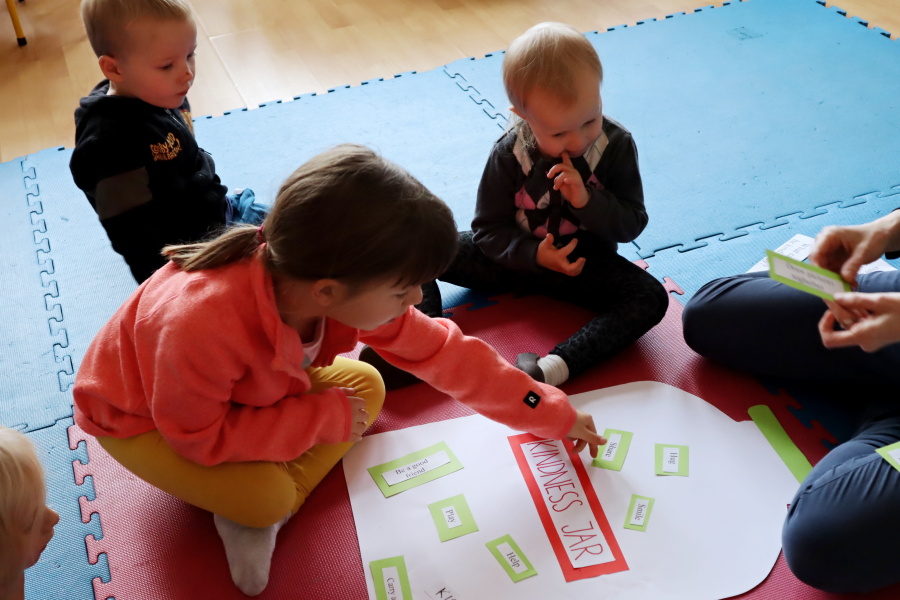 Książka „Kind”, której autorem jest Alison Green zachwyciła ich kolorami i zainspirowała przesłaniem „Bądźmy dobrzy!”. Przy okazji lektury nie zabrakło powtórek z języka angielskiego. Dzieci przypomniały sobie i poznały wiele nowych słów dotyczących życzliwości. Do „słoika życzliwości” wrzucały hasła, które mówią o tym jak być miłym i pomagać innym.