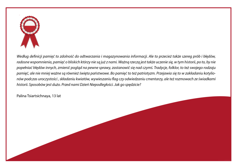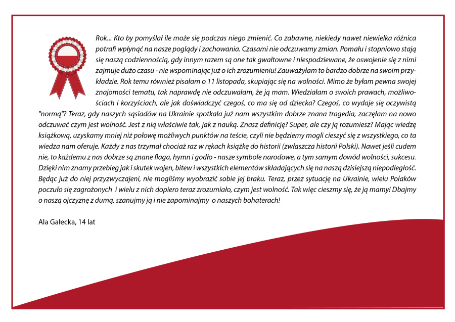 Zbliżające się święto, które obchodzimy, by upamiętnić odzyskanie niepodległości przez Polskę, często skłania nas do wielu refleksji. Uczestnicy Pracowni Dziennikarskiej (nauczyciel: Iwona Gacparska) w swoich tekstach przypominają o tym, jak ważna jest PAMIĘĆ, WOLNOŚĆ I NIEPODLEGŁOŚĆ.