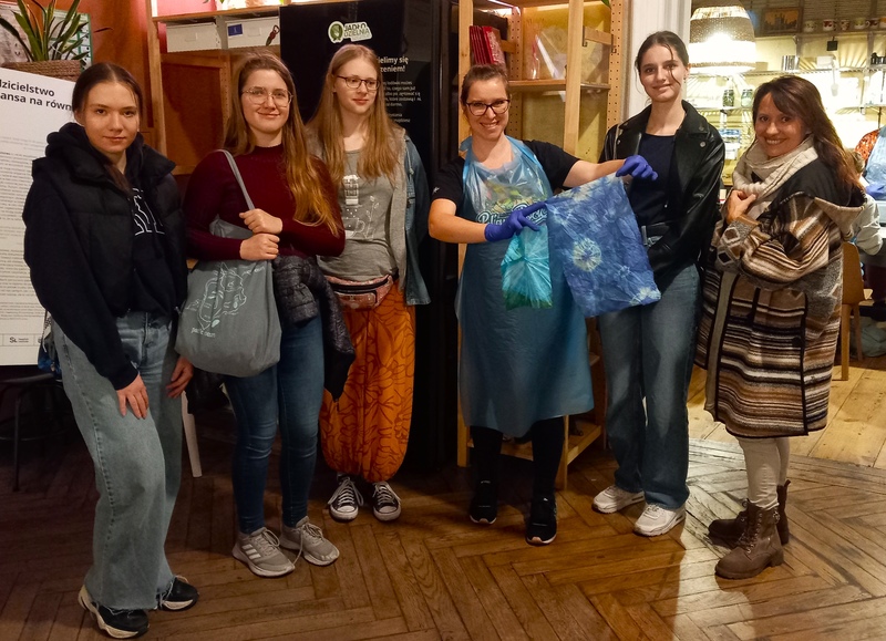 W jego przestrzeniach odbywały się jednocześnie warsztaty farbowania tkanin metodą shibori z p. Aleksandrą Gisges Dalecką – Kuratorką Festiwalu Tkaniny. Dziewczęta zobaczyły efekty pracy uczestniczek tych warsztatów, w tym p. Anny Rink – pałacowej Dekoratorki. Tę technikę barwienia dziewczęta poznały już wcześniej podczas Etnicznych Warsztatów Twórczych z ich nauczycielką tańca etnicznego w Pałacu Młodzieży.