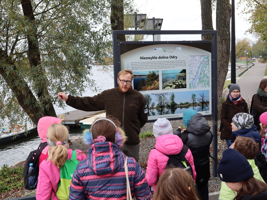 Po wejściu na punkt widokowy z kamiennym siedziskiem, wszyscy mogli podziwiać piękną panoramę doliny Odry z Międzyodrzem. Do dokładniejszych obserwacji bardzo przydały się lornetki!