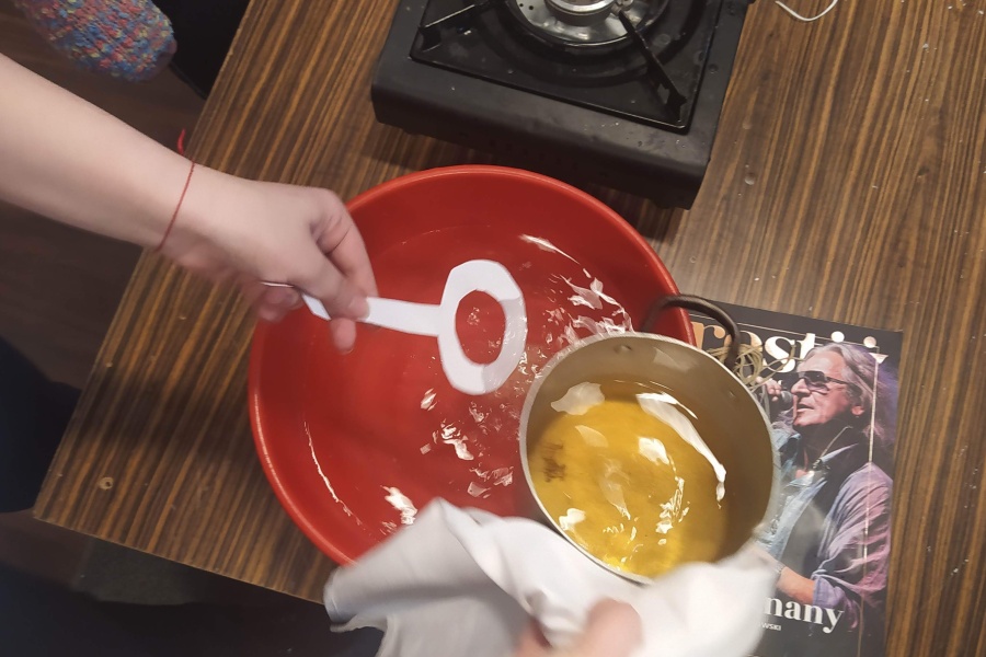 Uczestnicy zajęć w grupie DELL`ARTE Pracowni Teatralno-Muzycznej Iwony Faj i Iwony Szary postanowili uczcić dawne zwyczaje andrzejkowe czyniąc najbardziej popularną wróżbę czyli „lanie wosku”. Najbardziej emocjonującym momentem było odczytywanie znaczeń cienia woskowego tworu. Tegoroczne kształty były tak różnorodne i nieoczywiste, że pomysłów, co do ich znaczeń, było mnóstwo, wzbudzając co chwila lawiny śmiechu.