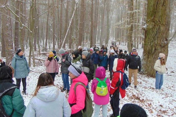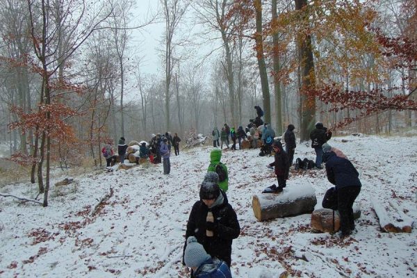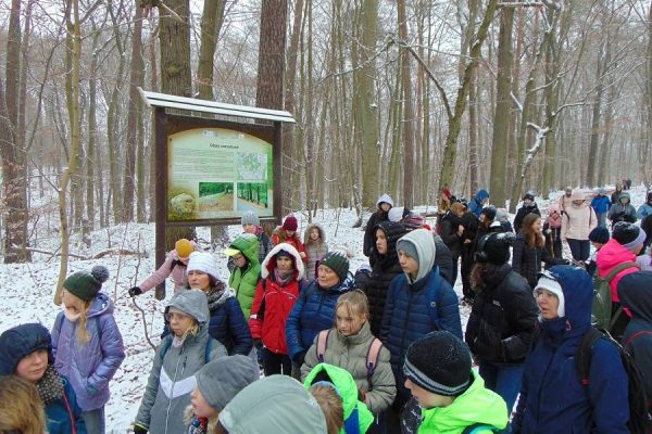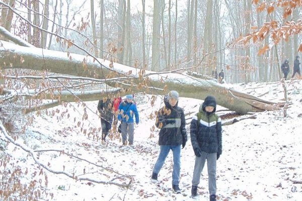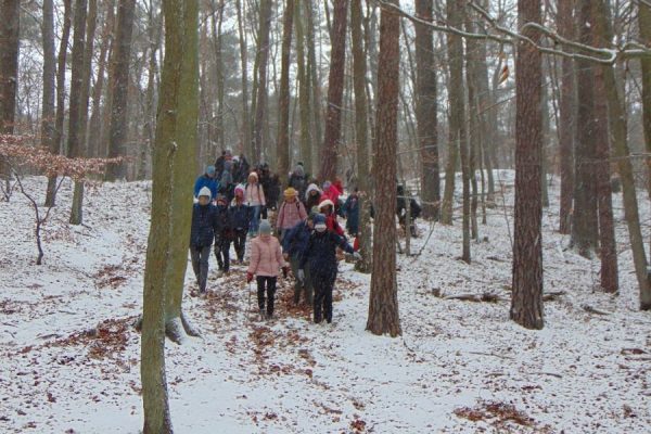 3 grudnia spotkaliśmy się przy jeziorze Szmaragdowym. Padał deszcz ze śniegiem i było zimno, ale chętnych do sobotniej wędrówki było równo 80 osób. Ruszyliśmy niebieskim szlakiem w stronę polany Psie Pole. Podziwialiśmy zimową Puszczę Bukową. Na trasie było trochę niespodzianek w postaci trudnych (śliskich) podejść i zwalonych drzew, które utrudniały przejścia. Z okazji zbliżających się Mikołajek wszyscy dostali po cukierku. Po krótkim odpoczynku na trasie ruszyliśmy w dalszą wędrówkę, którą zakończyliśmy pod wiaduktem autostradowym na ul. Smoczej. Na miejsce złazu dotarli jeszcze uczniowie z ZSEE.