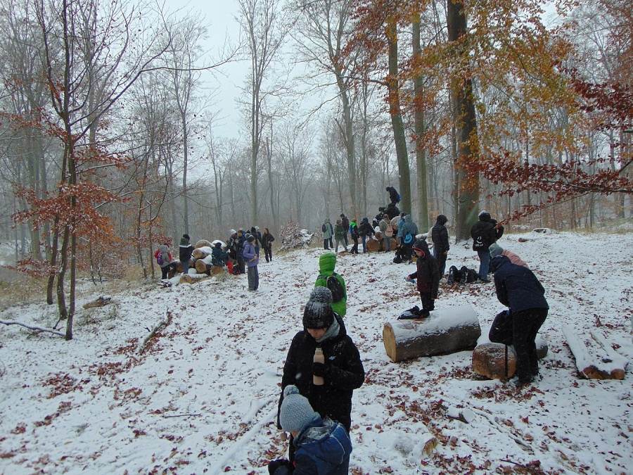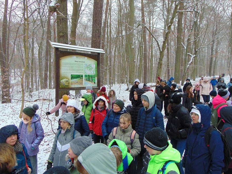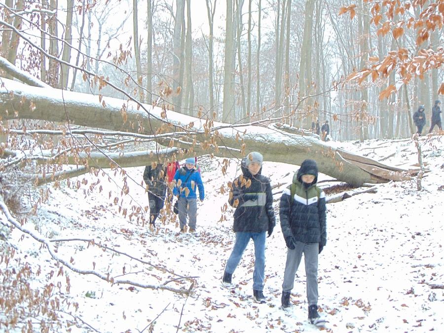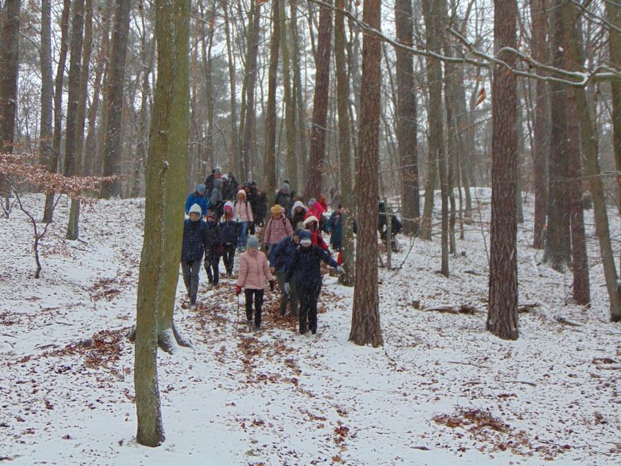3 grudnia spotkaliśmy się przy jeziorze Szmaragdowym. Padał deszcz ze śniegiem i było zimno, ale chętnych do sobotniej wędrówki było równo 80 osób. Ruszyliśmy niebieskim szlakiem w stronę polany Psie Pole. Podziwialiśmy zimową Puszczę Bukową. Na trasie było trochę niespodzianek w postaci trudnych (śliskich) podejść i zwalonych drzew, które utrudniały przejścia. Z okazji zbliżających się Mikołajek wszyscy dostali po cukierku. Po krótkim odpoczynku na trasie ruszyliśmy w dalszą wędrówkę, którą zakończyliśmy pod wiaduktem autostradowym na ul. Smoczej. Na miejsce złazu dotarli jeszcze uczniowie z ZSEE.