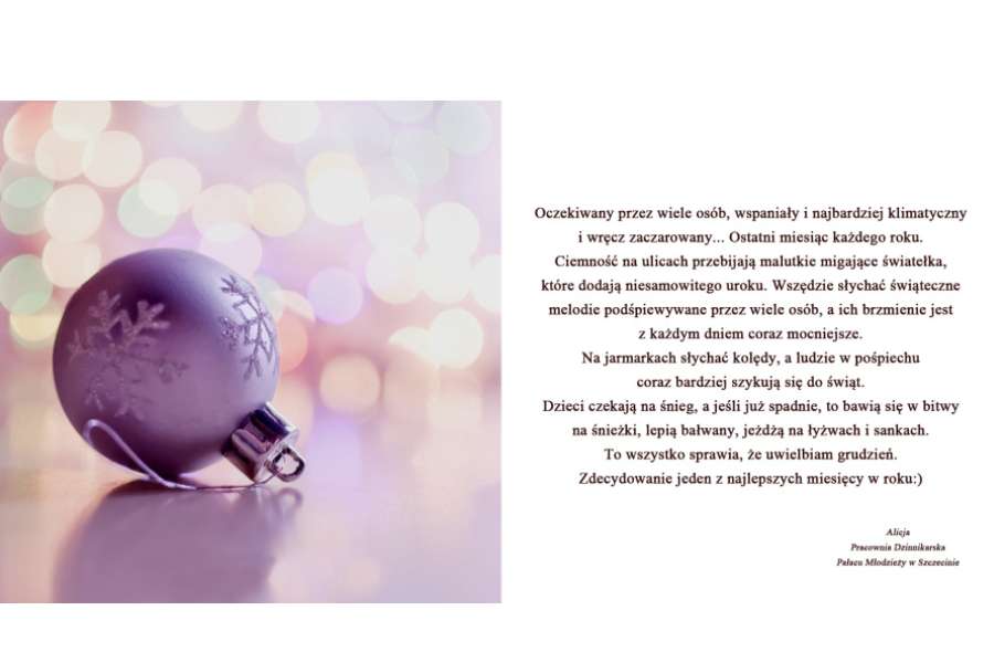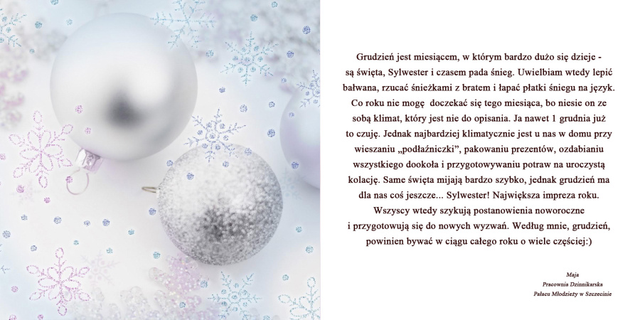 Grudzień jest miesiącem, w którym bardzo dużo się dzieje – są święta, Sylwester i czasem pada śnieg. Uwielbiam wtedy lepić bałwana, rzucać śnieżkami z bratem i łapać płatki śniegu na język. Co roku nie mogę doczekać się tego miesiąca, bo niesie on ze sobą klimat, który jest nie do opisania. Ja nawet 1 grudnia już to czuję. Jednak najbardziej klimatycznie jest u nas w domu przy wieszaniu „podłaźniczki”, pakowaniu prezentów, ozdabianiu wszystkiego dookoła i przygotowywaniu potraw na uroczystą kolację. Same święta mijają bardzo szybko, jednak grudzień ma dla nas coś jeszcze… Sylwester! Największa impreza roku. Wszyscy wtedy szykują postanowienia noworoczne i przygotowują się do nowych wyzwań. Według mnie, grudzień, powinien bywać w ciągu całego roku o wiele częściej:)