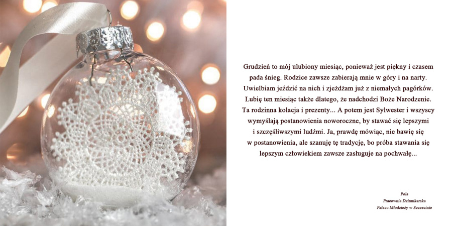 Grudzień to mój ulubiony miesiąc, ponieważ jest piękny i czasem pada śnieg. Rodzice zawsze zabierają mnie w góry i na narty. Uwielbiam jeździć na nich i zjeżdżam już z niemałych pagórków. Lubię ten miesiąc także dlatego, że nadchodzi Boże Narodzenie. Ta rodzinna kolacja i prezenty… A potem jest Sylwester i wszyscy wymyślają postanowienia noworoczne, by stawać się lepszymi i szczęśliwszymi ludźmi. Ja, prawdę mówiąc, nie bawię się w postanowienia, ale szanuję tę tradycję, bo próba stawania się lepszym człowiekiem zawsze zasługuje na pochwałę…