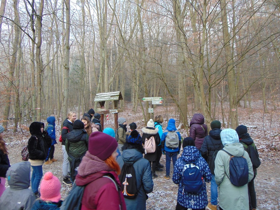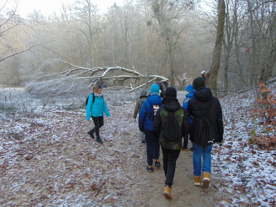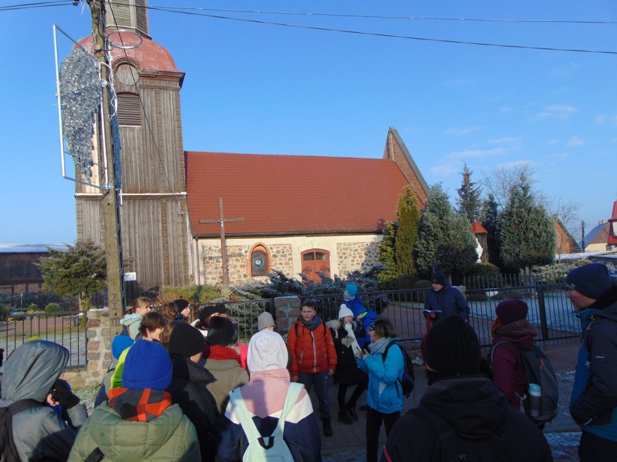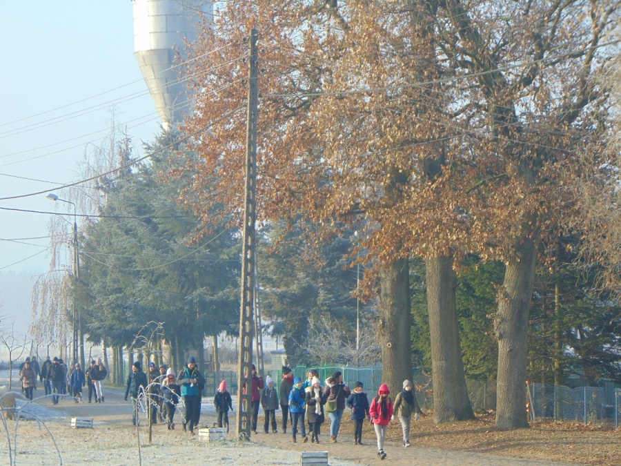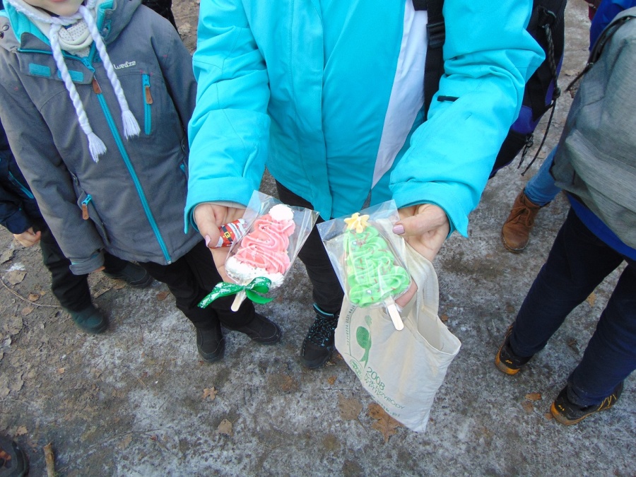 Wybraliśmy się na wędrówkę aż do Przęsocina. Na miejsce zbiórki, na Osowie, przyjechała młodzież z pięciu szkół. Ruszyliśmy czerwonym szlakiem w stronę Szczecińskiej Gubałówki. Podziwialiśmy zimowy las. Po przejściu Osówki weszliśmy na zielony szlak, którym dotarliśmy do najwyższego wzniesienia Wzgórz Warszewskich – Wieleckiej Góry. Na krótki odpoczynek zatrzymaliśmy się na parkingu za górą. Każdy rozgrzał się ciepłą herbatką i wzmocnił swoje siły małym „co nieco”. Były też różne słodkie rzeczy – cukierki i ręcznie robione, przez Michalinę i Klarę z mamą, świąteczne lizaki. Do kościoła w Przęsocinie pozostało nam jeszcze ok. 2 km, które szybko pokonaliśmy. Przed samą wsią pobiegaliśmy po zaoranym, zmarzniętym polu! Na zakończenie tej, ostatniej w tym roku, Leśnej Soboty życzyliśmy sobie Wesołych Świąt oraz szczęścia i powodzenia w Nowym Roku.