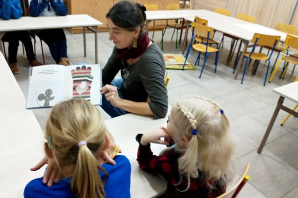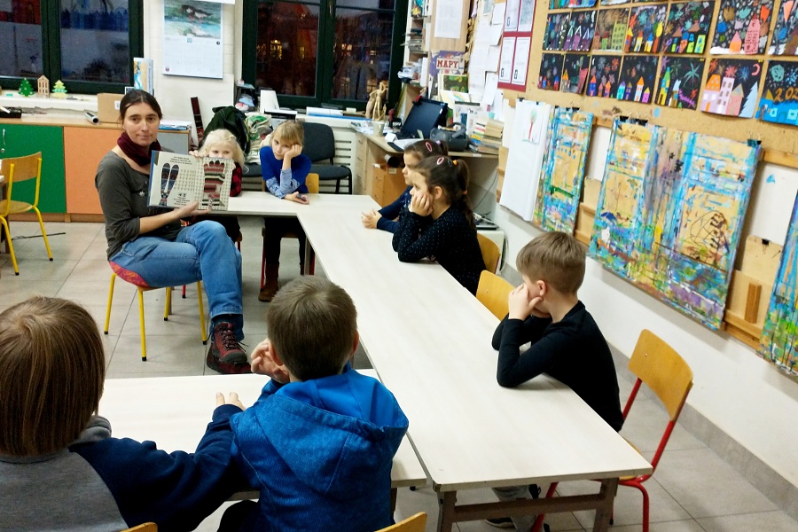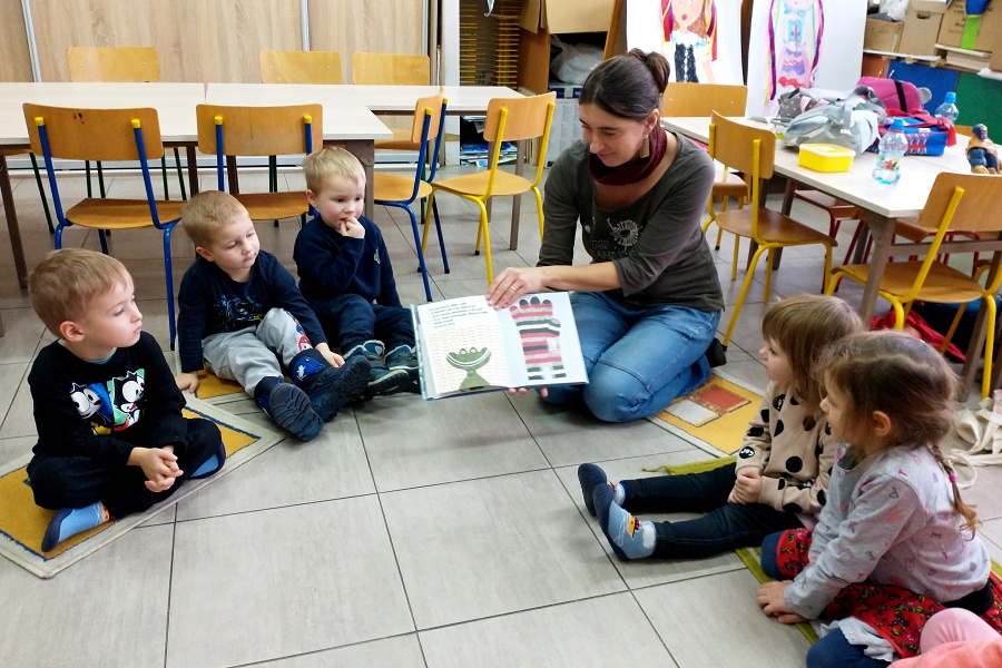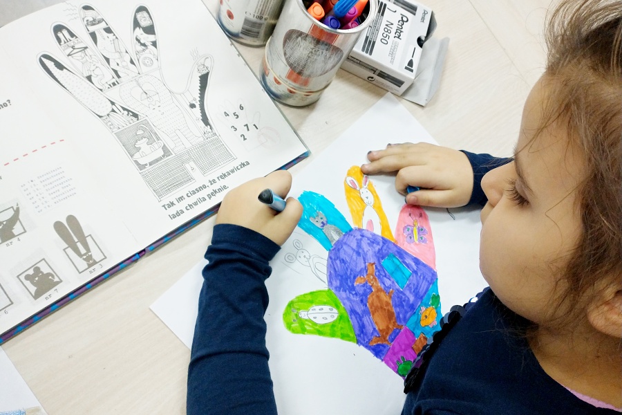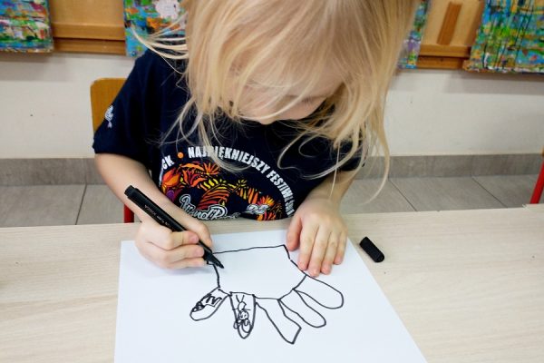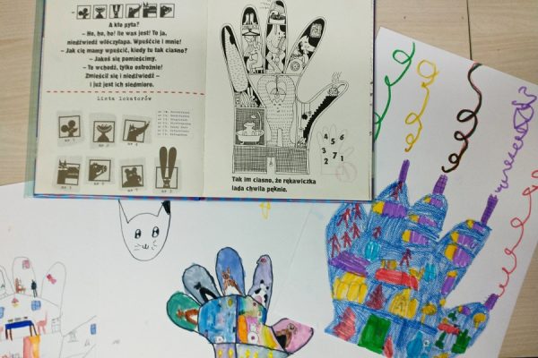 W grudniu aby poczuć zimowy klimat przeczytaliśmy ukraińską bajkę „Rękawiczka”. To zabawna historyjka o tym, kto może się zmieścić w jednej zgubionej rękawiczce. Dzięki tej historii dzieci użyły wyobraźni do zaprojektowania własnego domku w kształcie rękawiczki i poznały pojęcie przekroju.