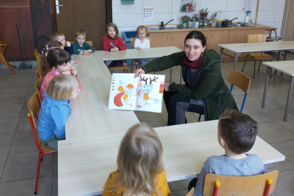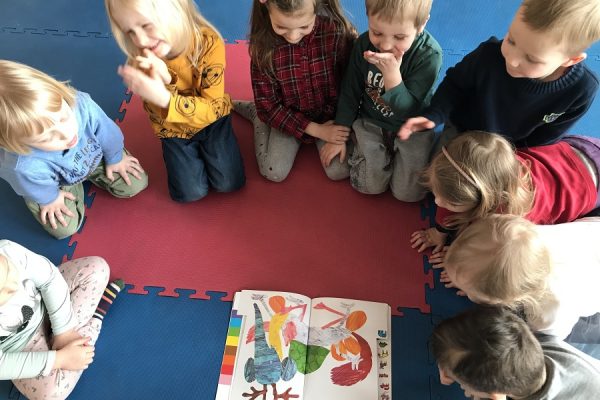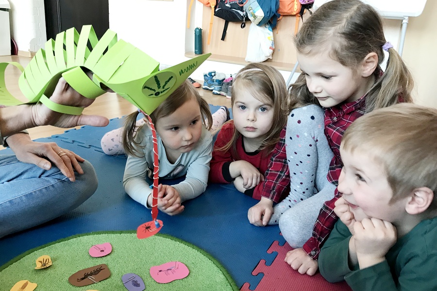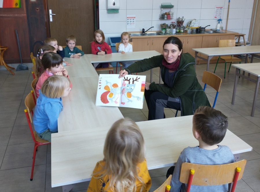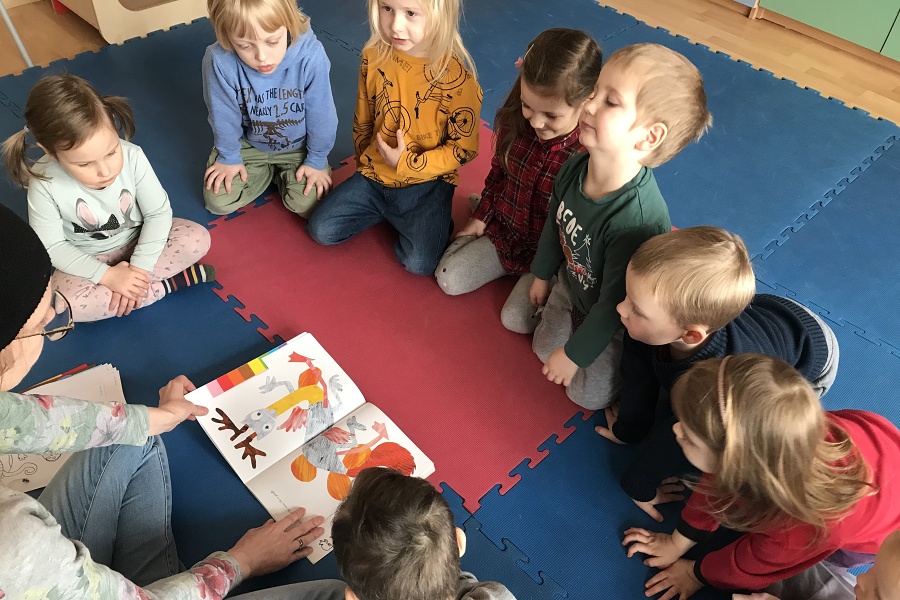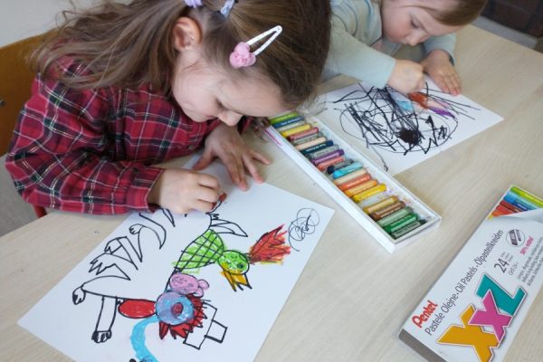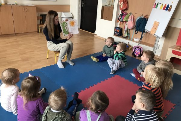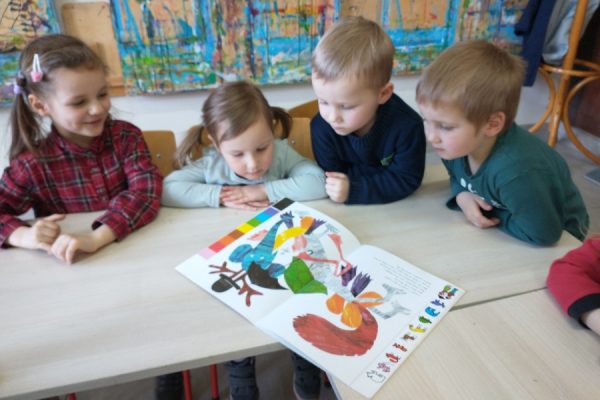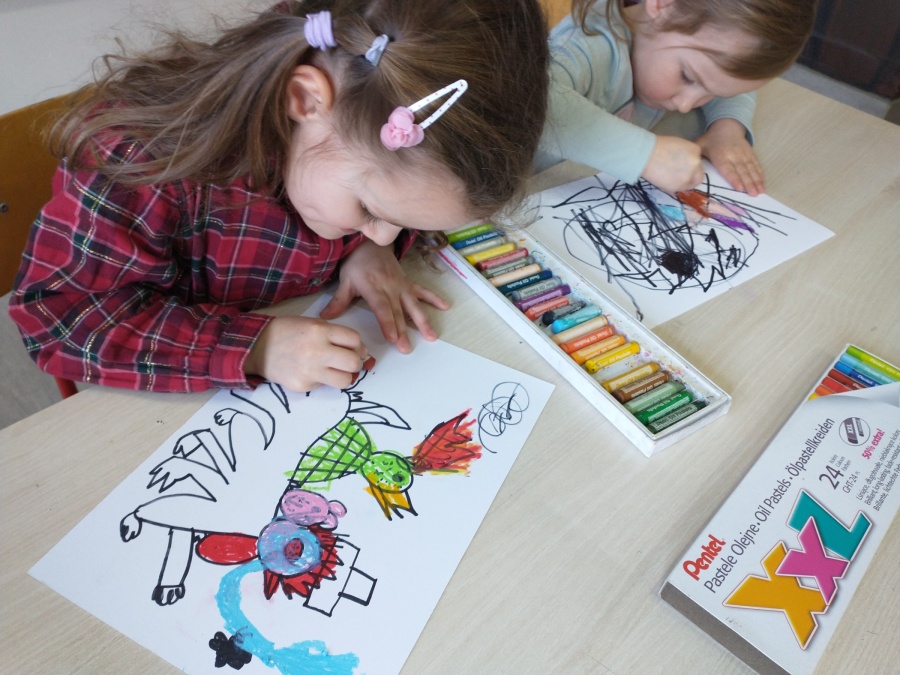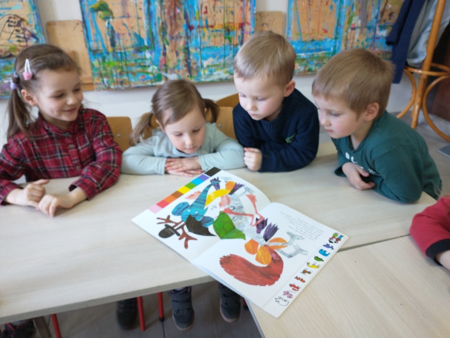 W lutym w ramach projektu Wychowanie przez Czytanie w Pracowni z Językiem Angielskim przez Świat przeczytaliśmy książeczkę pt . „The mixed/up chameleon”. Dzieci poznały ciekawostki z życia tego kameleona oraz nazwy innych zwierząt. Podczas zabaw ruchowych ćwiczyły wyczucie przestrzeni, a podczas „karmienia”- utrwalały nazwy kolorów i uczyły się nazw owadów. W Pracowni Plastycznej pod kierunkiem Magdaleny Kucharskiej, dzieci po przeczytaniu książki o kolorowym kameleonie, użyły swojej fantazji i próbowały narysować „zmiksowanego” zwierzaka, który miał trochę z kameleona, słonia, ptaka, żółwia….