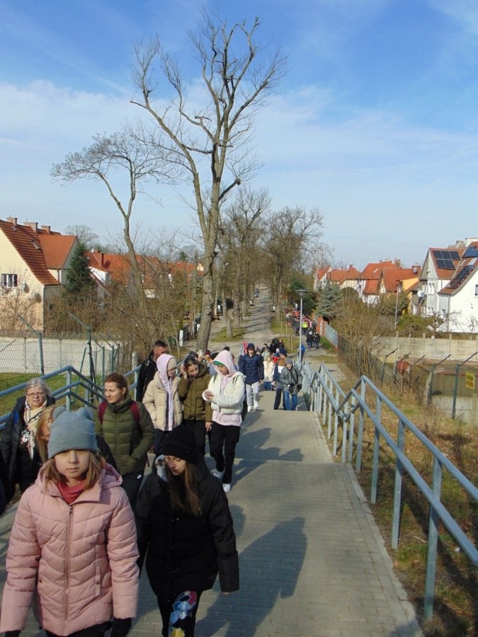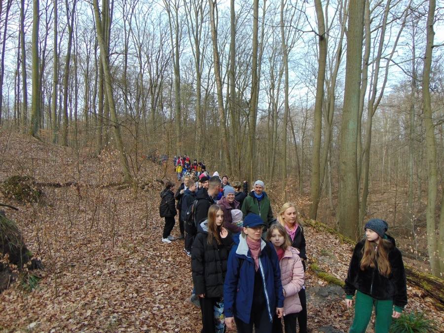 Pogoda była wspaniała! Całkiem nie zimowa. Czarnym szlakiem dotarliśmy do wiaduktu na ulicy Smoczej. Tą sama trasą wędrowali turyści, którzy wybrali się na XL Rajd Szlakiem Artylerzystów Polskich organizowany przez KTP Wiercipięty. Za wiaduktem weszliśmy na żółty szlak, który doprowadził nas do Drogi Chojnowskiej. Po prawej stronie na wzniesieniu był Szwedzki Kamień. Gdy doszliśmy do Grobli Zielawy była przerwa na wzmocnienie sił i odpoczynek. Stąd poprowadził nas do celu czerwony szlak.