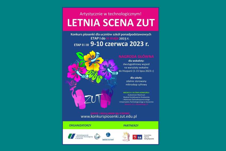 Zachodniopomorski Uniwersytet Technologiczny w Szczecinie wraz z Chórem Kameralnym ZUT, Fundacją Morze Kultury, oraz partnerami: Pałacem Młodzieży w Szczecinie i Szczecińską Agencją Artystyczną zaprasza uczniów szkół ponadpodstawowych z muzycznymi talentami na I Konkurs Piosenki Artystycznie w technologicznym- LETNIA SCENA ZUT!