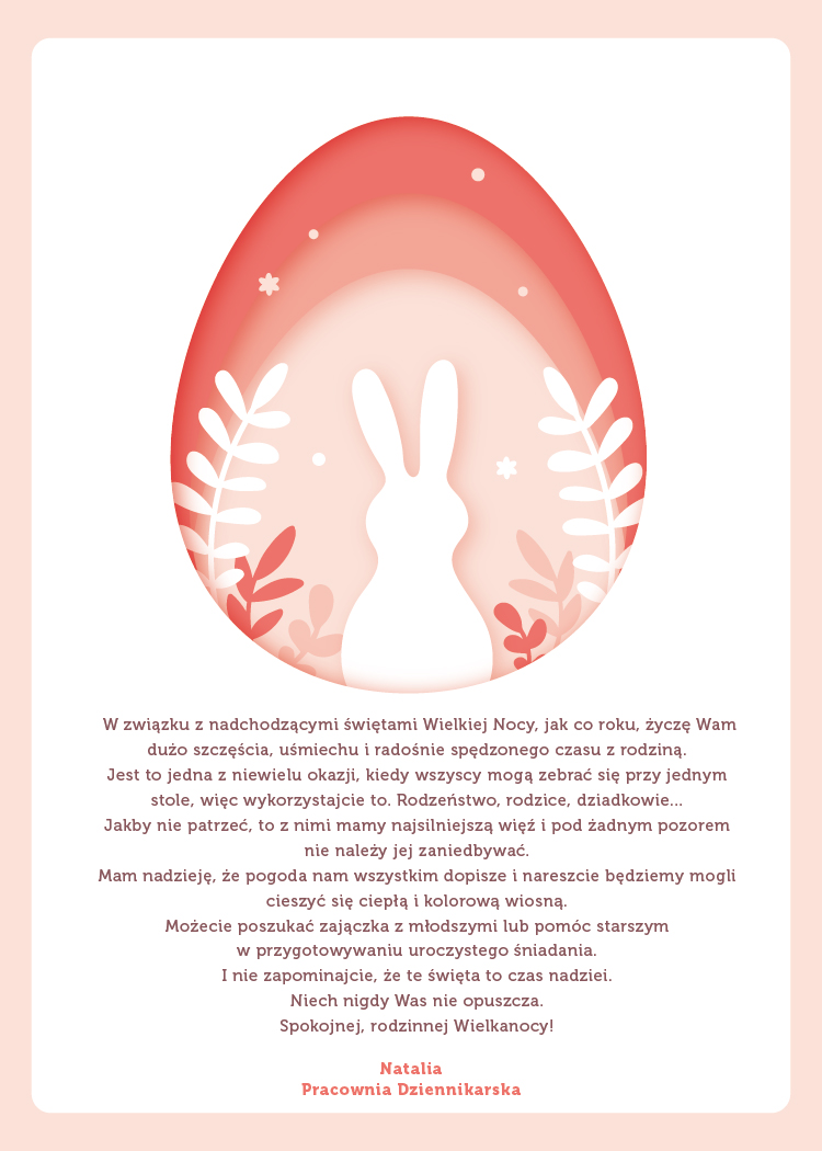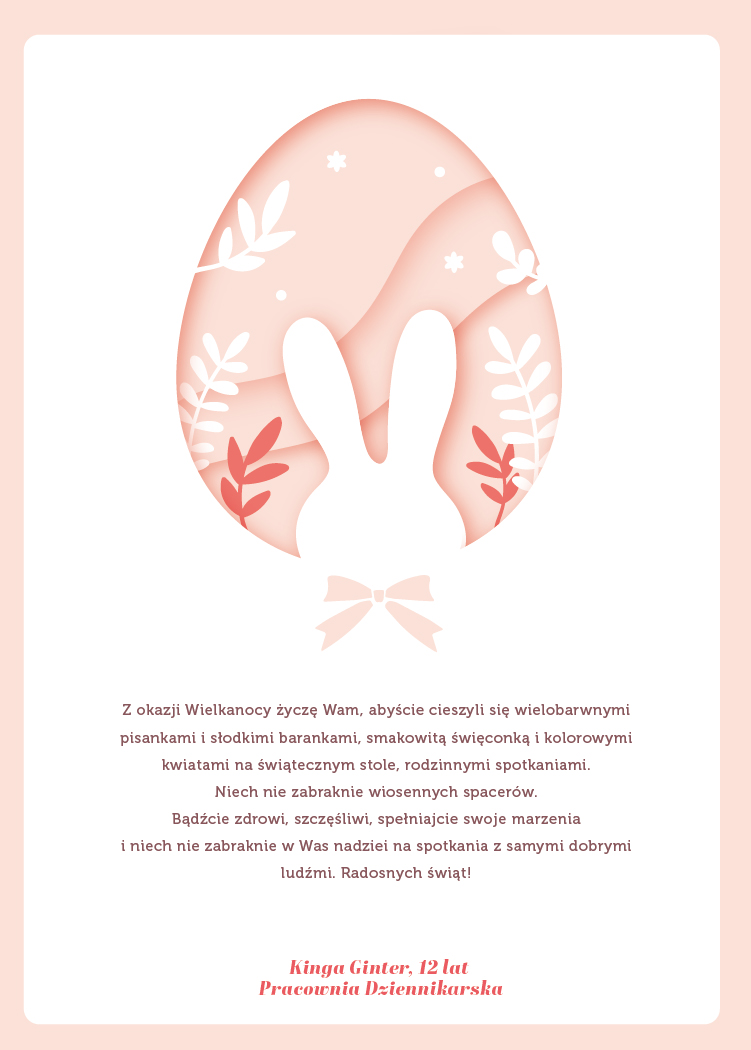 W związku z nadchodzącymi świętami Wielkiej Nocy, jak co roku, życzę Wam dużo szczęścia, uśmiechu i radośnie spędzonego czasu z rodziną. Jest to jedna z niewielu okazji, kiedy wszyscy mogą zebrać się przy jednym stole, więc wykorzystajcie to. Rodzeństwo, rodzice, dziadkowie… Jakby nie patrzeć, to z nimi mamy najsilniejszą więź i pod żadnym pozorem nie należy jej zaniedbywać. Mam nadzieję, że pogoda nam wszystkim dopisze i nareszcie będziemy mogli cieszyć się ciepłą i kolorową wiosną. Możecie poszukać zajączka z młodszymi lub pomóc starszym w przygotowywaniu uroczystego śniadania. I nie zapominajcie, że te święta to czas nadziei. Niech nigdy Was nie opuszcza. Spokojnej, rodzinnej Wielkanocy!