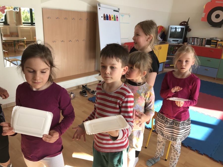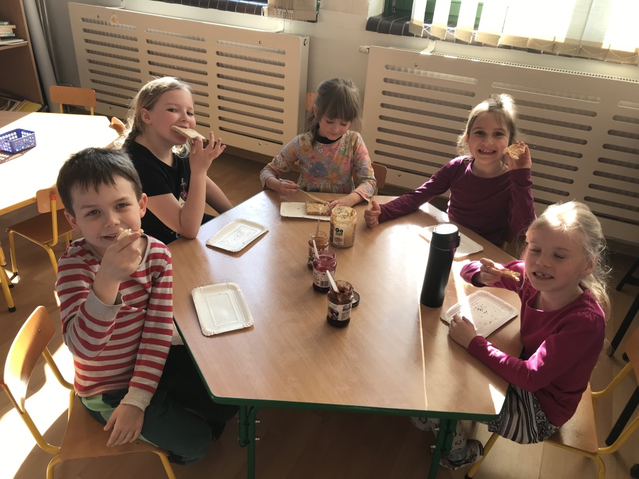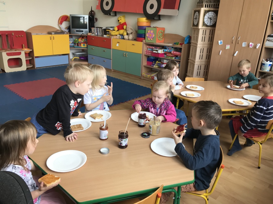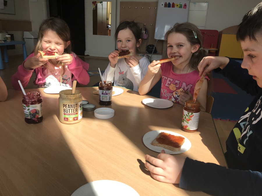 W trakcie spotkania nauczyły się nowych słówek i piosenki, a także zrobiły tosty z masłem orzechowym i dżemem. Były pyszne!