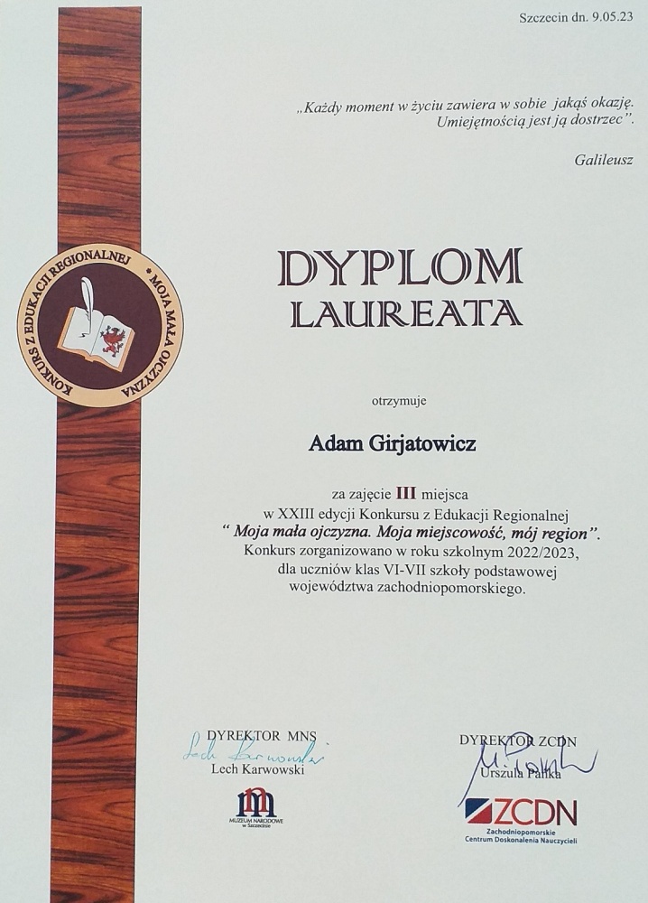9 maja 2023 r. w Muzeum Narodowym w Szczecinie odbyła się uroczystość wręczenia nagród w XXIII edycji konkursu z edukacji regionalnej Moja mała ojczyzna. Moja miejscowość, mój region.