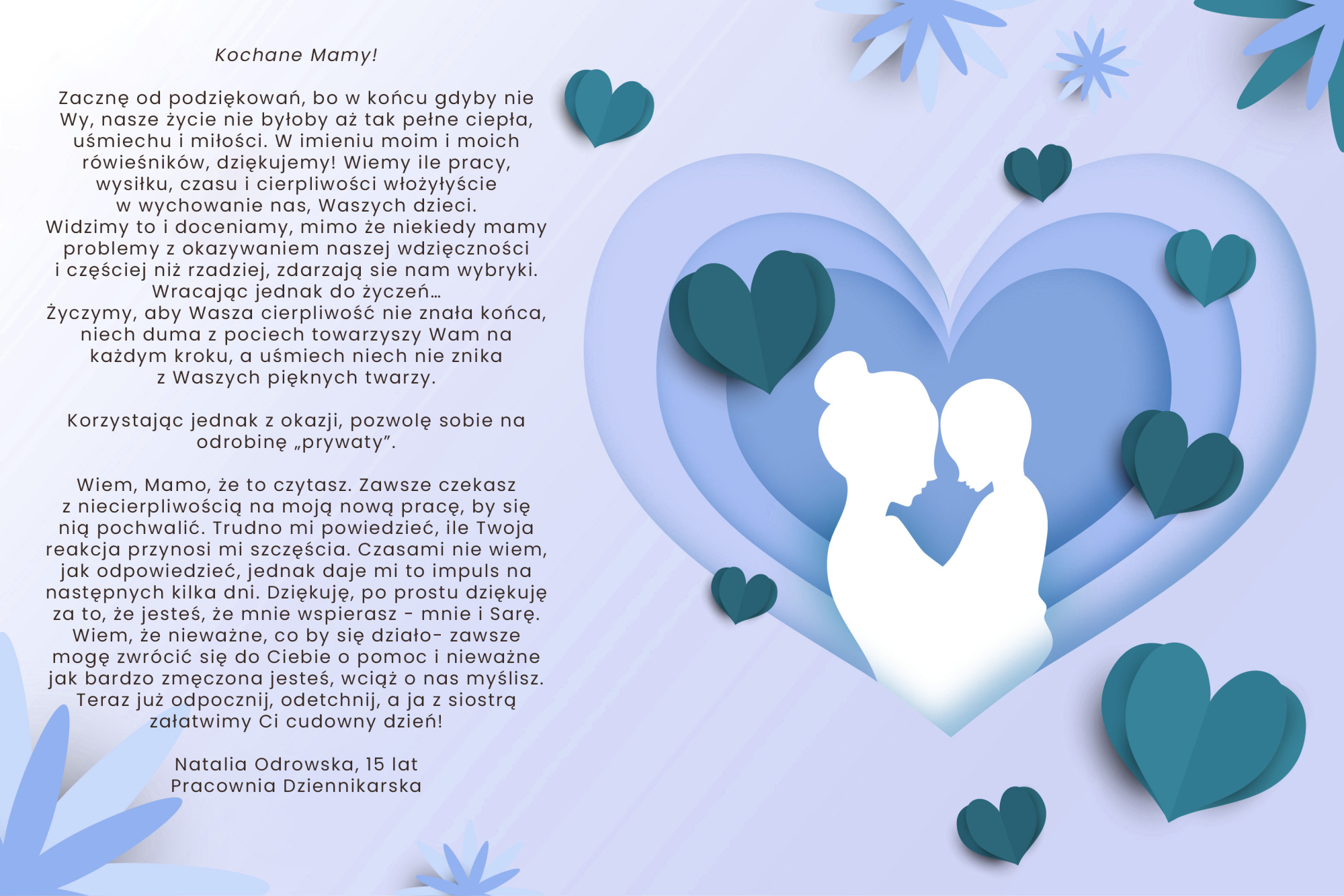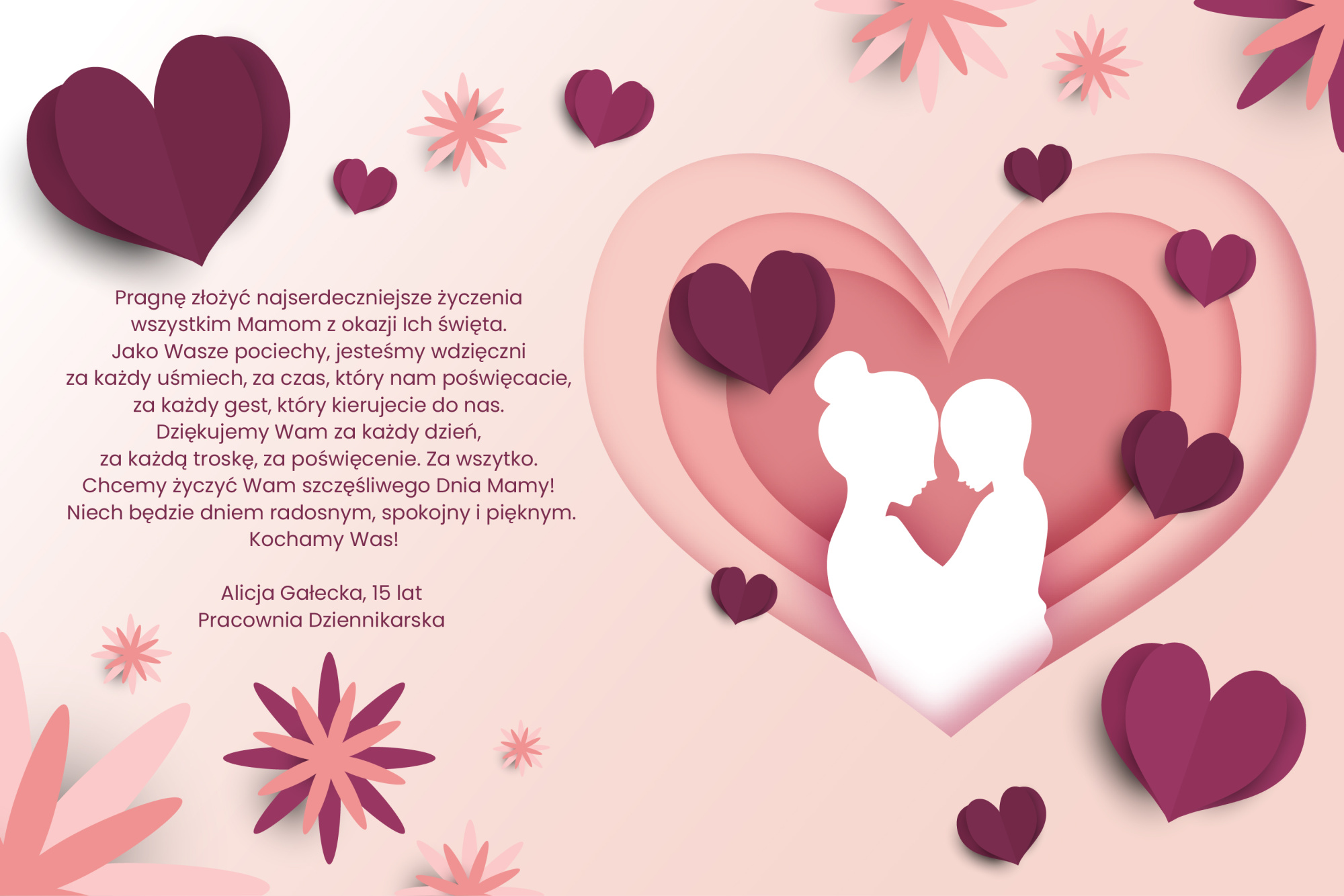Pracownia Dziennikarska dla wszystkich Mam Pałac Młodzieży Opublikowano w 26 maja, 2023 o 14:45 przez Dział Organizacyjny - Iwona26 maja, 2023 o 14:45 Dziś w Dniu Mamy, Pracownia Dziennikarska Pałacu Młodzieży przekazuje wszystkim Mamom, Mamuśkom, Matulkom ciepłe słowa i życzenia.